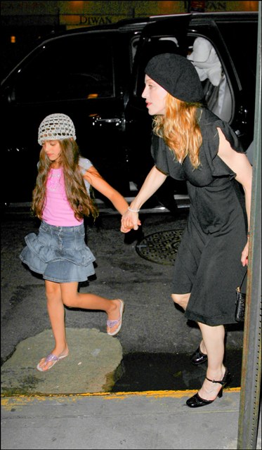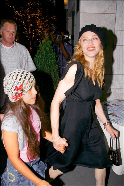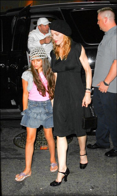 Lourdes kills me. Check out the attitude. The way she holds her chin. Who else but Madonna’s kid? Who else could wear that little cap with such aplomb? Lola is a great example of my Celebrity Baby Theory at work. When you break it down, Madonna falls somewhere between Average and Above Average. Goodlooking but not breathtaking. Carlos is the same. Average looks enhanced by a pretty great body. Put ‘em both together and you get Average + Average = HOT. Lourdes Maria Ciccone Leon – a beauty blossoming before our very eyes. The hair, I LOVE the hair, the ballerina body, the wonderful olive complexion, and of course the NOSE. I covet her nose!!! I’m telling you, gossips…this girl is going to break hearts. And since playing cupid for celebrity offspring is one of my favourite pastimes, what do you think of Lourdes and Connor Cruise? Photos from Saving Face