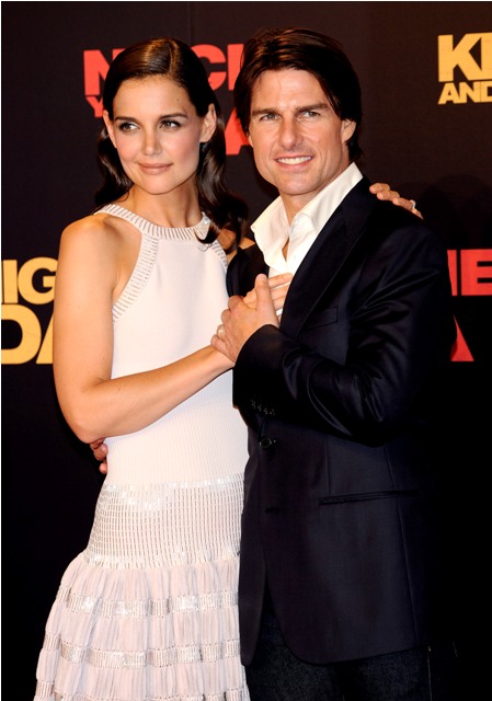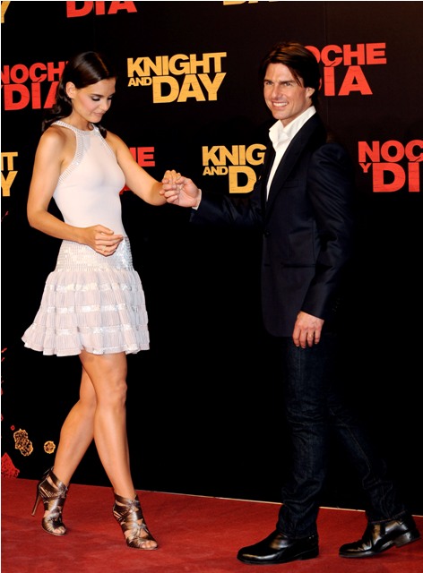 White dress, skinny jeans, this was the Cruise attire last night on the red carpet in Spain for the premiere of Knight & Day. Am trying very hard to say good things, want very badly for Knight & Day to be a success. But it’s really hard when there’s not much to work with. Cameron Diaz’s amazing legs only go so far. And when Katie Holmes chooses an unflattering dress that cuts her off in the wrong places, well, I am not unforgiving to begin with and this is just too tempting. Especially since they’ve decided to revive The Presentation!