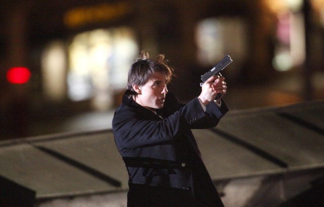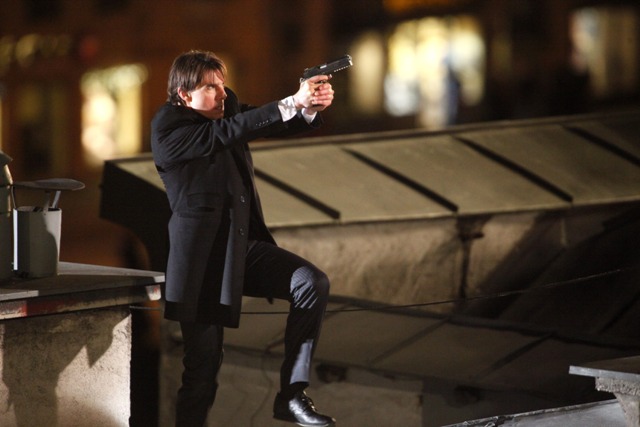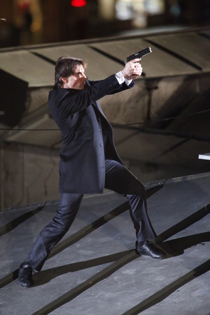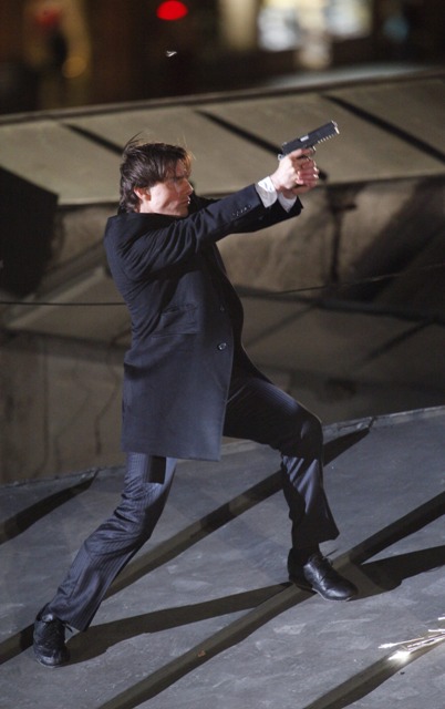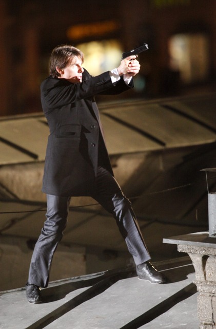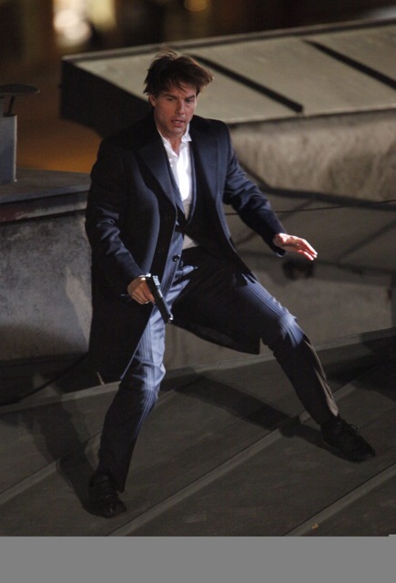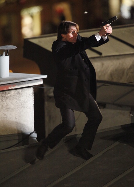 So anyway, Tom Cruise is currently in Austria continuing to work on Knight & Day with Cameron Diaz. They gave him a gun and he’s running after the bad guys in his… high heel wedges?