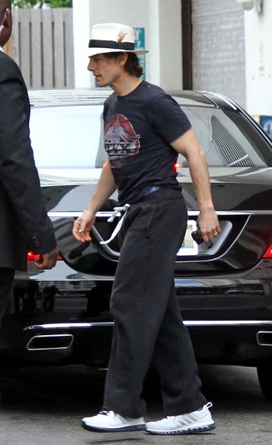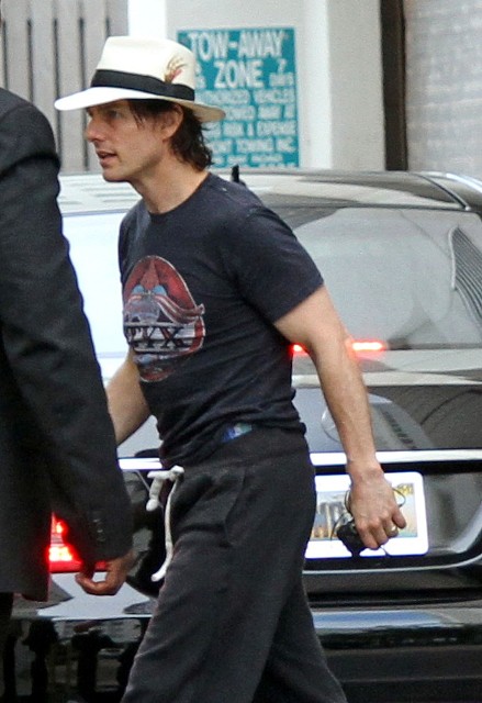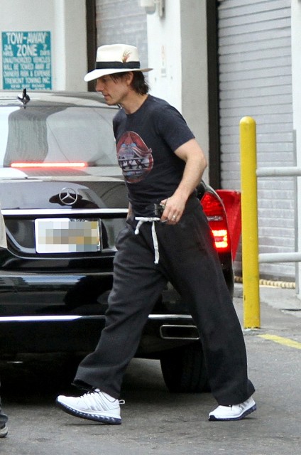 Check out Tom leaving rehearsal the other day in a jaunty little feathered trilby, his hair all long and wet from the exertion, and, um, his sweat pants pulled up to his chest…to make his legs seem longer? Maybe it was a style tip he picked up from his wife who has been known to go Gumby now and again and call it “high fashion”. Click here if you don’t remember.