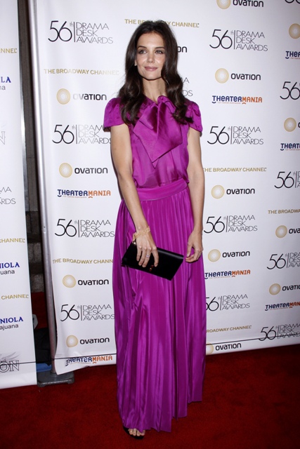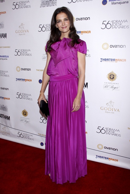 Speaking of the Katie Holmes style sensibility, she was in New York last night to present at the Drama Desk Awards wearing something I can only presume is her own design because… well…look at it. I don’t mind the sleeves on the blouse, but everything else is a $3,000 headache. That much? Yes. She’s peddling her sh-t at those prices. How giant is the WTF bubble coming out of your mouth right now?
