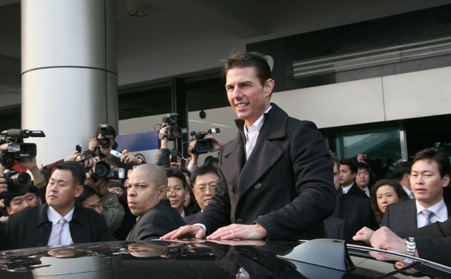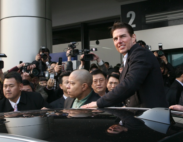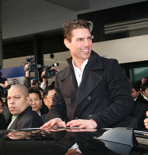 And so Tom Cruise arrived in South Korea today, still promoting Valkyrie, almost a modest success in the US, now he’s hoping Hello Kitty will put his film over the top, boost the international numbers. And they went batsh-t for him at the airport. As you can see, he loved every minute, mostly because he’s finally the taller among the men, and also because there’s nothing in the world like the ego-stroking you can find in Asia.