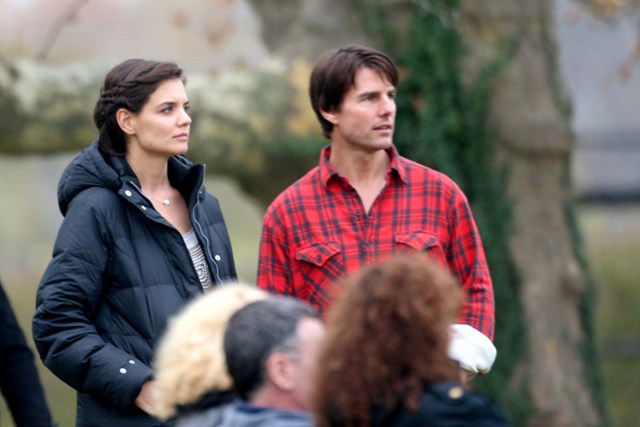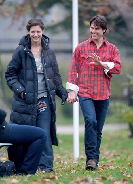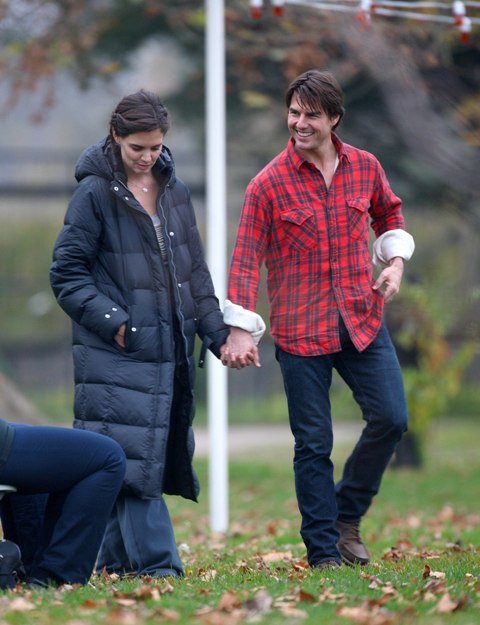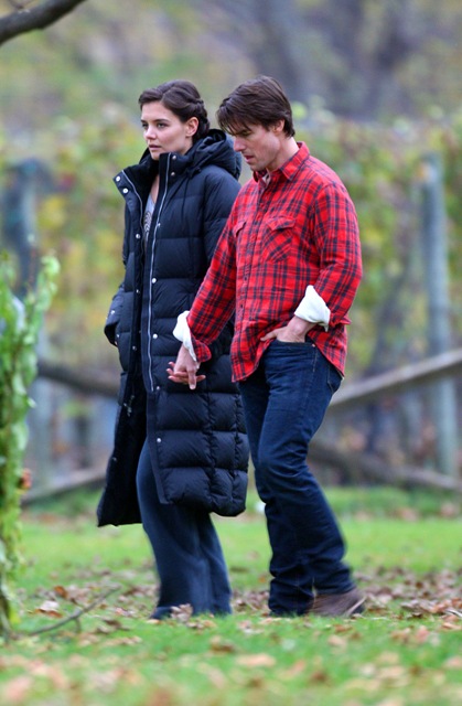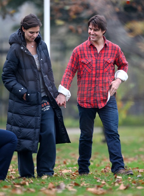 He flew in to see Katie Holmes in New York. Showed up on set today to visit her, and the paps too, wearing plaid and a big smile. Of course. He looks good. Because I can’t see his tits.