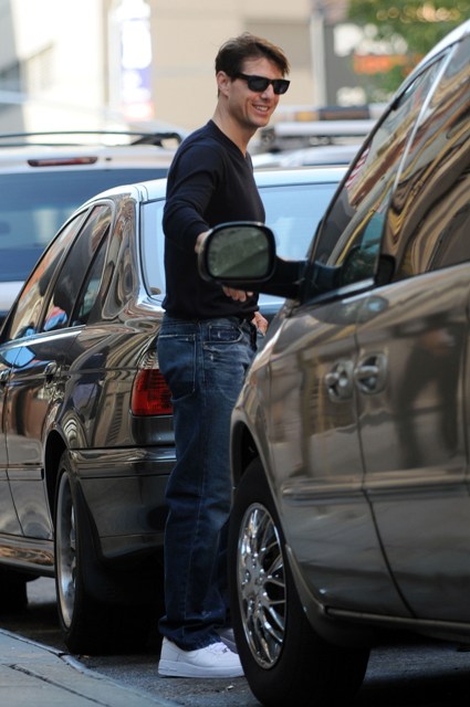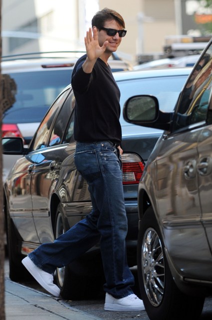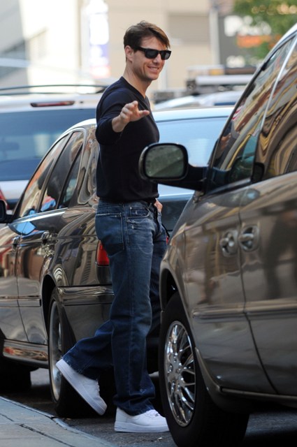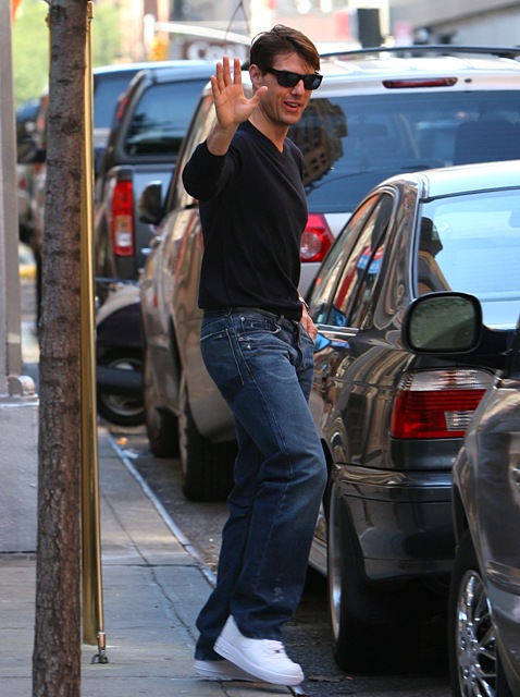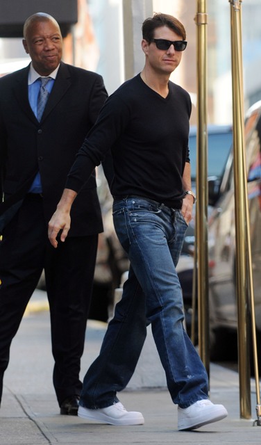 How much do you love it that he busted them out in New York City? Check it out – Tom Cruise out and about in his signature white wedges borrowed from Victoria Beckham, in pristine condition, getting a little lift, an extra inch or two to pad his diminutive 5 ft 6… on a good day. But f&ck they look ridiculous. Like the size of his head.