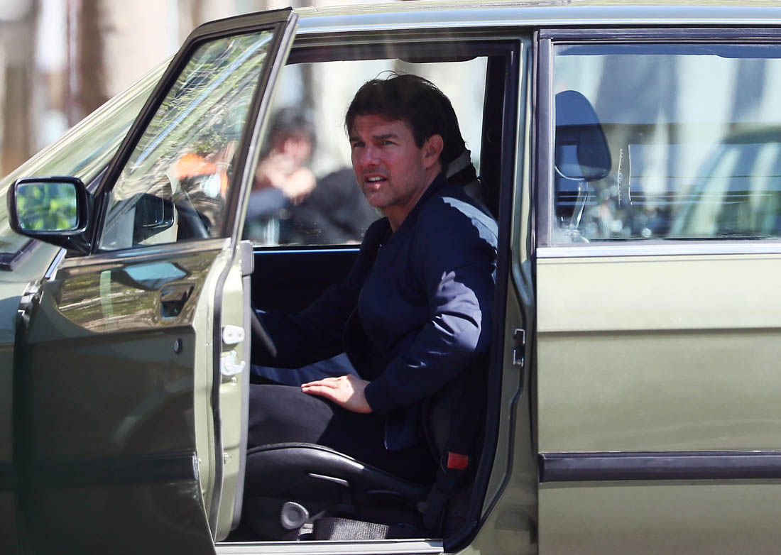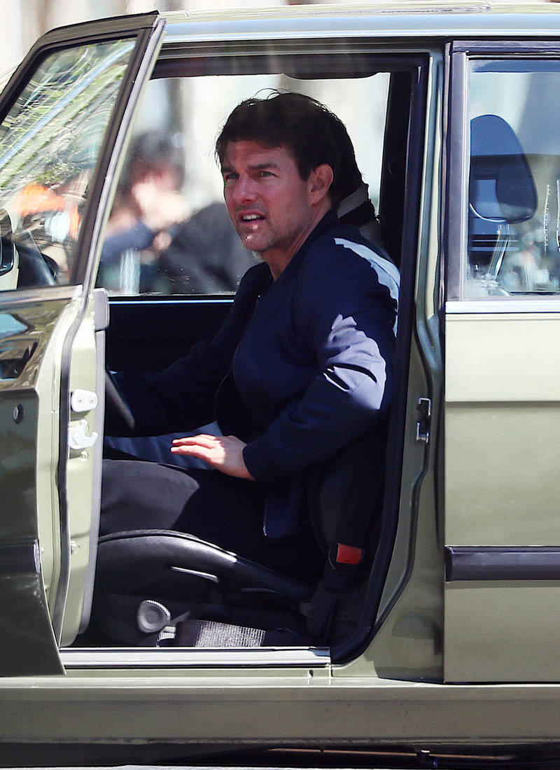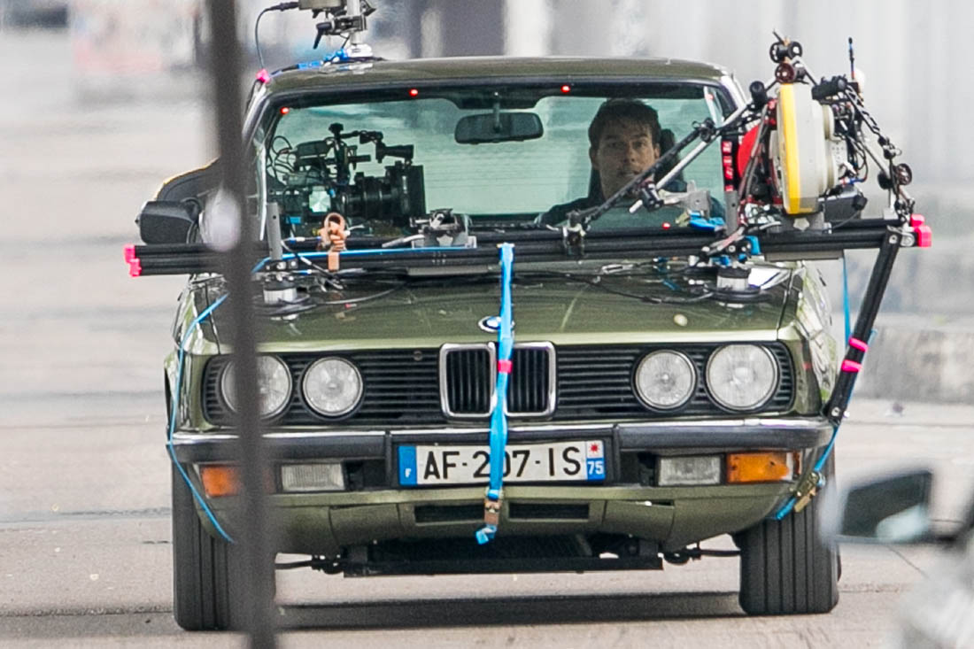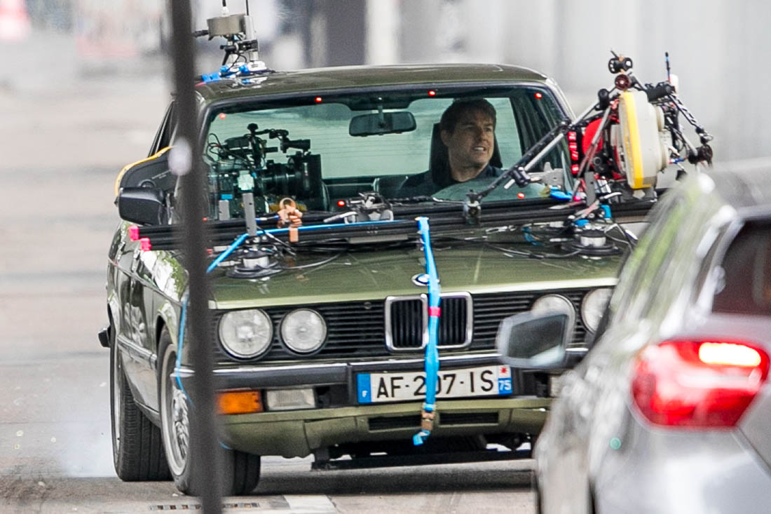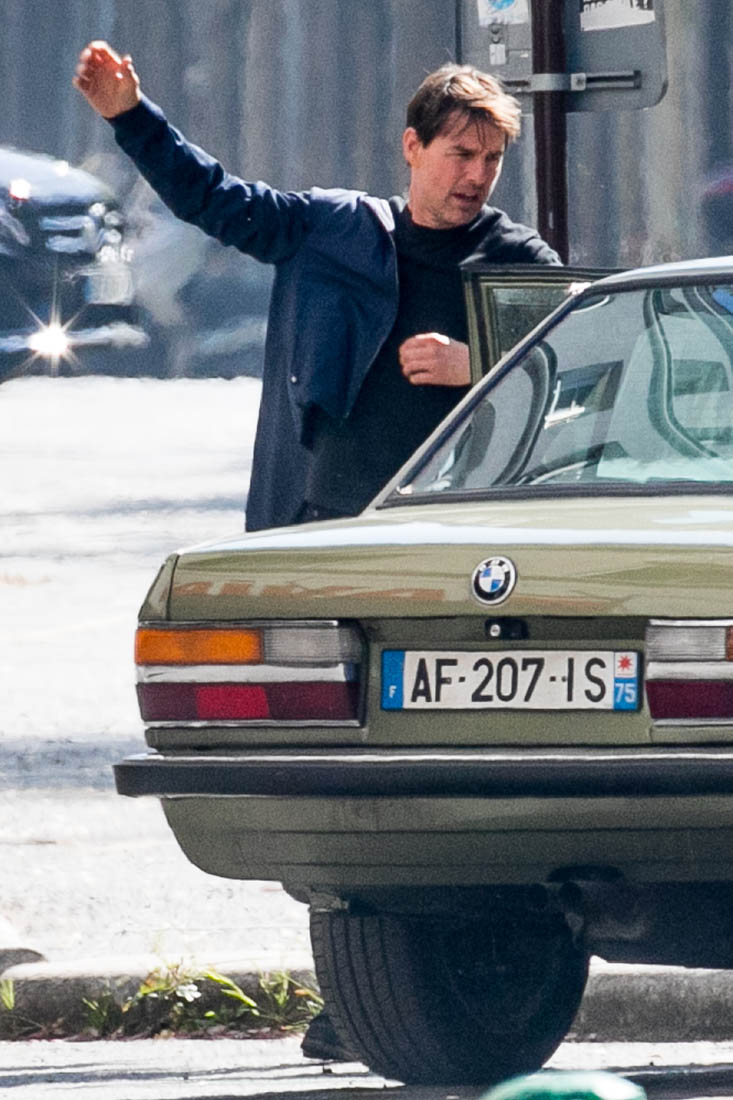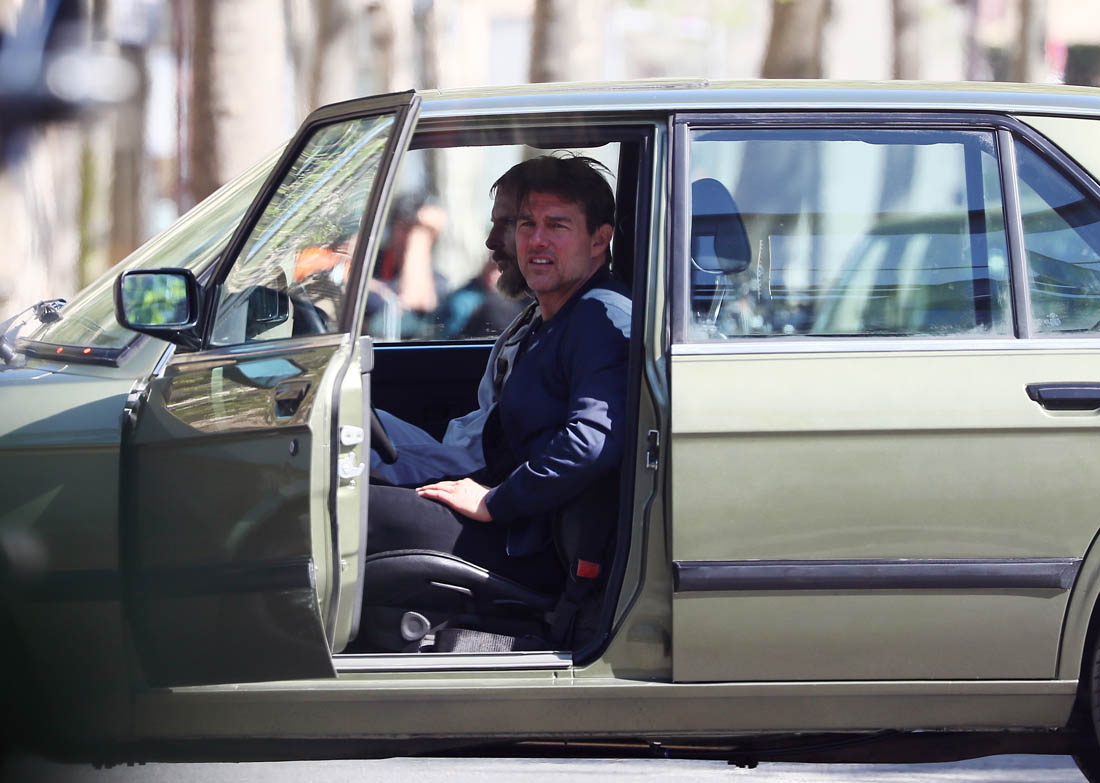 Production is officially underway on Mission: Impossible 6 in Paris. Right now, the working title is “Gemini”. So… are we dealing with twins? Tom Cruise was photographed this weekend on set as they shot a car chase scene with him driving an old BMW. I’m assuming he busted out Sean Harris in the straight jacket and now has to drive really fast to escape whoever it is that’s surely coming after him. This is the perfect opportunity for Tom to put on his famous Intense Face behind the wheel. These shots are pretty low quality but even still, you can see that grimace, you can see that jaw working, and the managed panic in his eyes. It’s the face we’ve watched for 30 years, the face that’s made over a billion dollars at the box office.