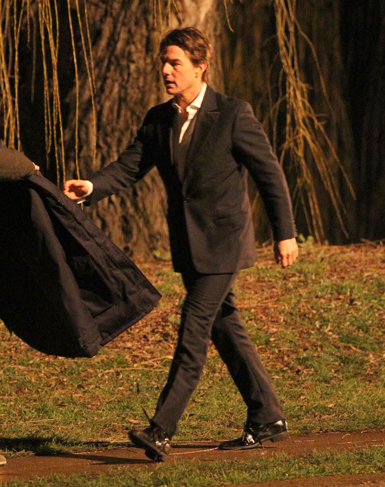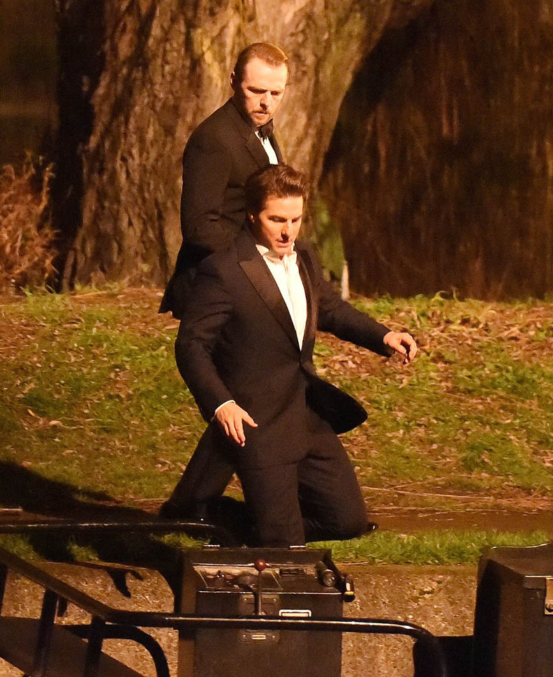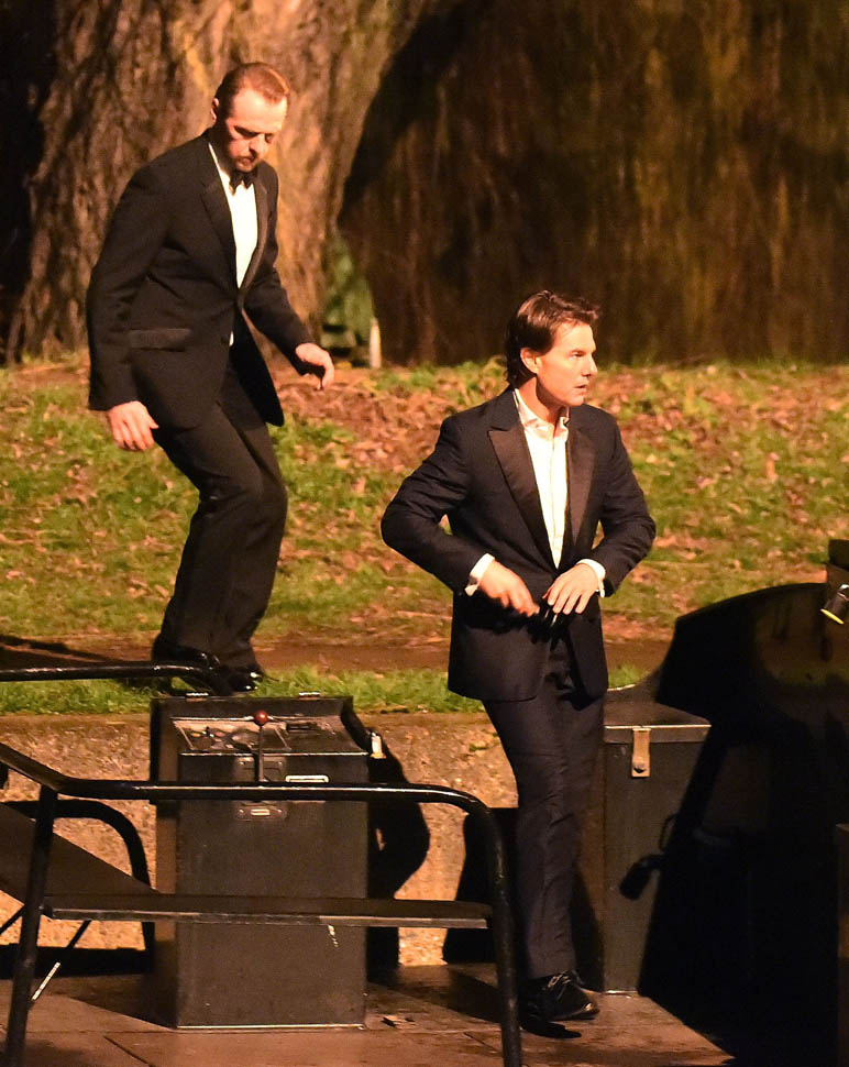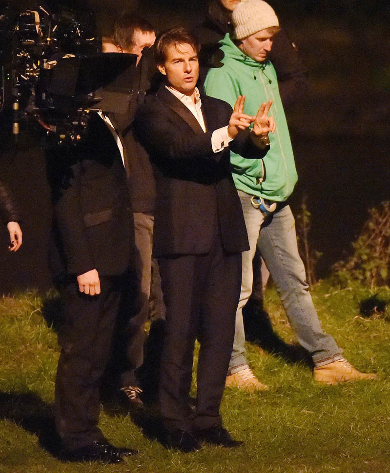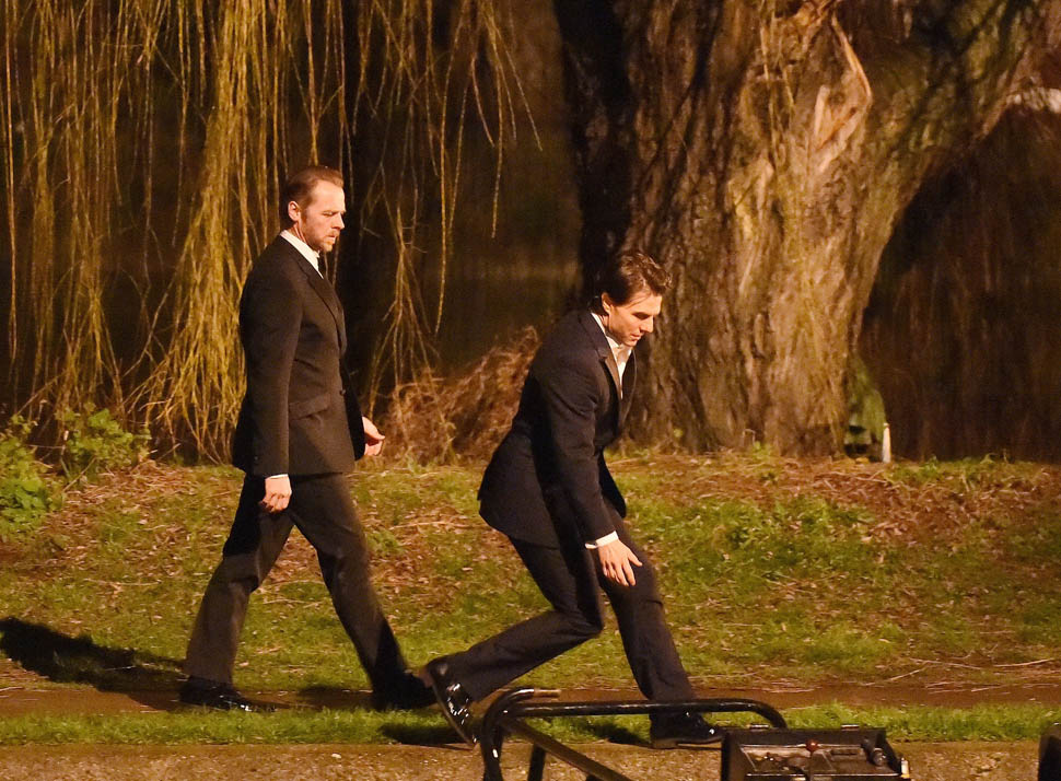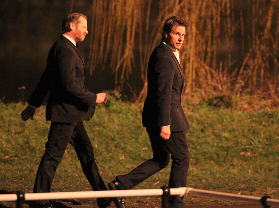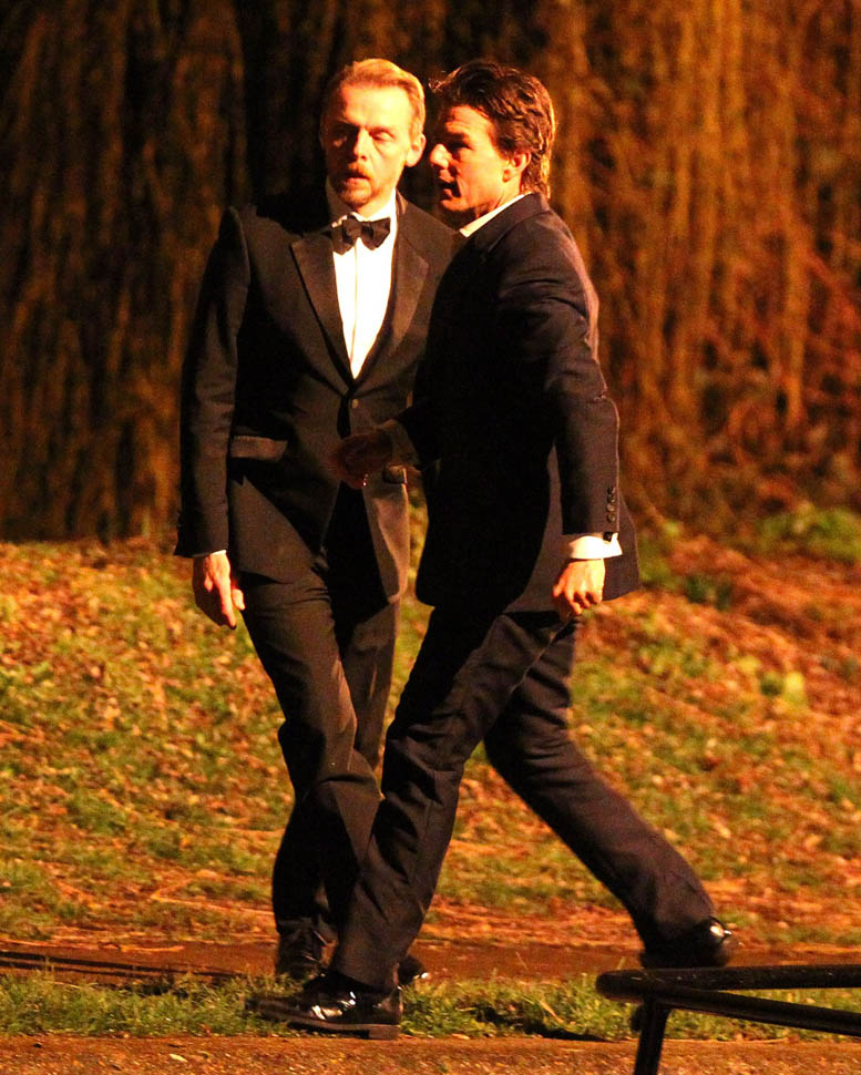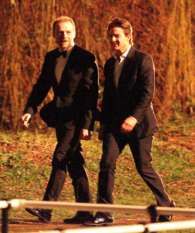 Here’s Tom in London the other day continuing to work on Mission: Impossible 5 with Simon Pegg. Yesterday it was announced that M:I5 will be moved up 5 months to a July 31 release instead of during the holiday 2015 season, likely to get the f-ck out of the way of Star Wars.