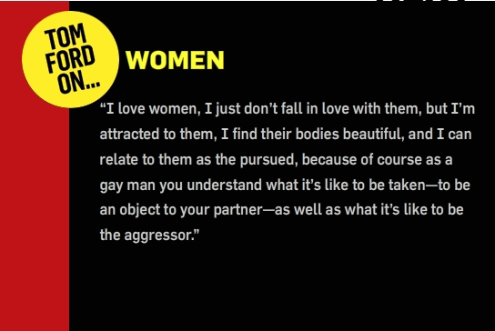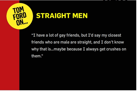 Feast your eyes on Tom, all of him, in Out. His sly arrogance, his pompous attitude, his horny-bitch quotes on women, his horny-bitch quote on straight men, and of course his TOIT ass… Tom Ford is pure heartbreaking quiveration.