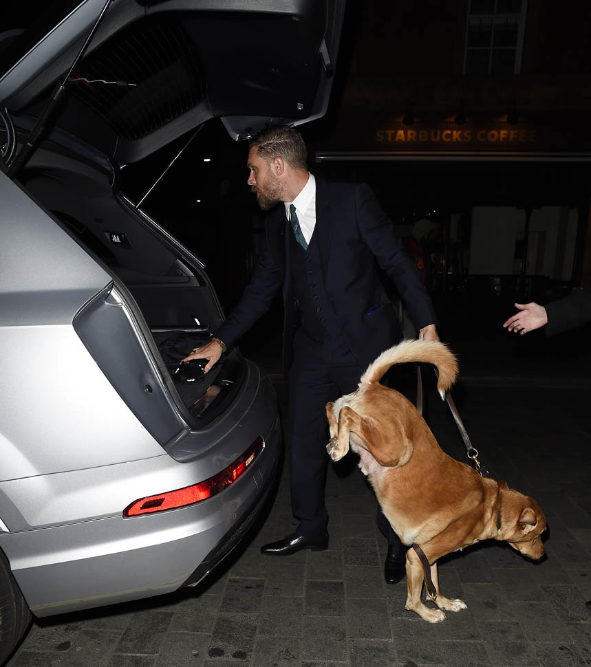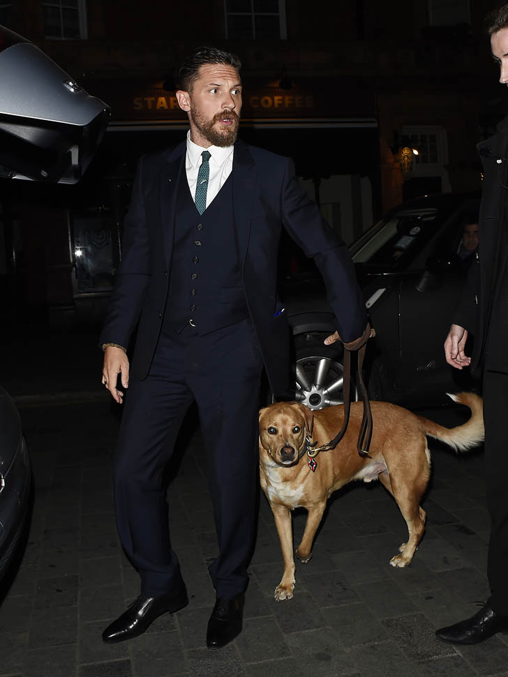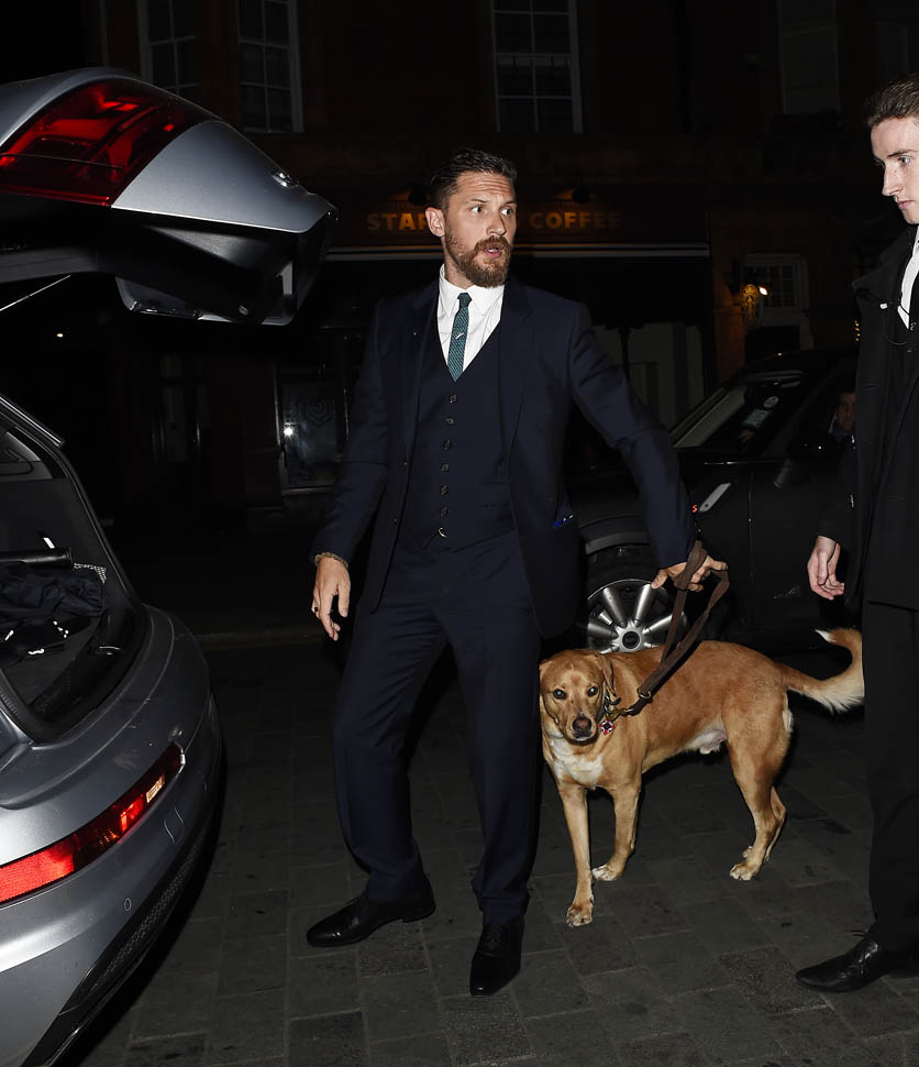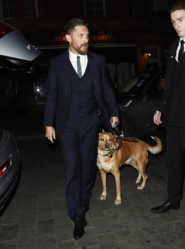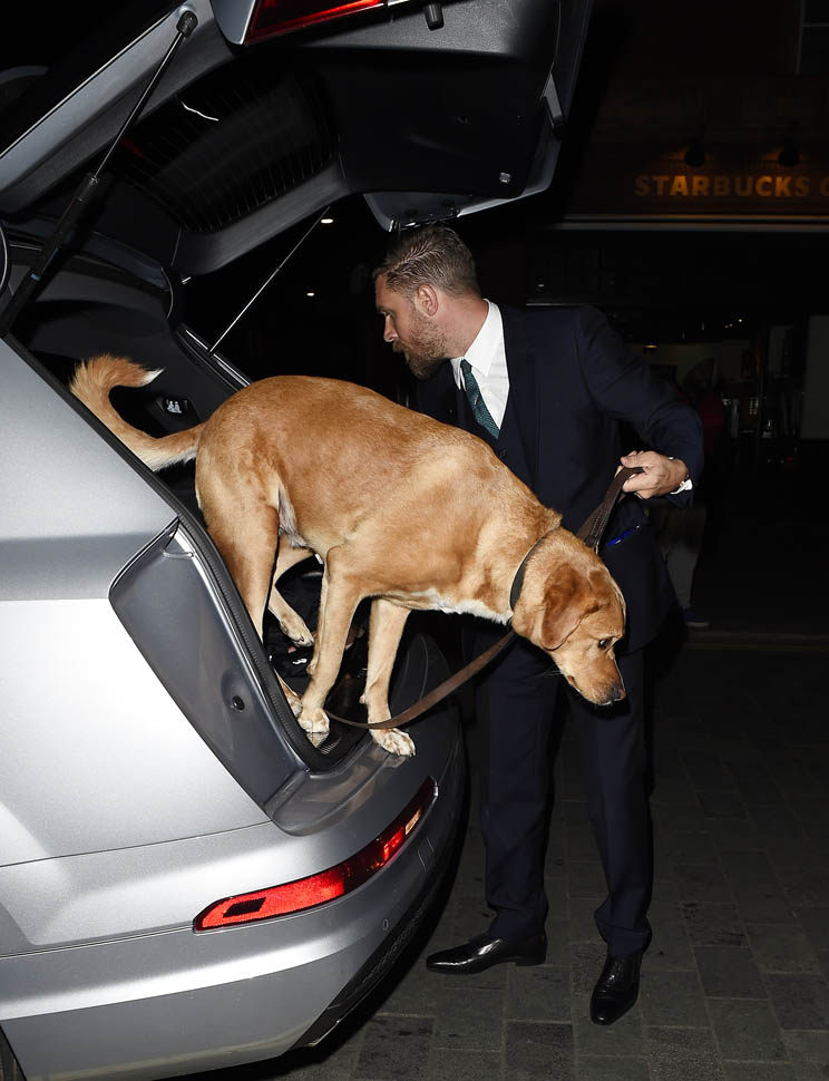 I posted photos of Woody, Tom Hardy’s dog, being a total boss on the carpet in London yesterday at the premiere of Legend. Woody didn’t want to go home after the movie. Woody took a disco nap in the afternoon and made sure he was ready to go to the afterparty. So here he is, arriving at the afterparty, with Tom opening the door to let him out. Because you will not leave Woody at home, not when you get to go have so much fun.