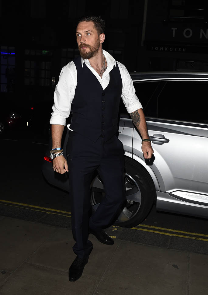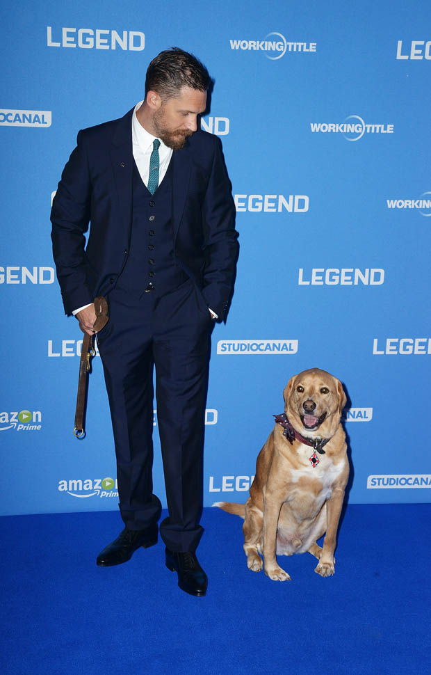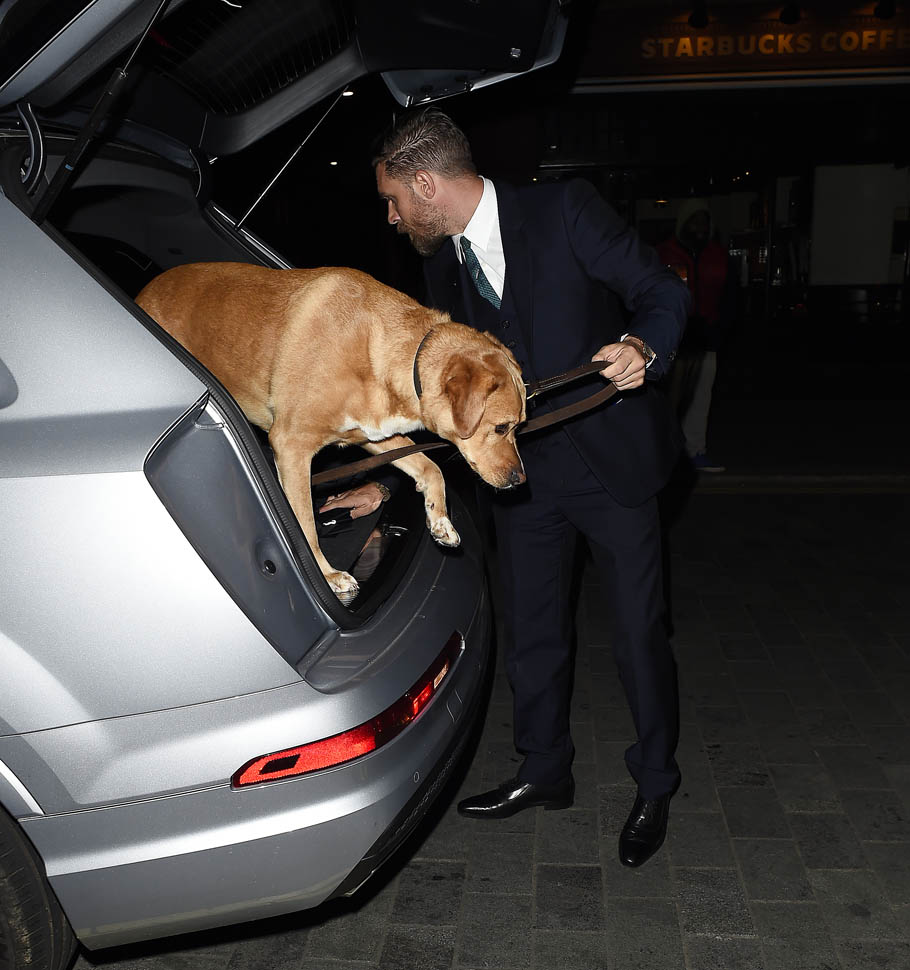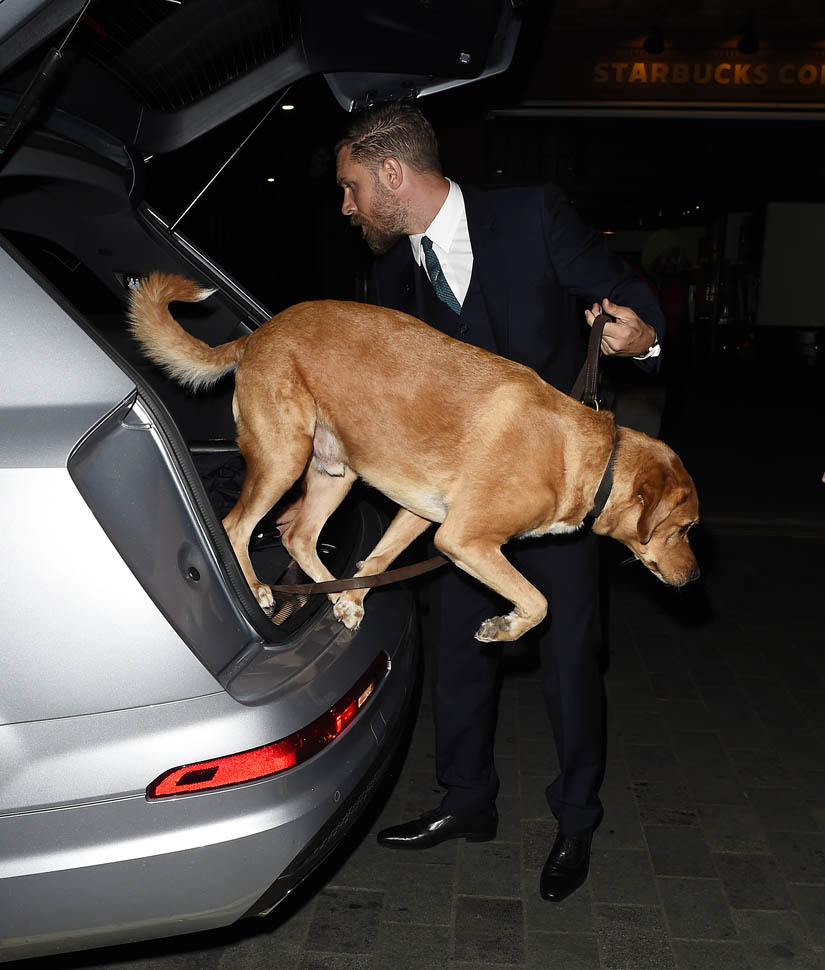 I posted photos of Woody, Tom Hardy’s dog, being a total boss on the carpet in London yesterday at the premiere of Legend. Woody didn’t want to go home after the movie. Woody took a disco nap in the afternoon and made sure he was ready to go to the afterparty. So here he is, arriving at the afterparty, with Tom opening the door to let him out. Because you will not leave Woody at home, not when you get to go have so much fun.