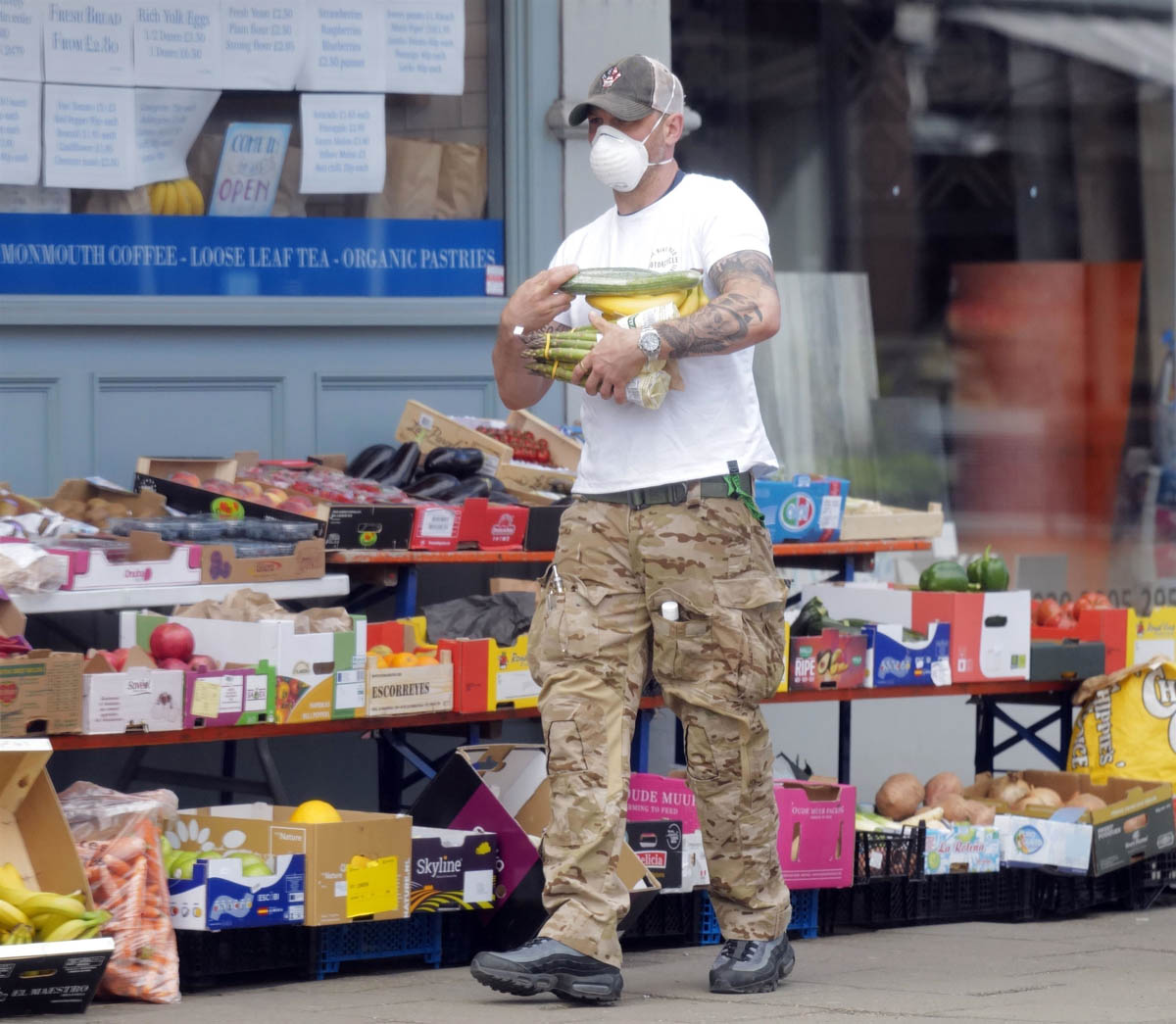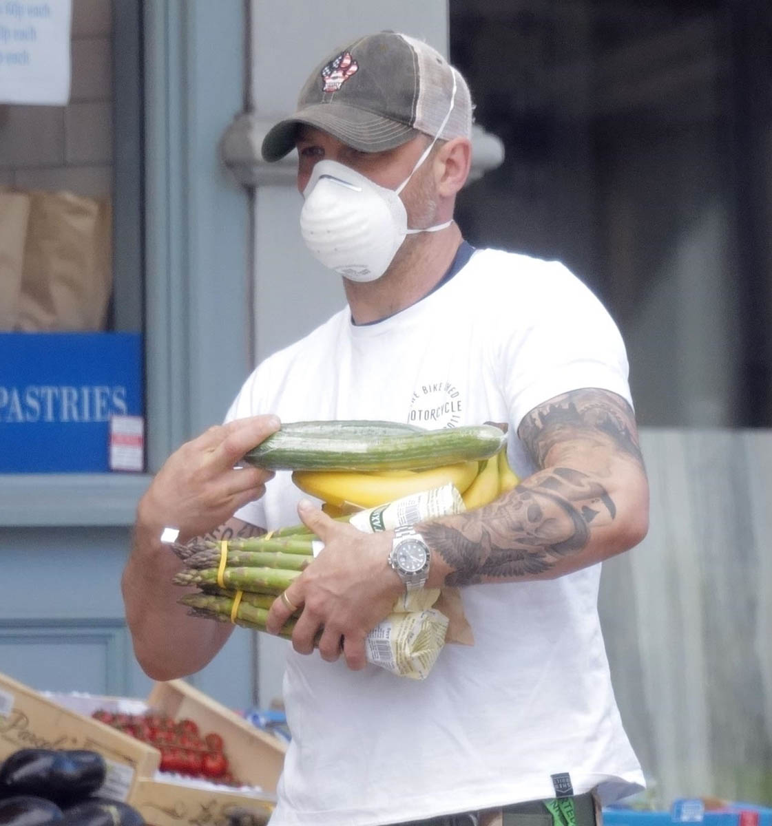 Anyway, here’s Tom with Charlotte Riley picking up groceries this weekend. Bananas, cucumber, and some very thick asparagus. I like a thinner asparagus, personally. You?