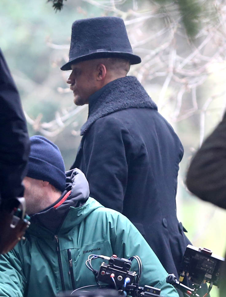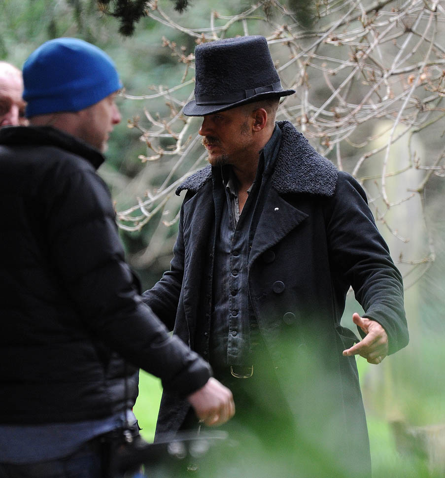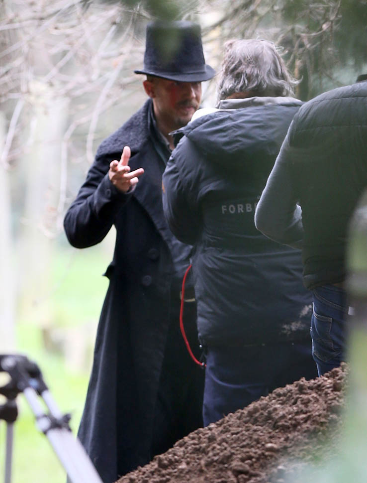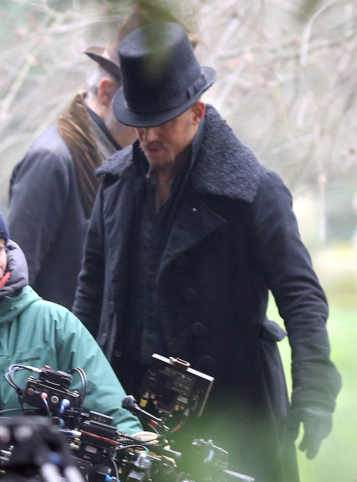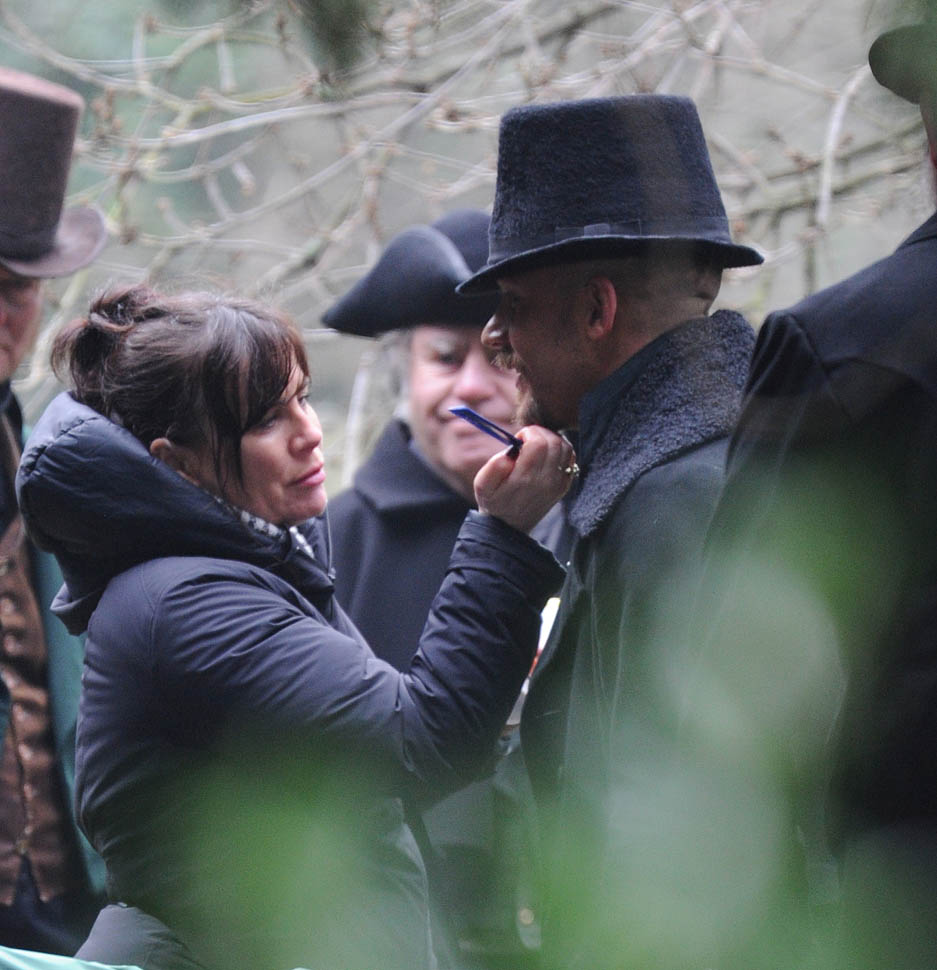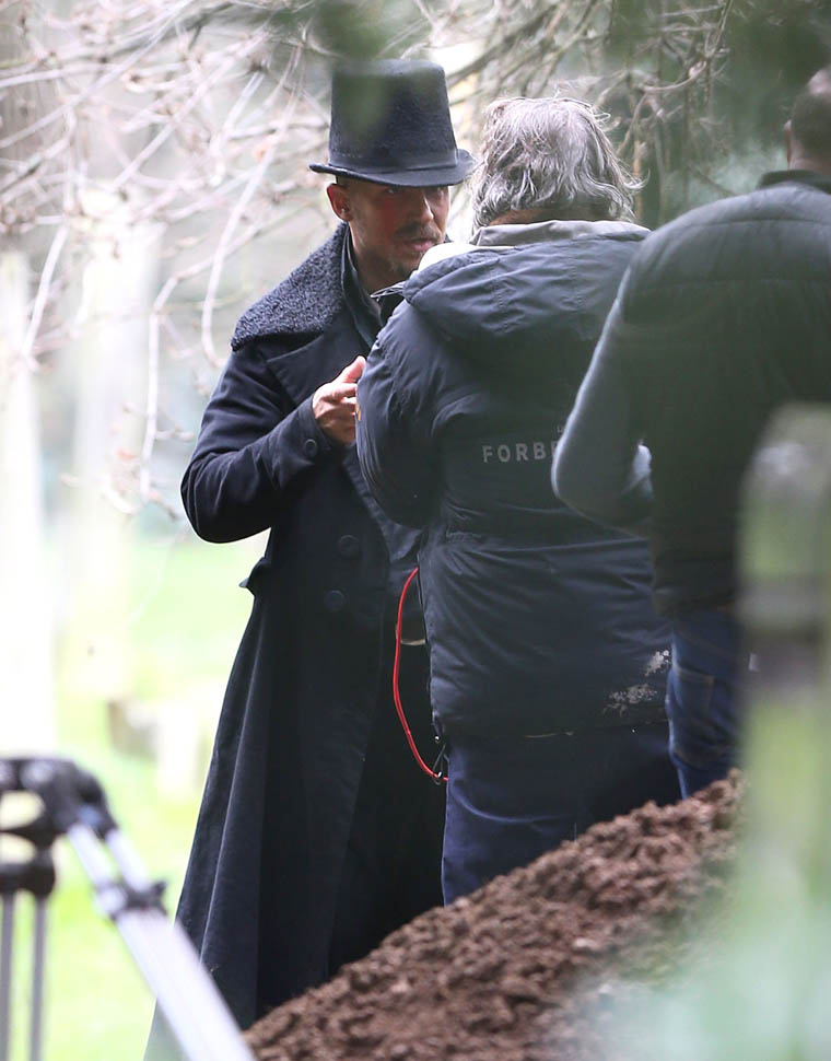 Here he is in England today shooting Taboo. At one point, a makeup artist was seen combing his beard.