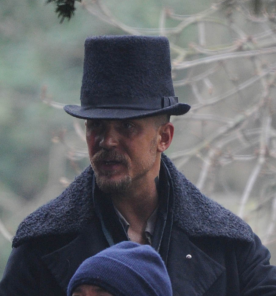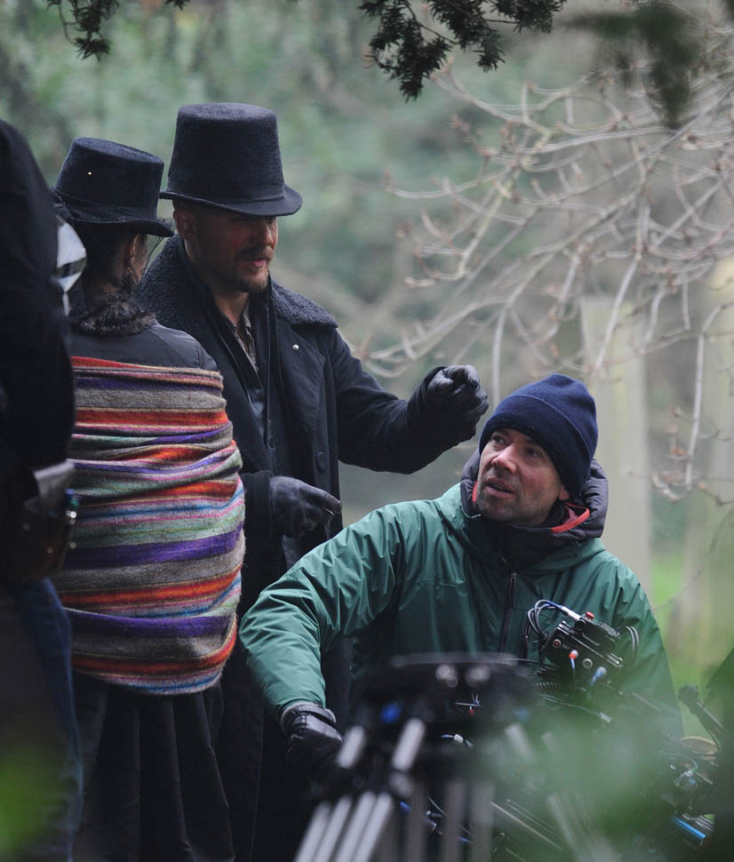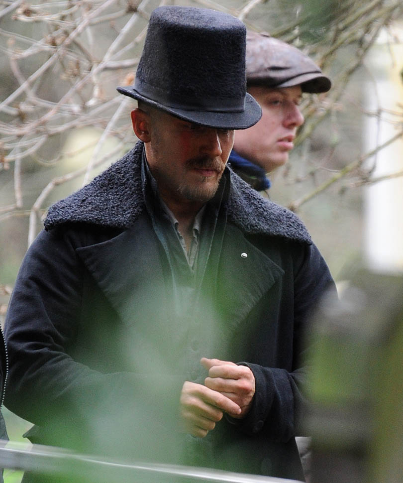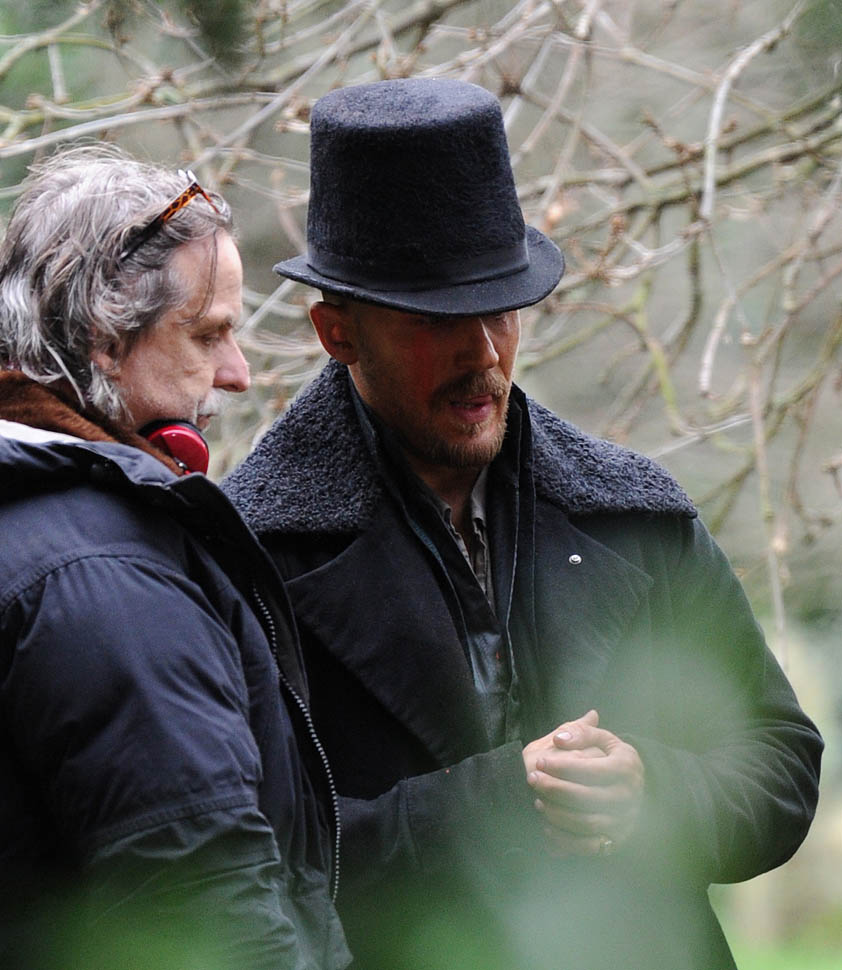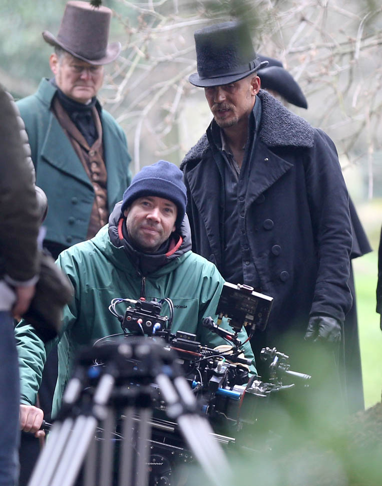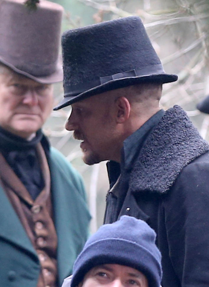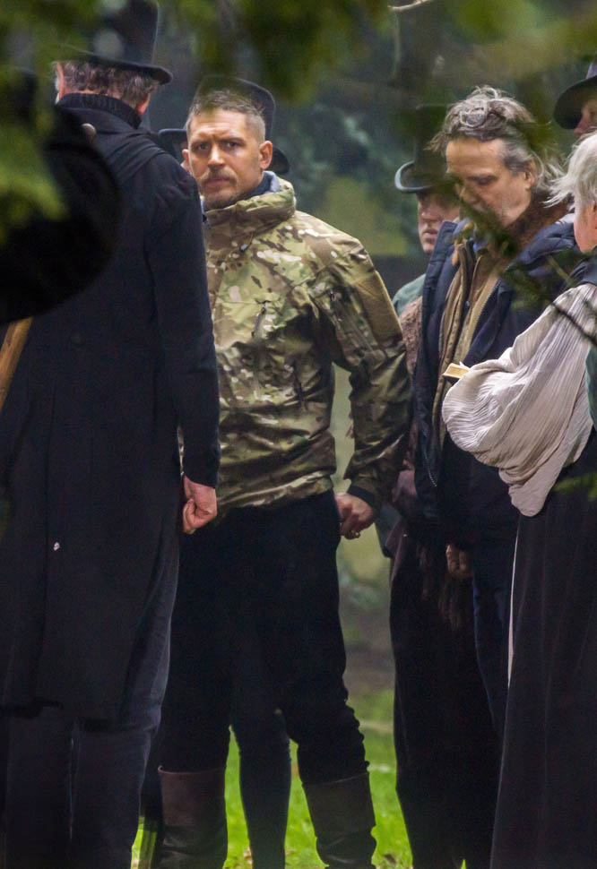 Here he is in England today shooting Taboo. At one point, a makeup artist was seen combing his beard.