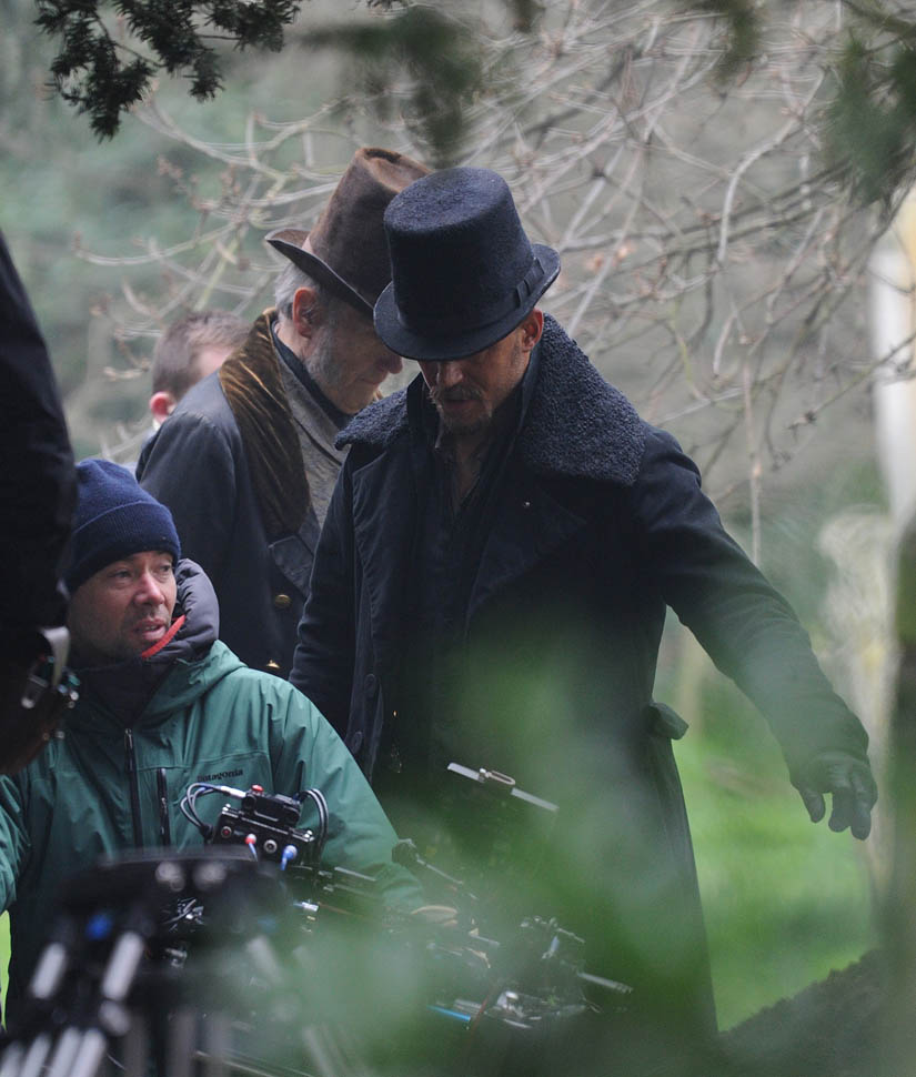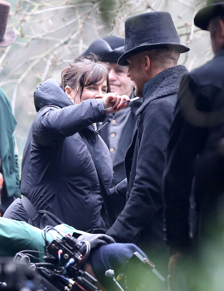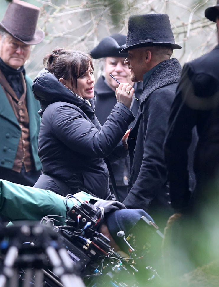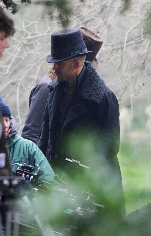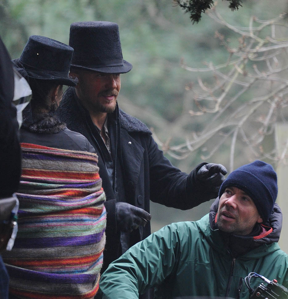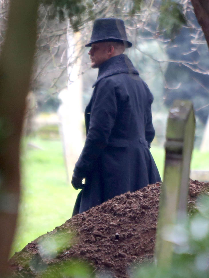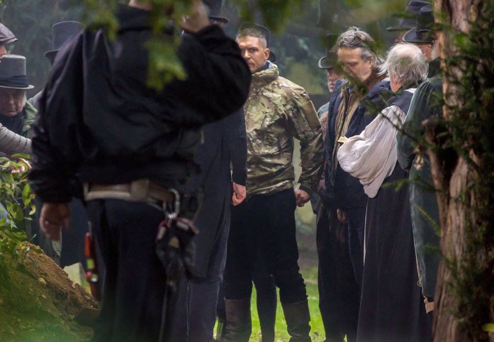 Here he is in England today shooting Taboo. At one point, a makeup artist was seen combing his beard.