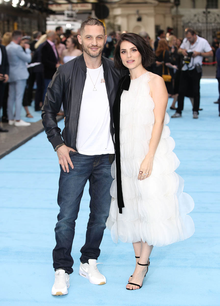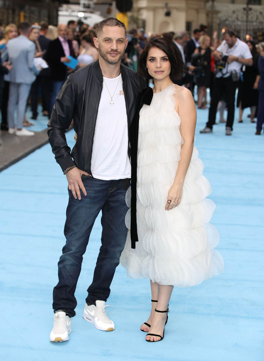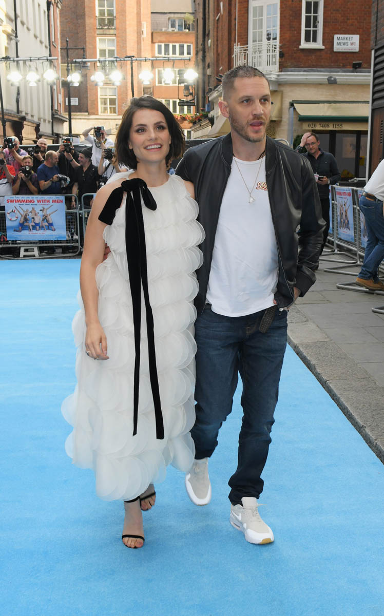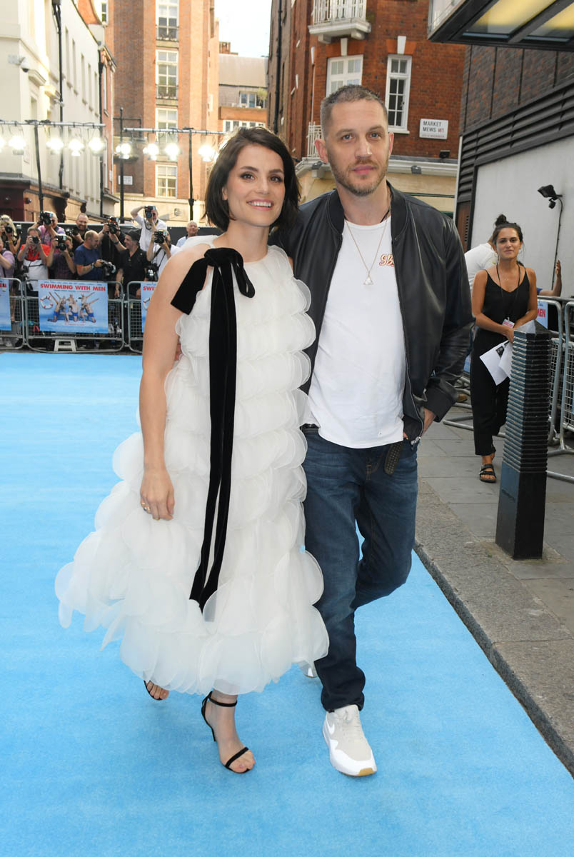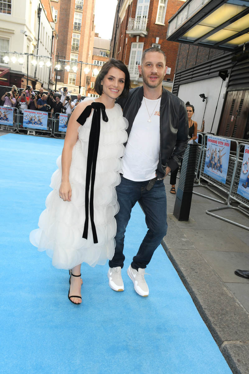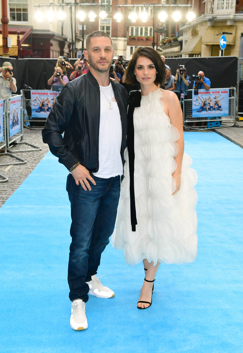 The last time we saw Tom Hardy and Charlotte Riley together was at Prince Harry and Royal Meghan’s wedding in May and he was bald, still working on that Al Capone movie. Tom joined Charlotte last night in London for the premiere of Swimming with Men and the hair has grown back. He looks good. As good as he’s looked in a while and she, holy sh-t, is gorgeous. I quite like her hair too, a little shorter than we’ve seen how she wears it.