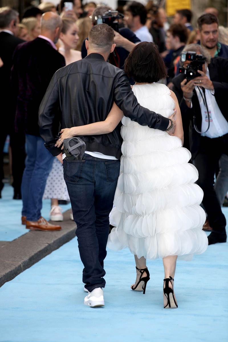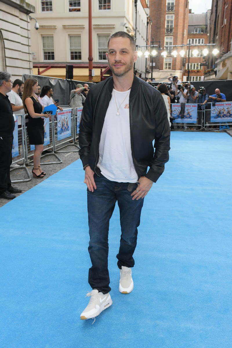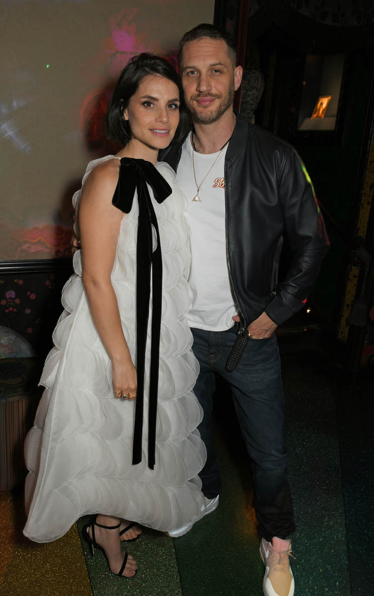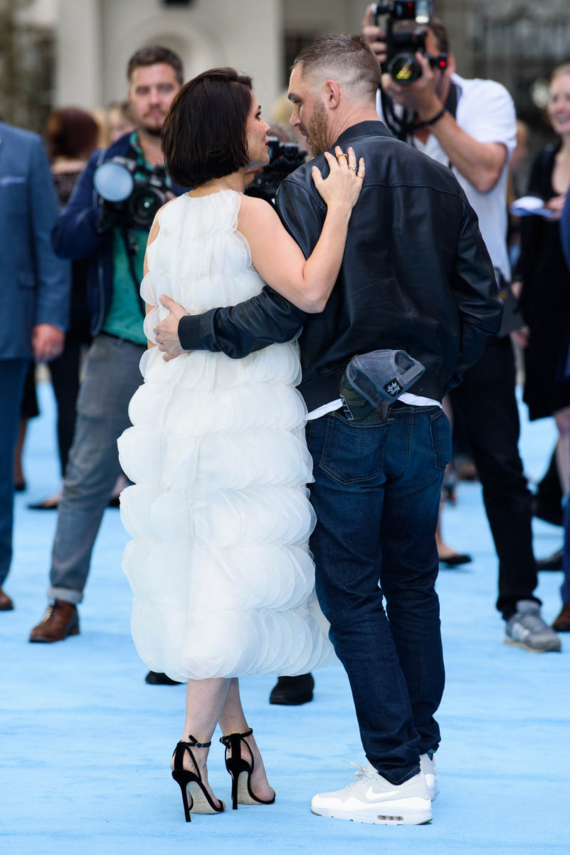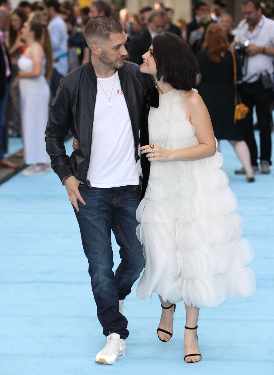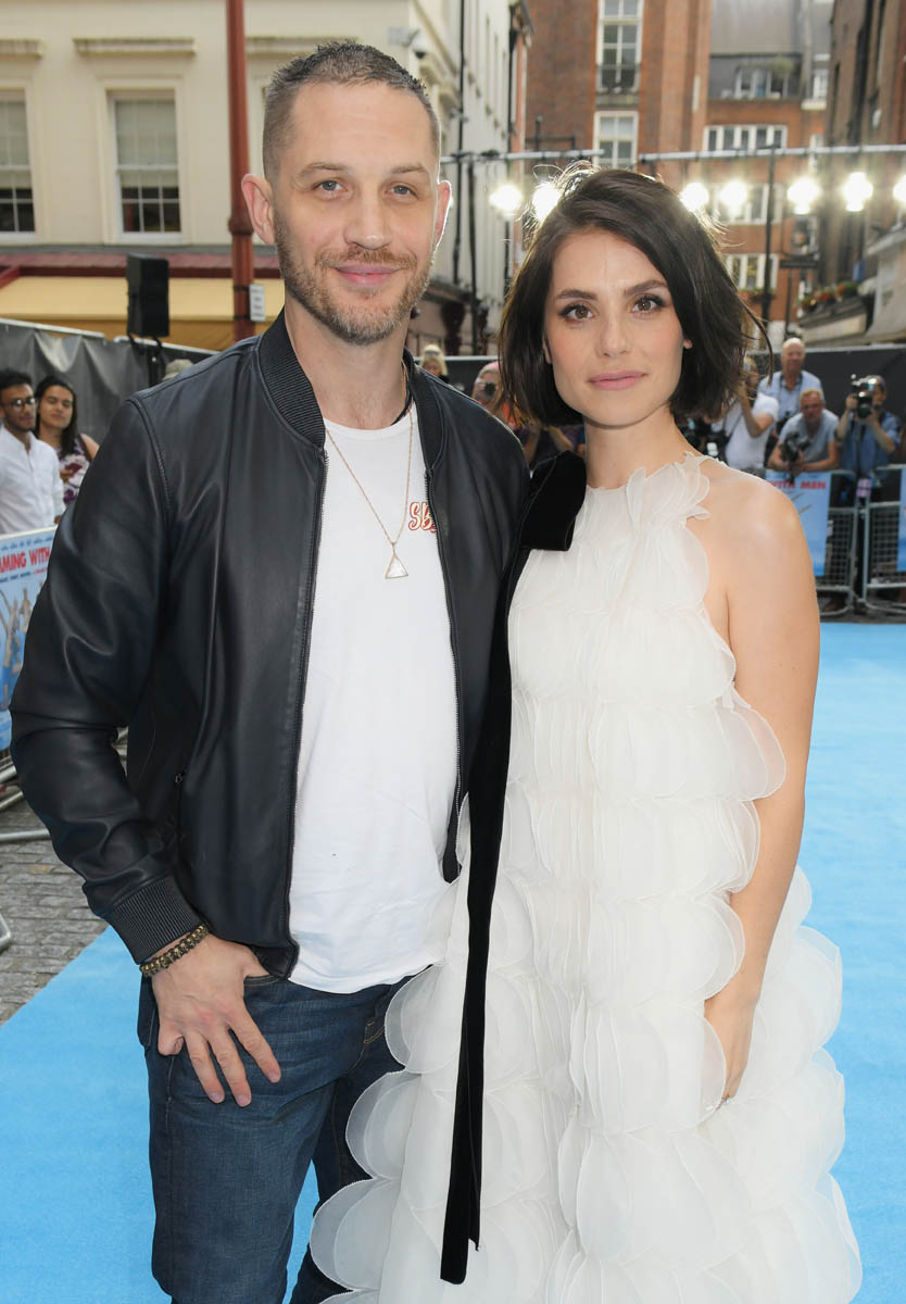 The last time we saw Tom Hardy and Charlotte Riley together was at Prince Harry and Royal Meghan’s wedding in May and he was bald, still working on that Al Capone movie. Tom joined Charlotte last night in London for the premiere of Swimming with Men and the hair has grown back. He looks good. As good as he’s looked in a while and she, holy sh-t, is gorgeous. I quite like her hair too, a little shorter than we’ve seen how she wears it.