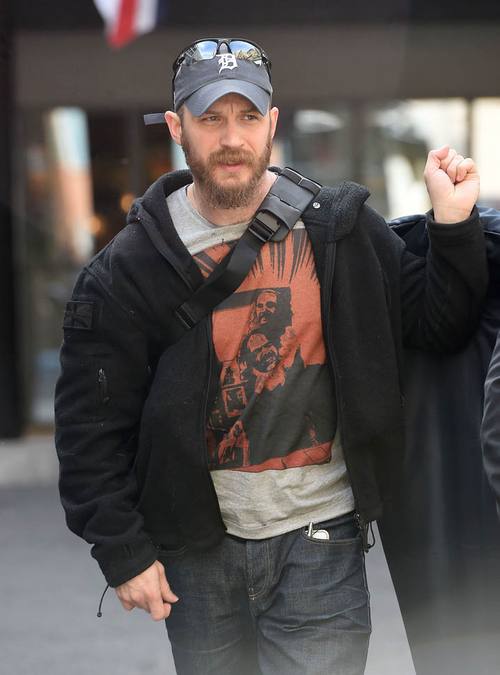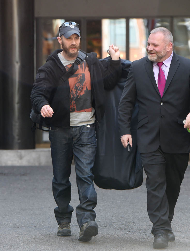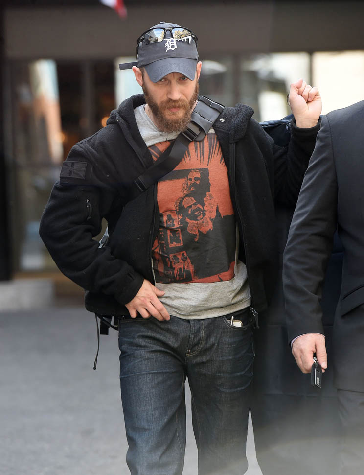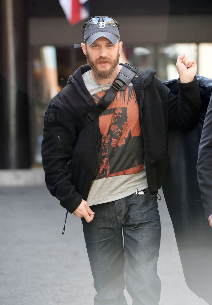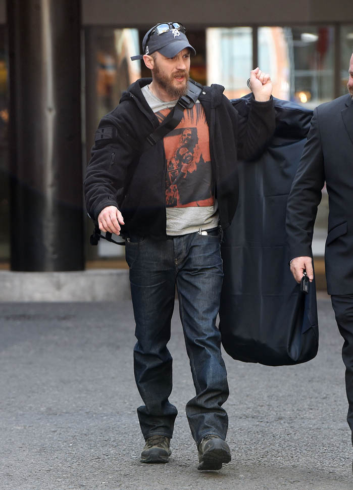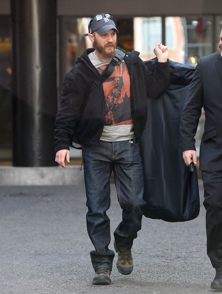 Attached – Hardy leaves his hotel in London on Friday after the Child 44 premiere.