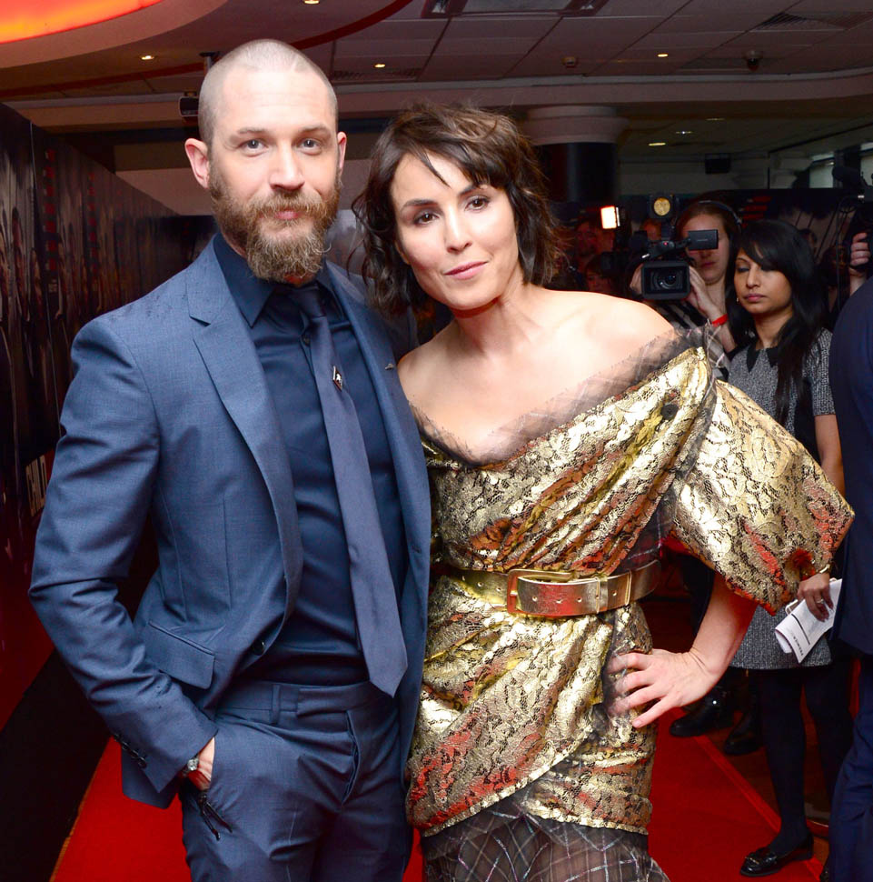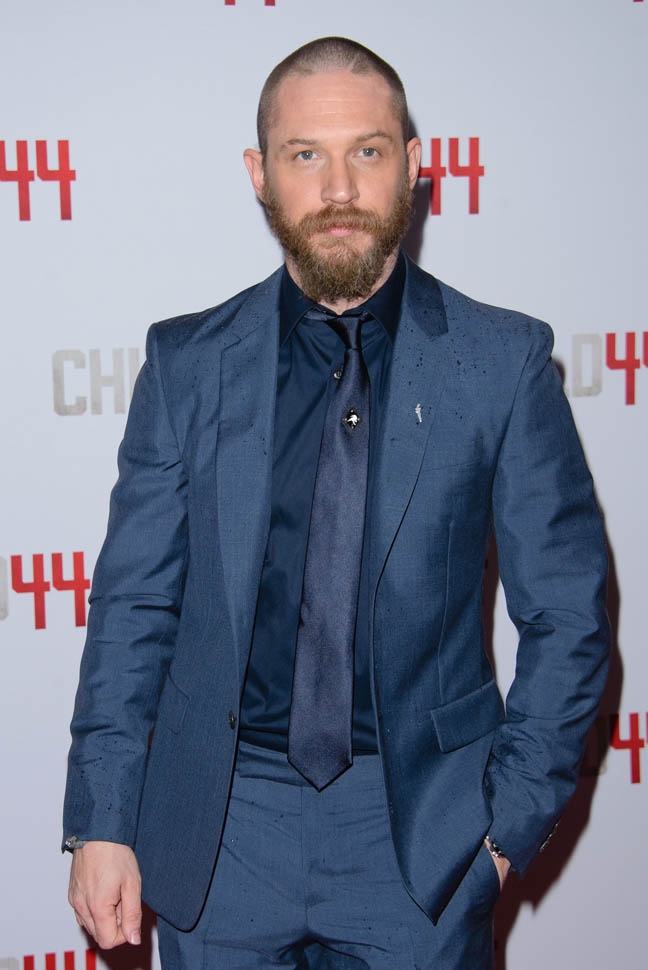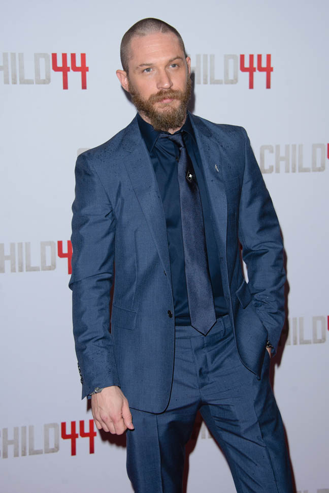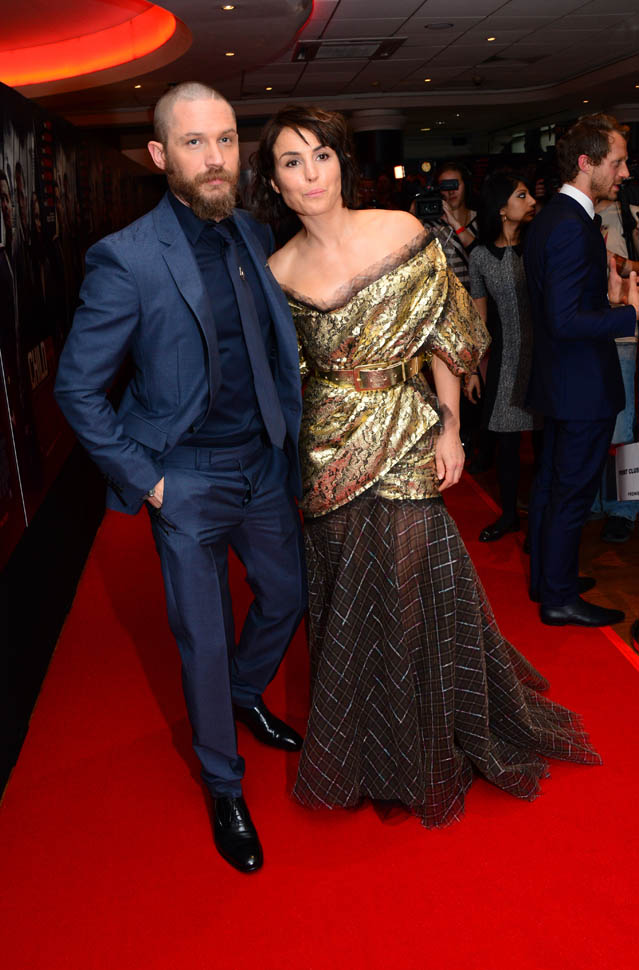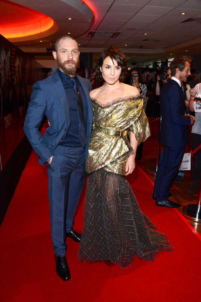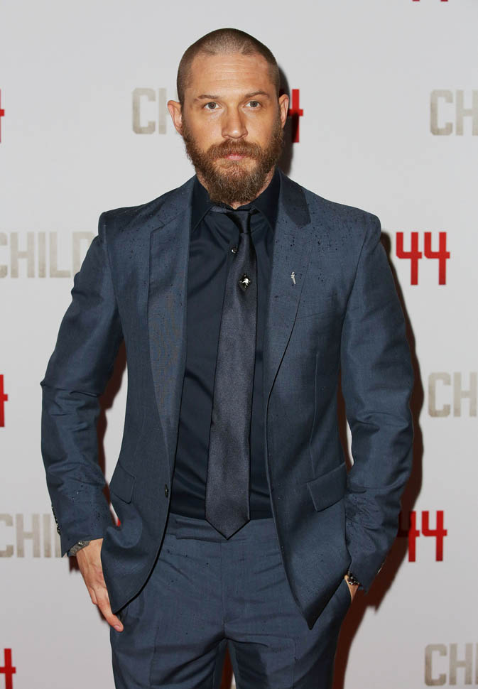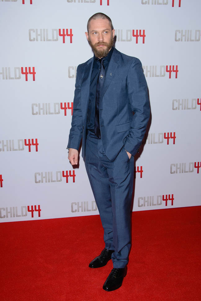 Two days in a row of Tom Hardy. He’s at the Child 44 premiere with Noomi Rapace. I said I wanted to see him in a well-tailored suit. He’s in a well-tailored suit. Is that working for you?