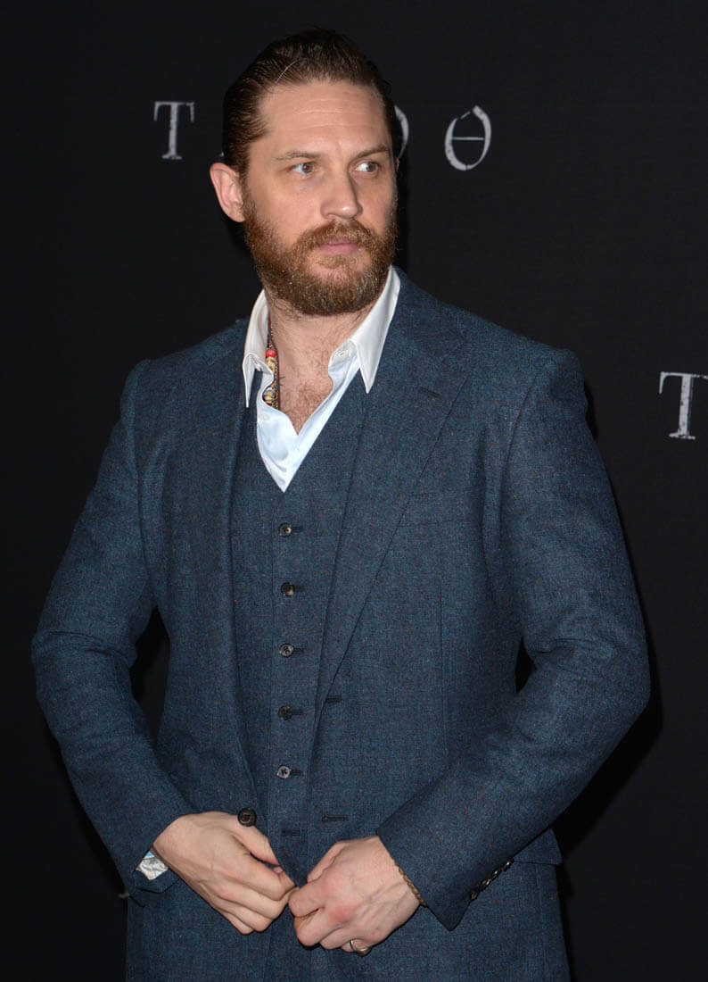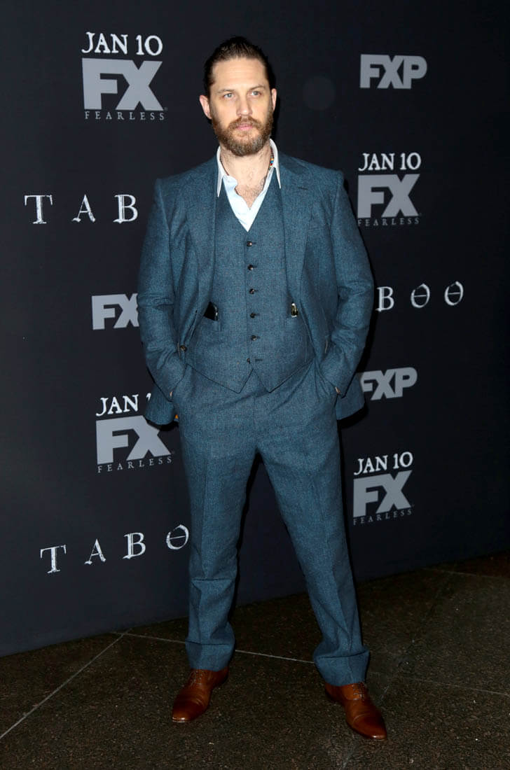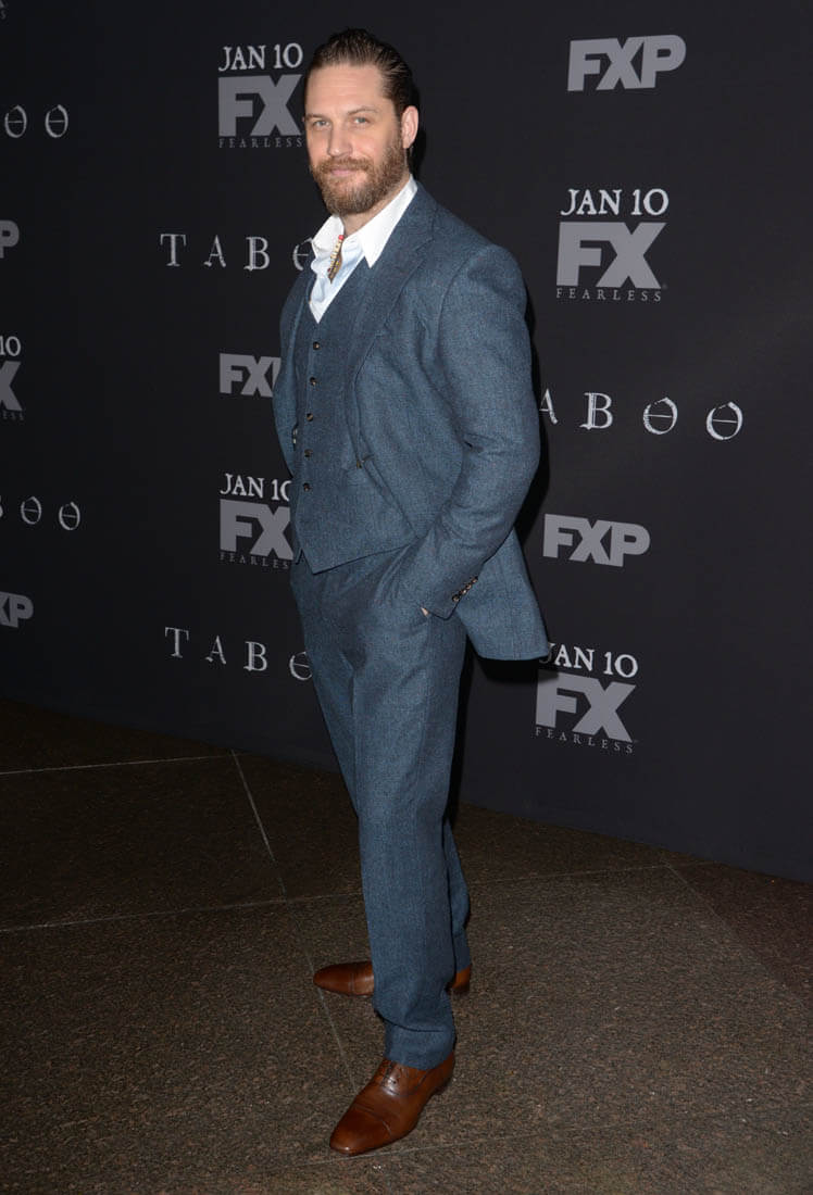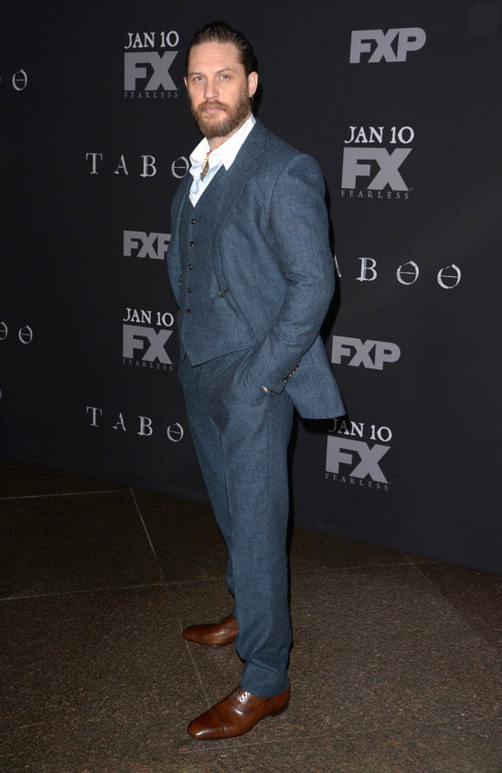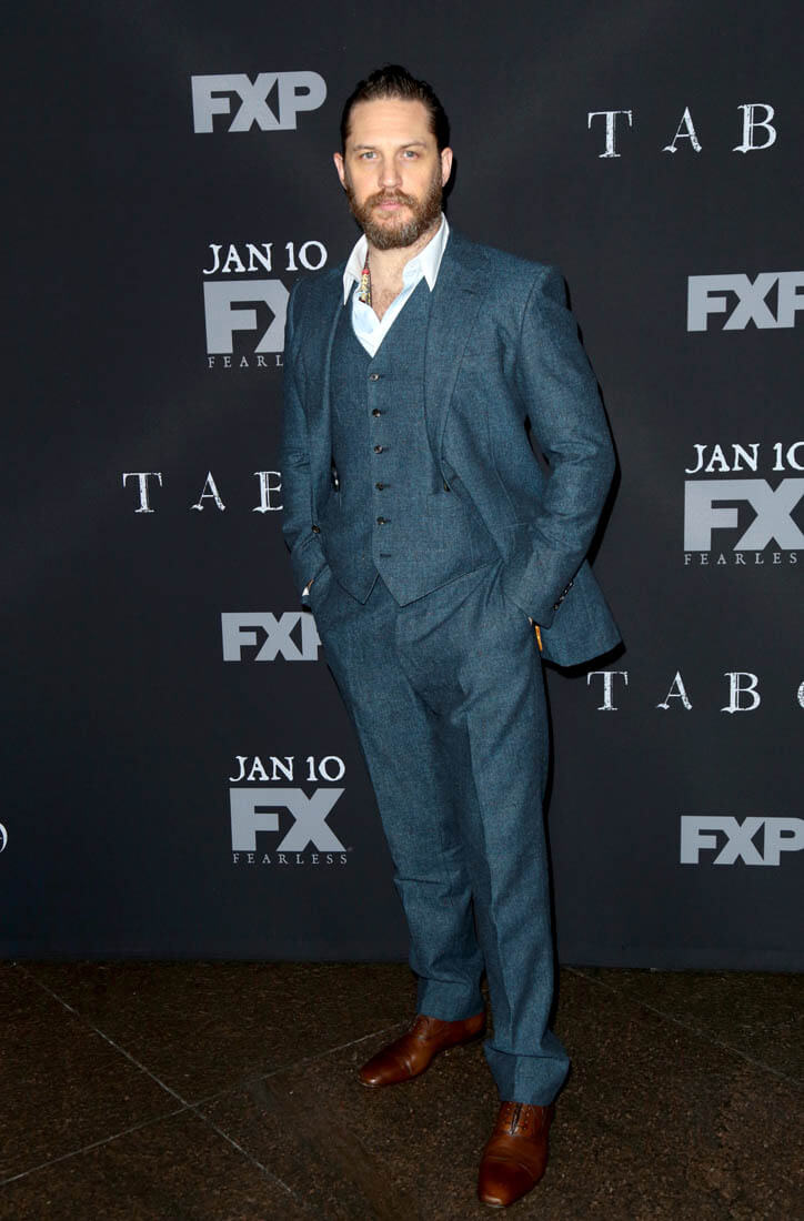 Tom Hardy’s Taboo debuts tonight. Sarah will be writing about it tomorrow. Here’s Tom last night at the LA premiere. Over the last couple of weeks, he’s been doing American press to promote the series, more than usual, at least that’s what it feels like. Perhaps because he’s producing. And he worked on it with his dad, who he calls “Chips”.