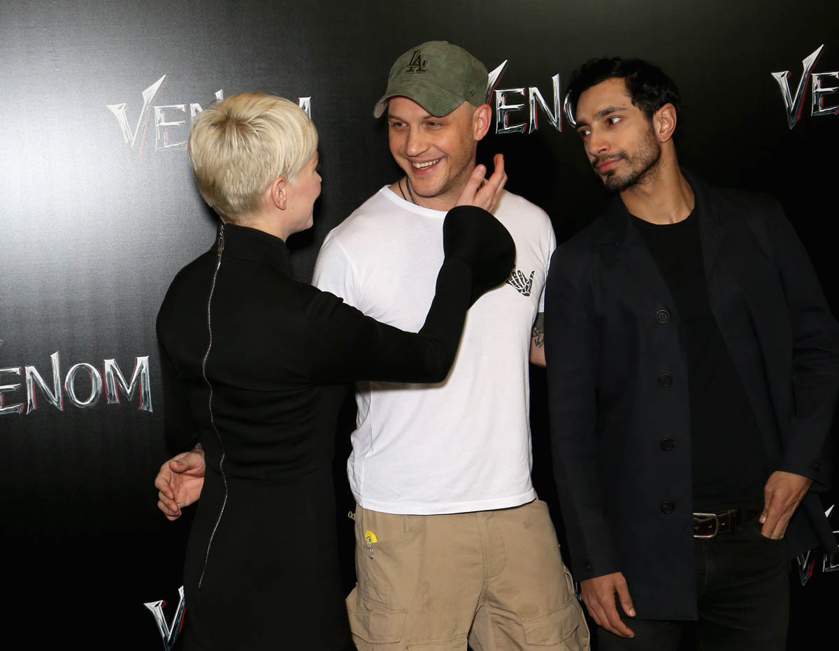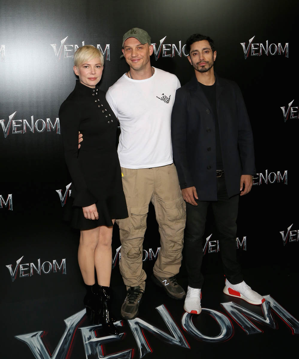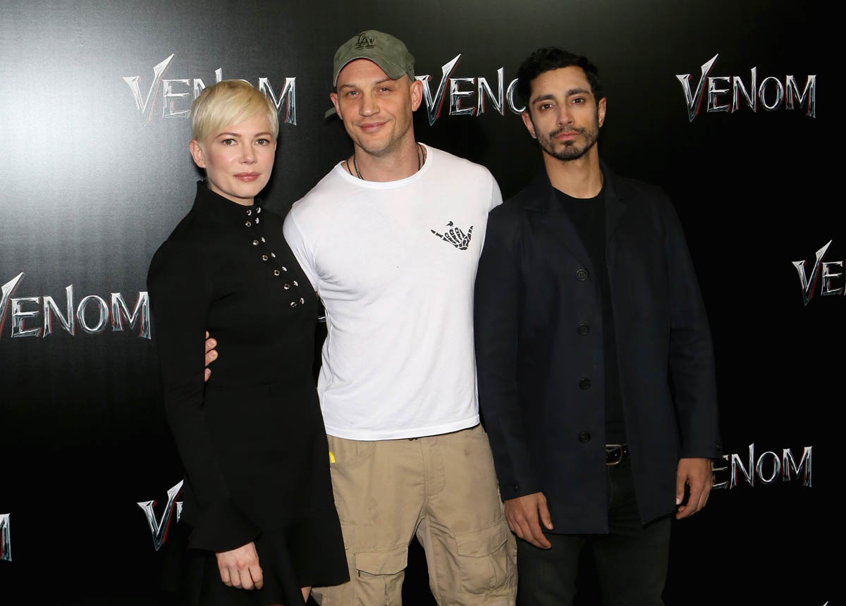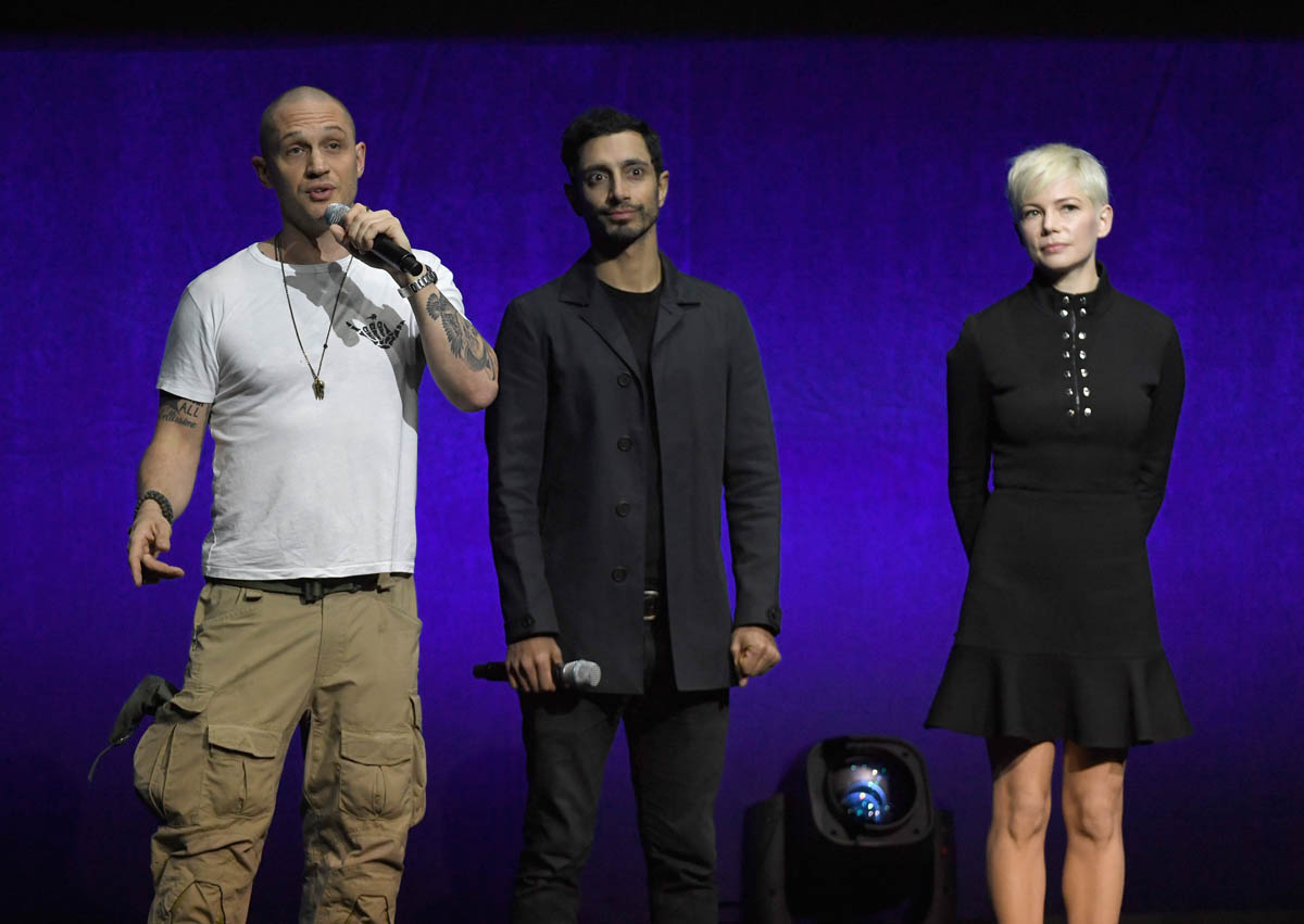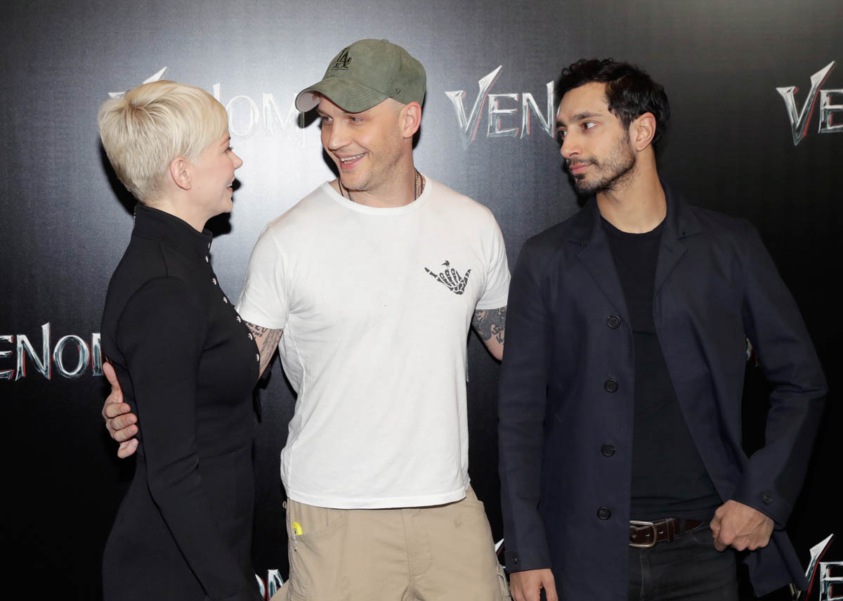 While almost everyone (except Chris Evans) from the MCU was in LA last night for the Avengers: Infinity War premiere, Tom Hardy who is Marvel-ish but not MCU proper was in Vegas at CinemaCon for the Sony presentation and the release of the new Venom trailer, with Michelle Williams and Riz Ahmed. I have no comic book background on what Venom is and why, beyond the fact that he’s a villain and may or may not be associated with Spider-Man. Seriously, I think I need an online crash course on all of these characters. Oh no, wait. That would be Sarah. It’s just that I was too afraid to text Sarah last night because she was mad at me and Kathleen about Sebastian Stan.
