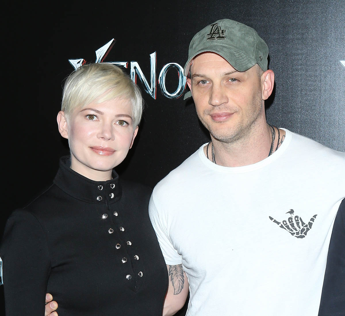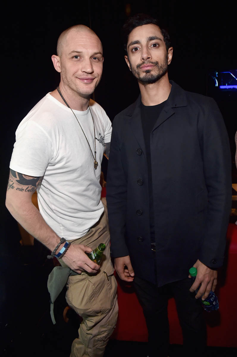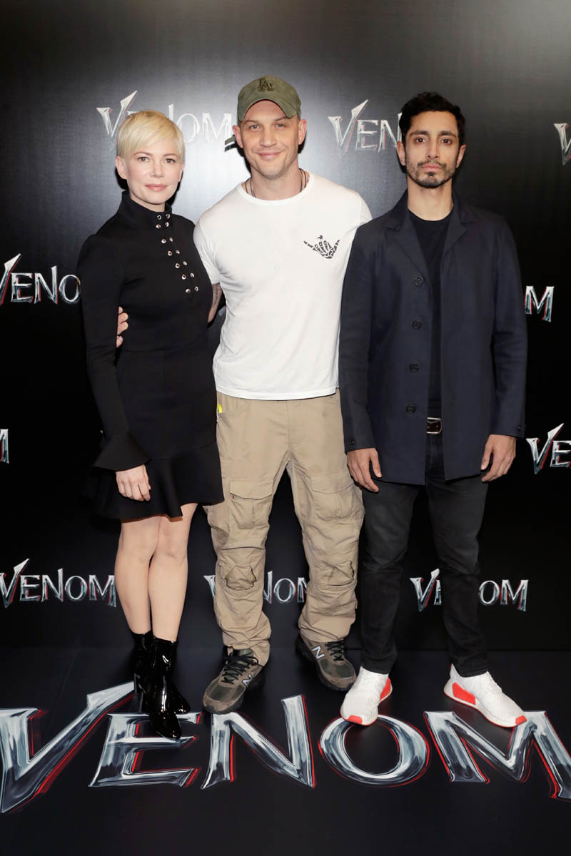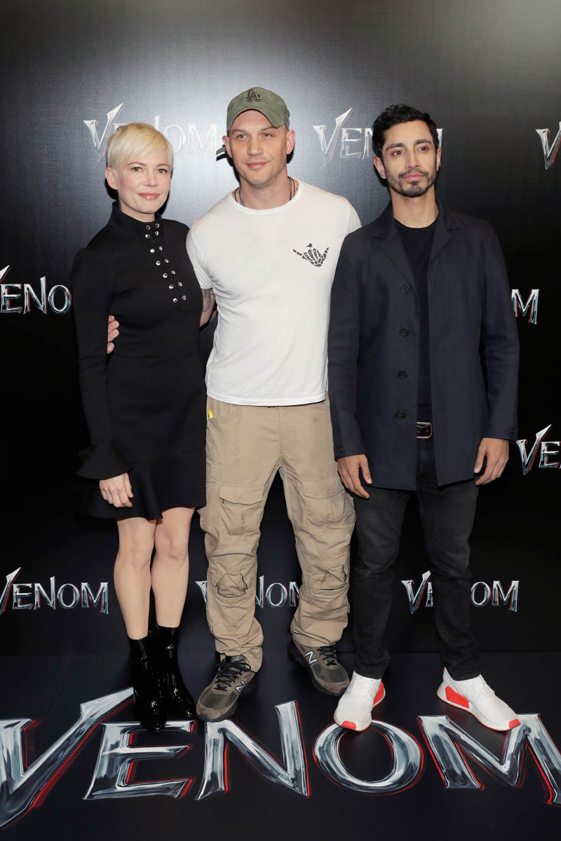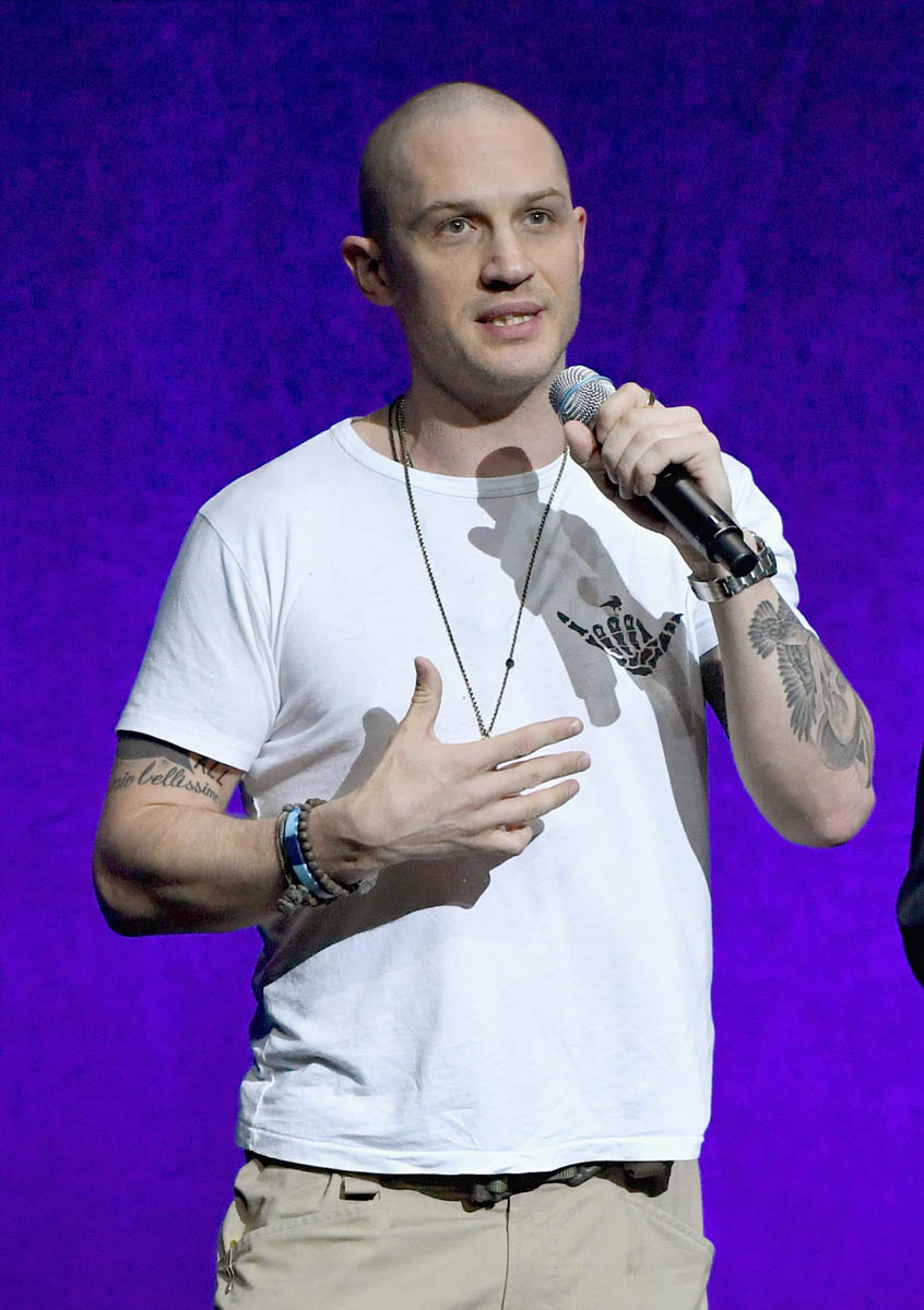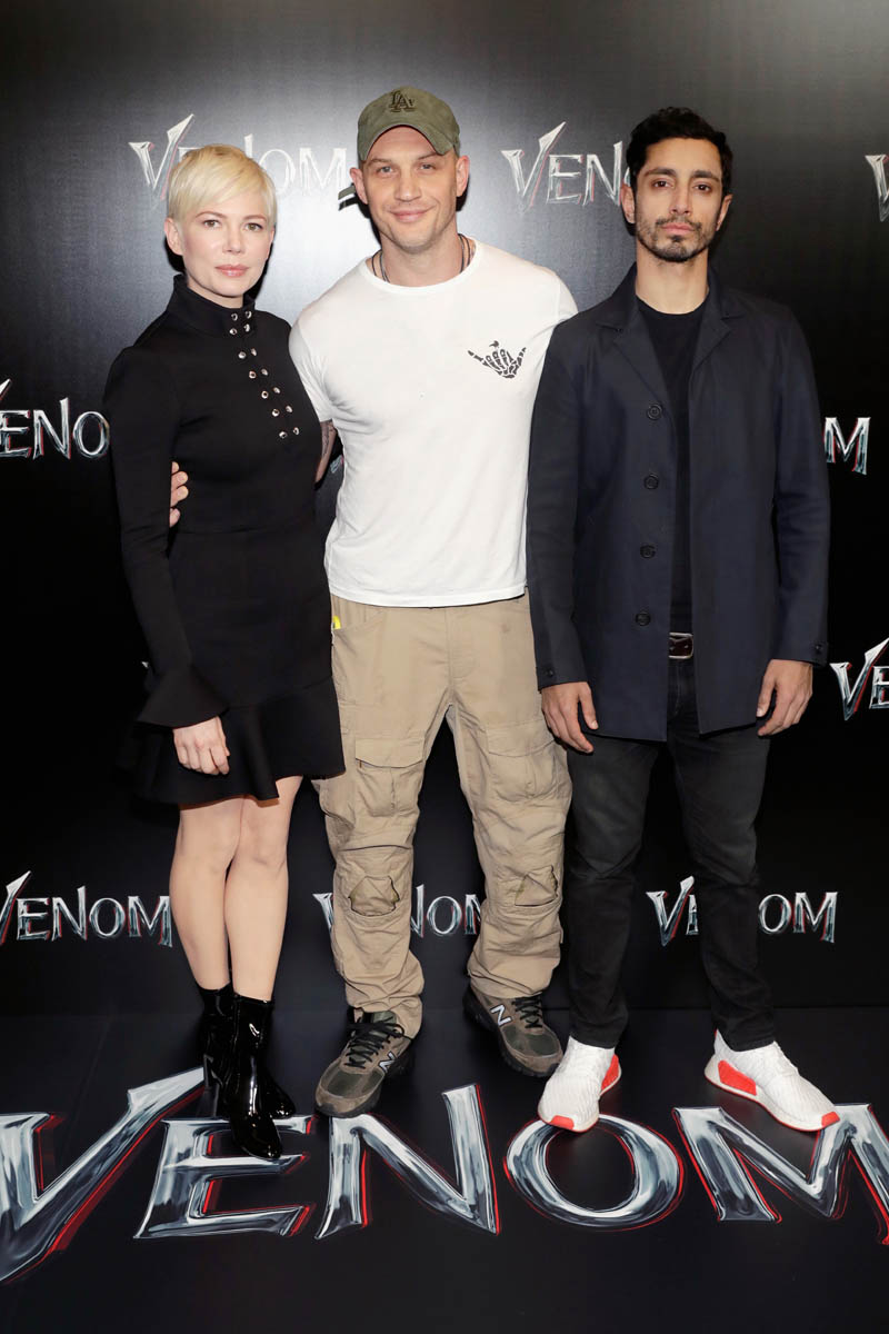 While almost everyone (except Chris Evans) from the MCU was in LA last night for the Avengers: Infinity War premiere, Tom Hardy who is Marvel-ish but not MCU proper was in Vegas at CinemaCon for the Sony presentation and the release of the new Venom trailer, with Michelle Williams and Riz Ahmed. I have no comic book background on what Venom is and why, beyond the fact that he’s a villain and may or may not be associated with Spider-Man. Seriously, I think I need an online crash course on all of these characters. Oh no, wait. That would be Sarah. It’s just that I was too afraid to text Sarah last night because she was mad at me and Kathleen about Sebastian Stan.