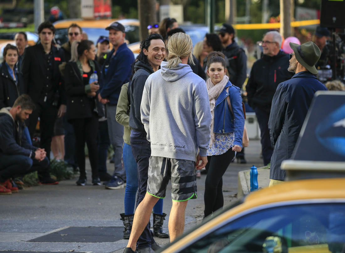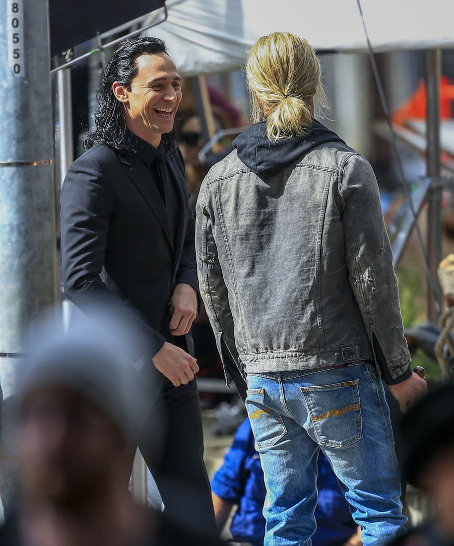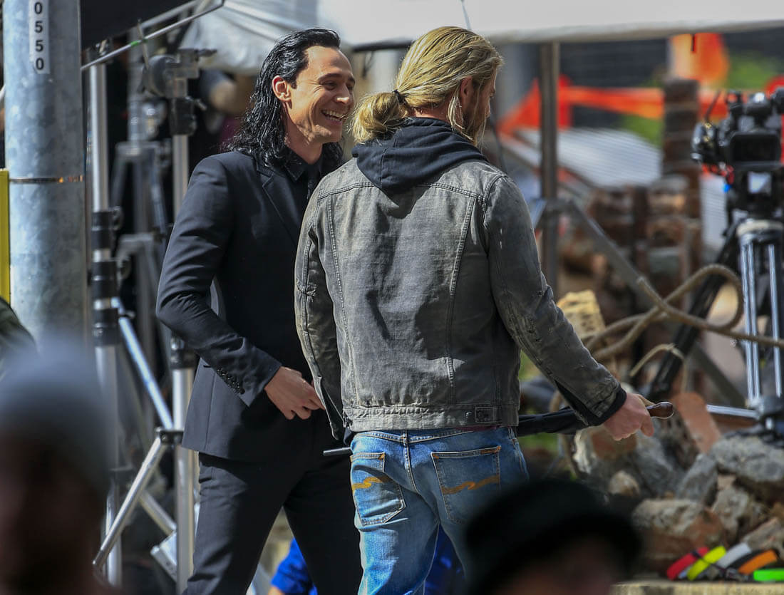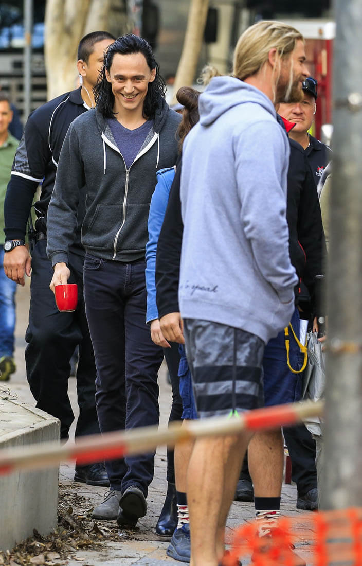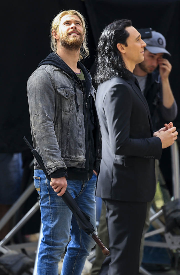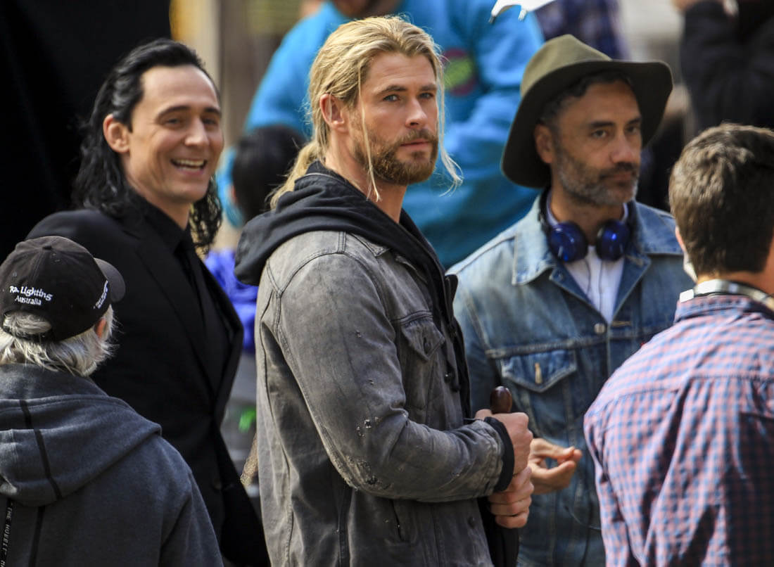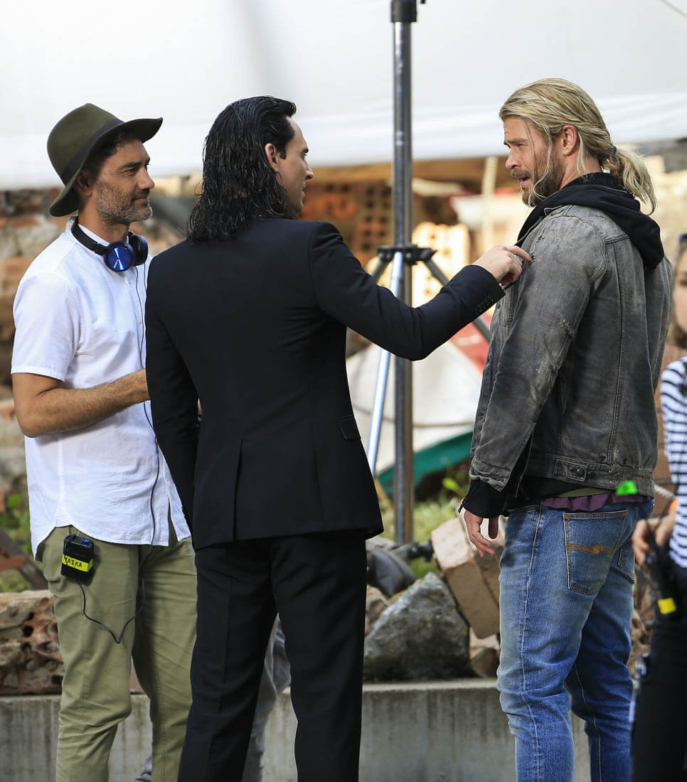 Chris Hemsworth and Tom Hiddleston in Brisbane on the set of Thor 3 with director Taika Waititi. Apparently they’ve constructed the scene to look like New York City. Thor’s in human civilian clothes. Loki, however, doesn’t wear jeans. How can you have hair that bad and object to denim? Not that I don’t object to Tom Hiddleston in a suit. He wears it very, very well. Even better, actually, than Chris Hemsworth. But I find the character’s style decisions fascinating – correct, absolutely, but fascinating.