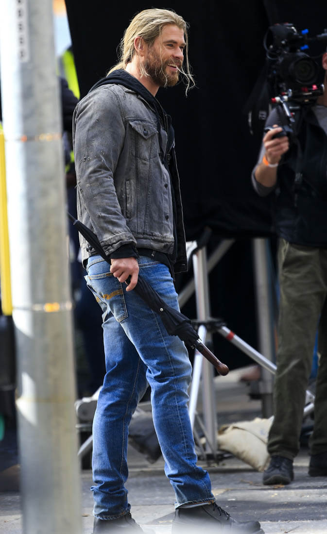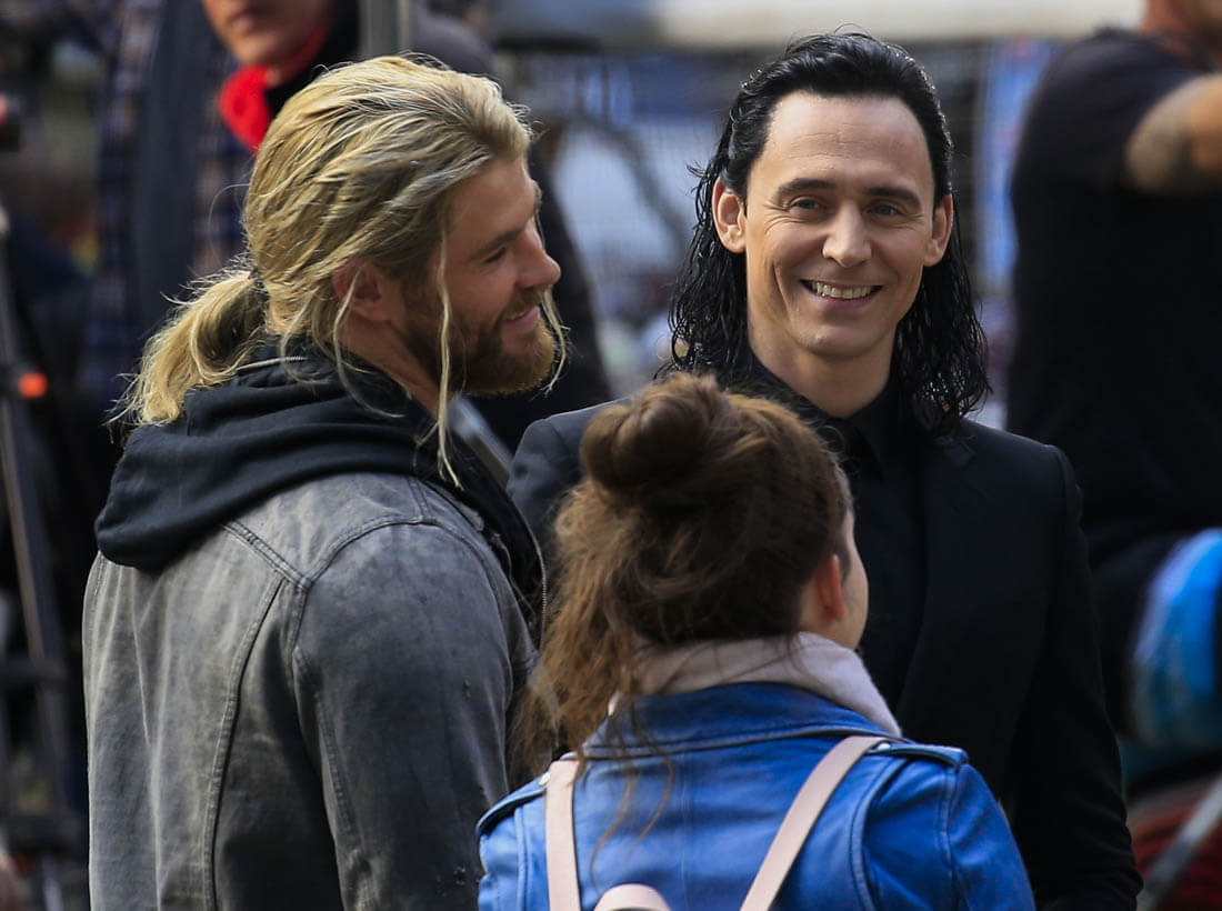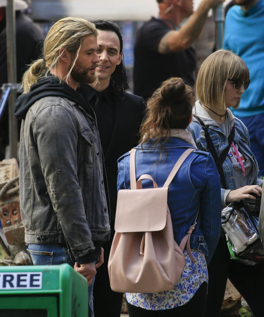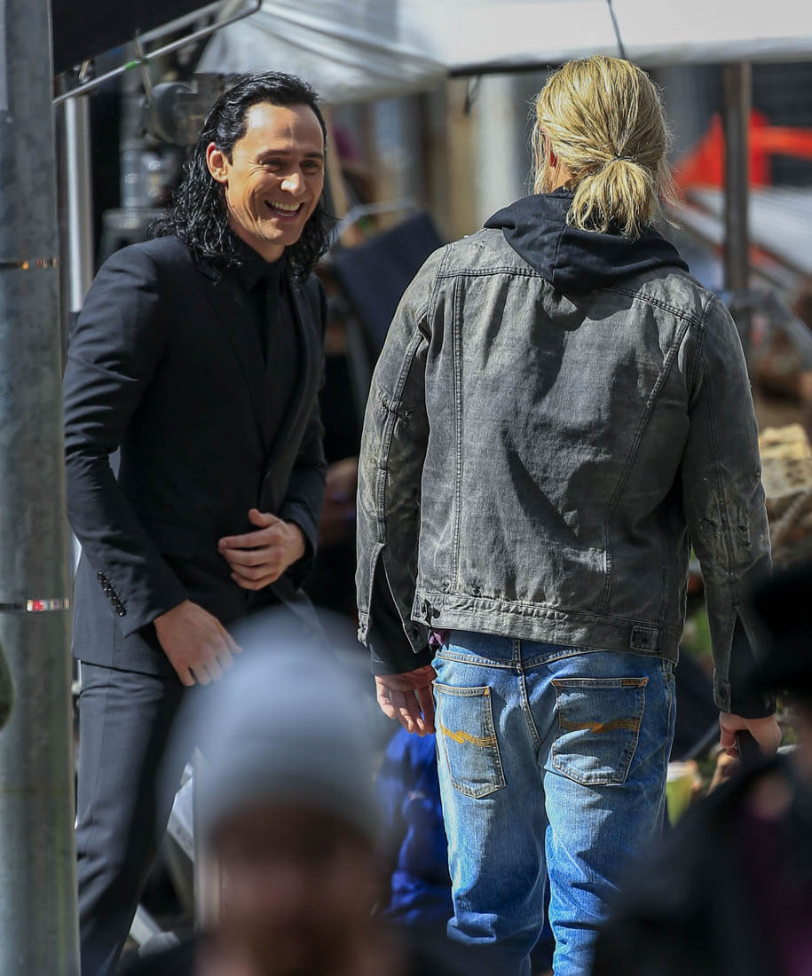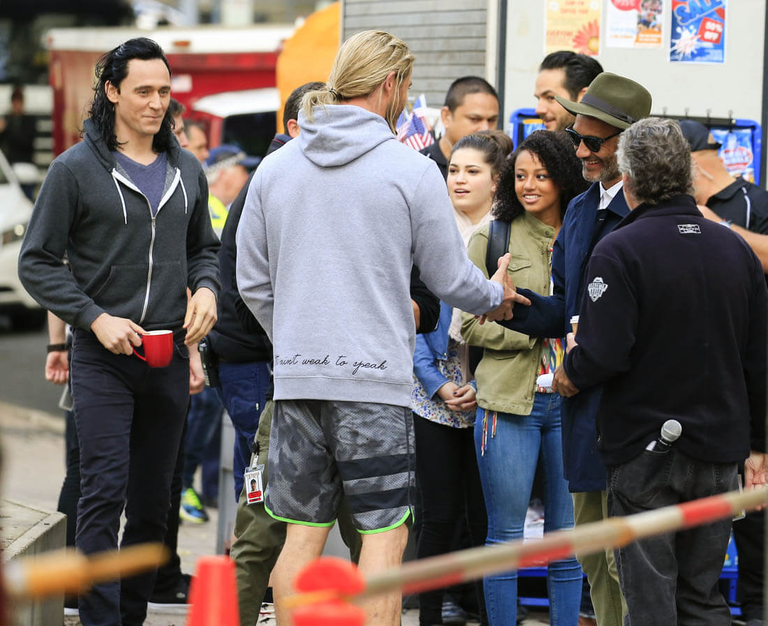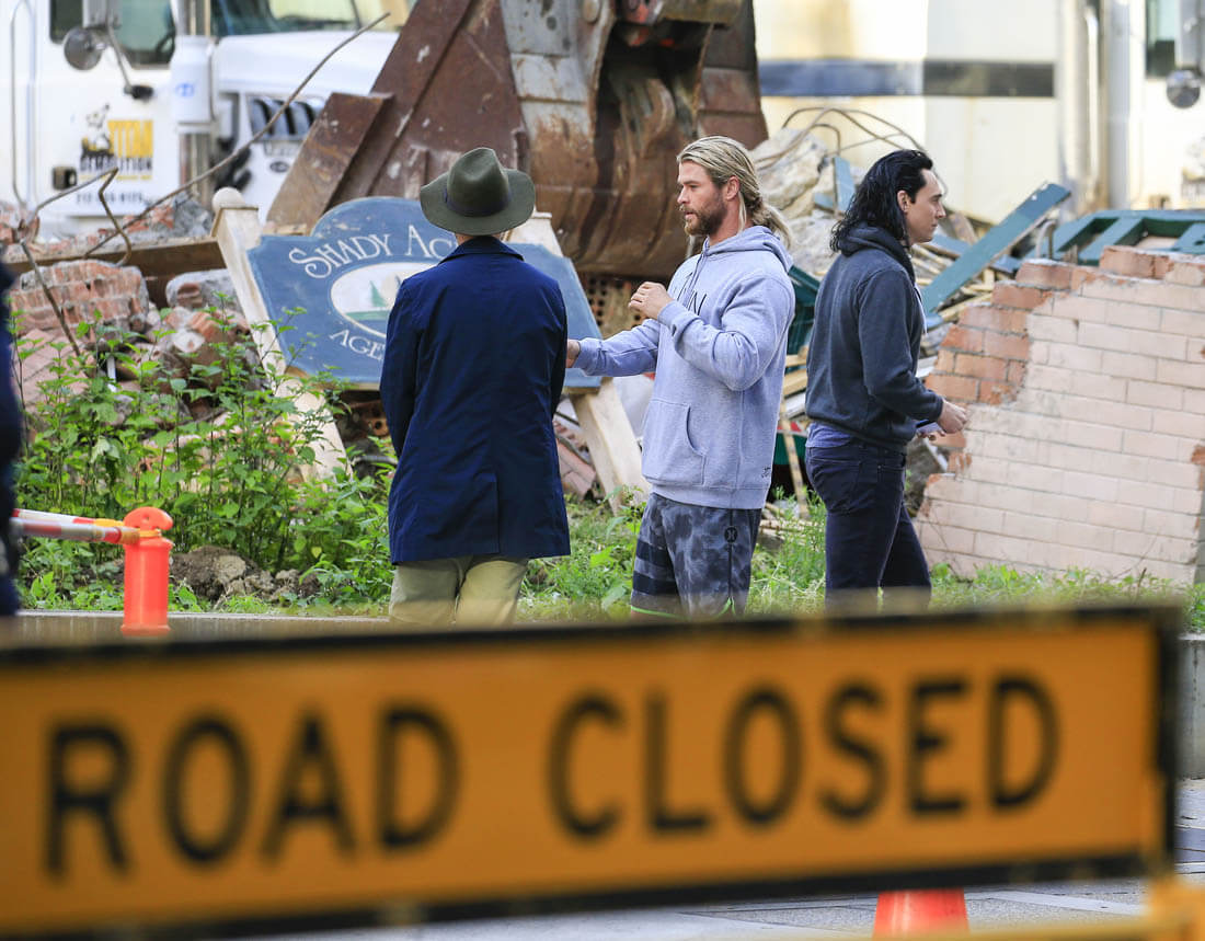 Chris Hemsworth and Tom Hiddleston in Brisbane on the set of Thor 3 with director Taika Waititi. Apparently they’ve constructed the scene to look like New York City. Thor’s in human civilian clothes. Loki, however, doesn’t wear jeans. How can you have hair that bad and object to denim? Not that I don’t object to Tom Hiddleston in a suit. He wears it very, very well. Even better, actually, than Chris Hemsworth. But I find the character’s style decisions fascinating – correct, absolutely, but fascinating.