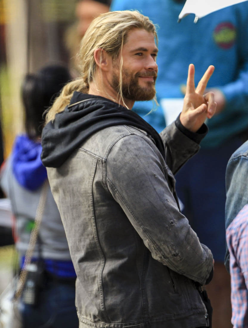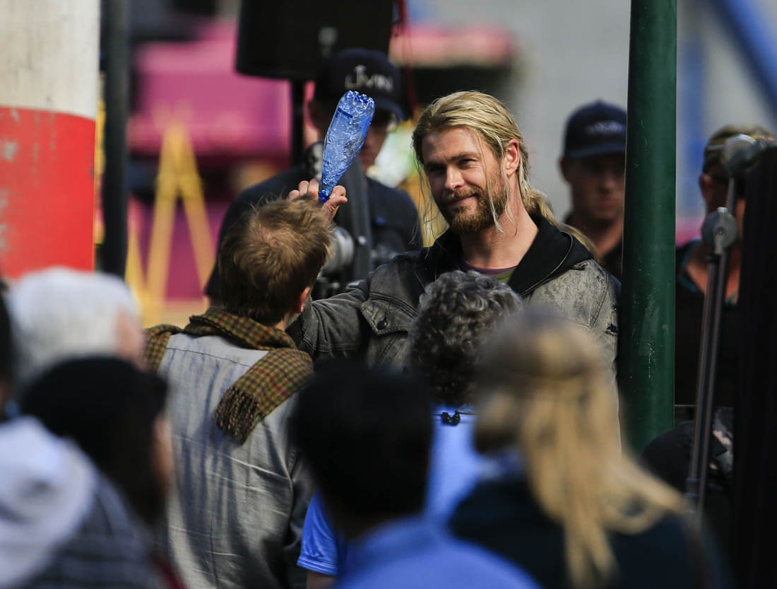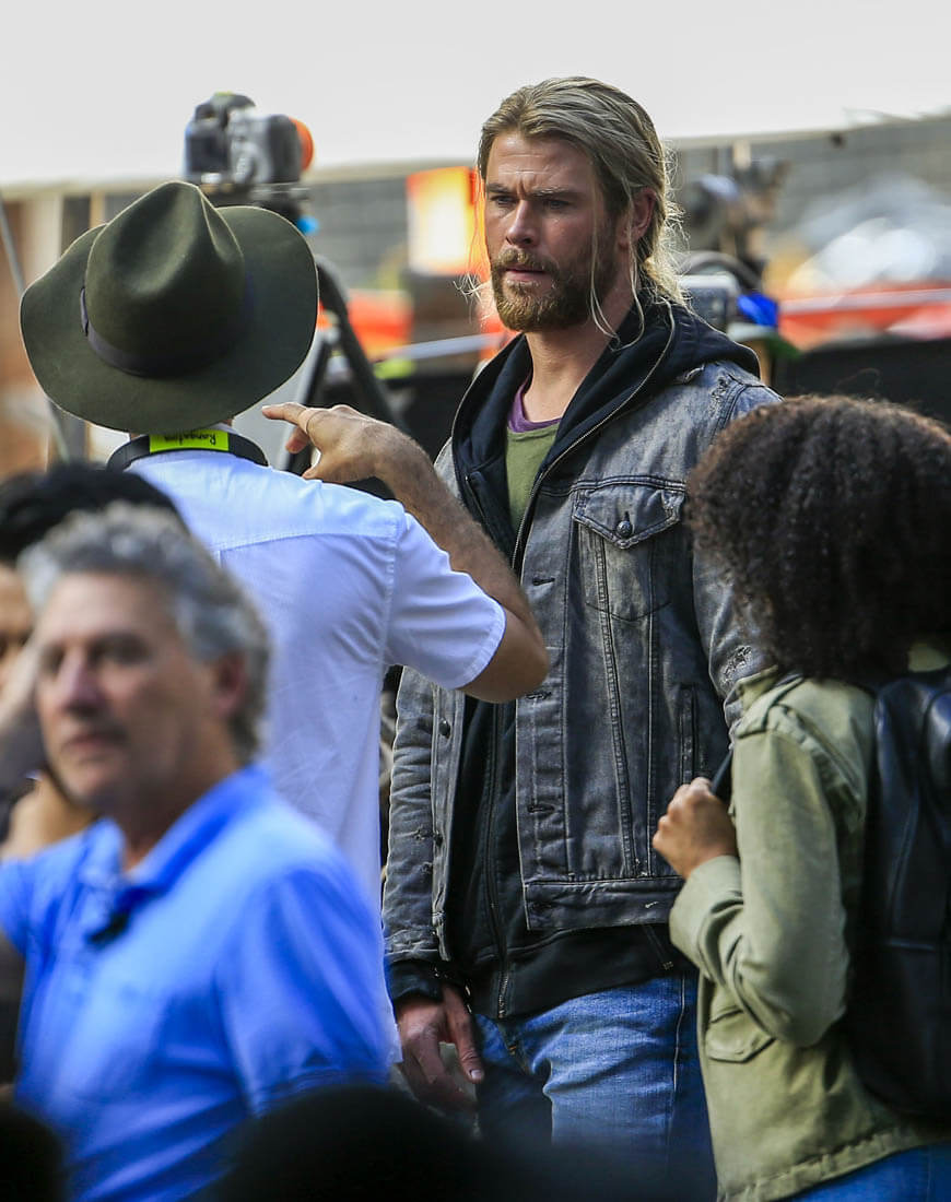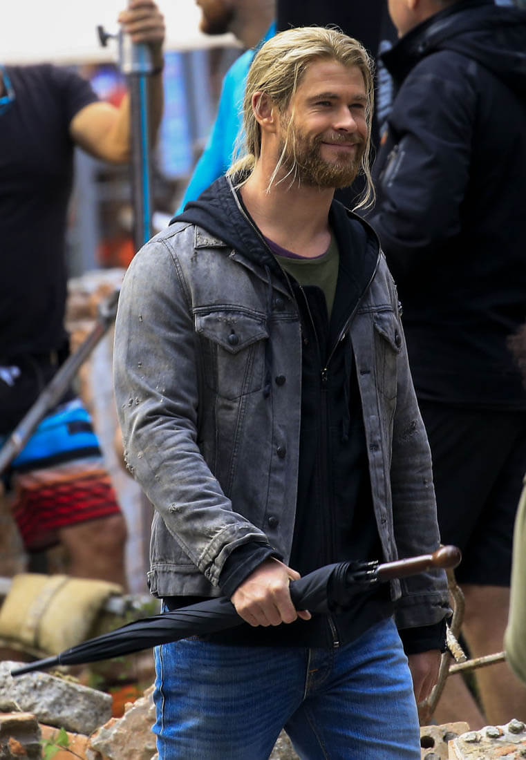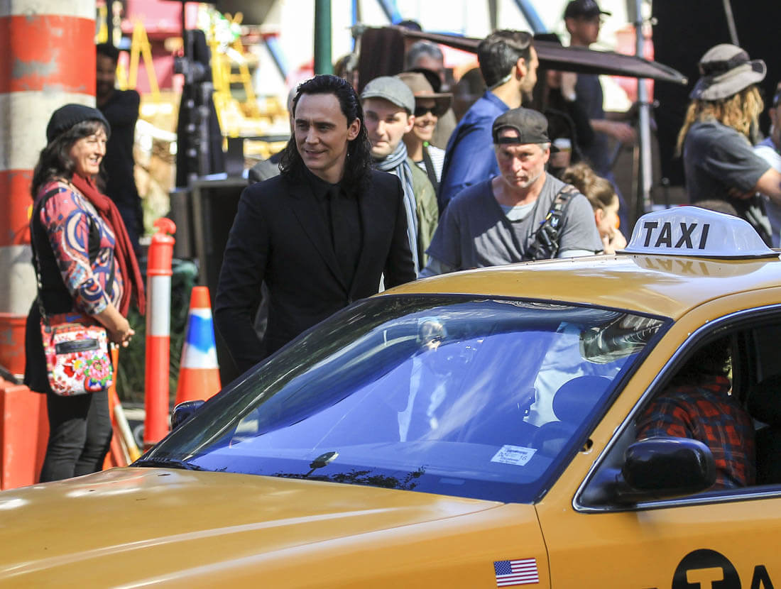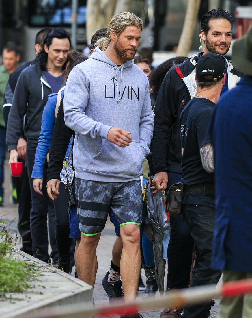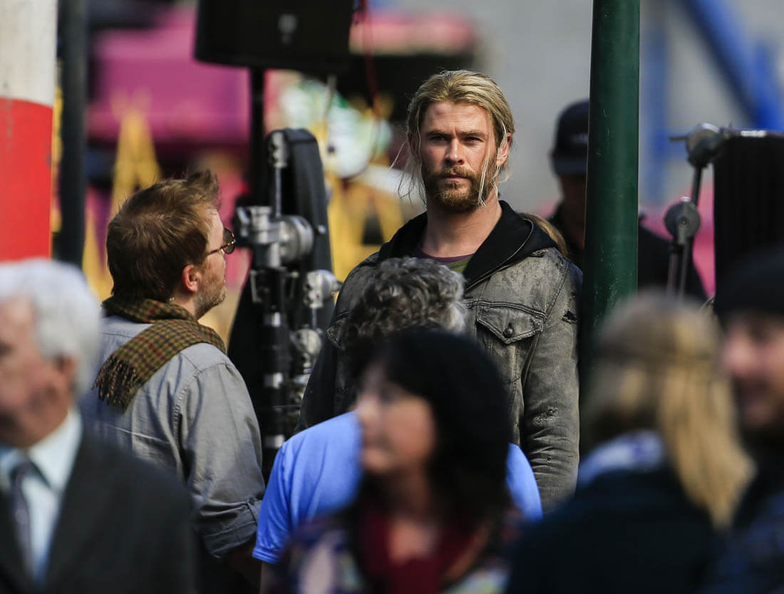 Chris Hemsworth and Tom Hiddleston in Brisbane on the set of Thor 3 with director Taika Waititi. Apparently they’ve constructed the scene to look like New York City. Thor’s in human civilian clothes. Loki, however, doesn’t wear jeans. How can you have hair that bad and object to denim? Not that I don’t object to Tom Hiddleston in a suit. He wears it very, very well. Even better, actually, than Chris Hemsworth. But I find the character’s style decisions fascinating – correct, absolutely, but fascinating.