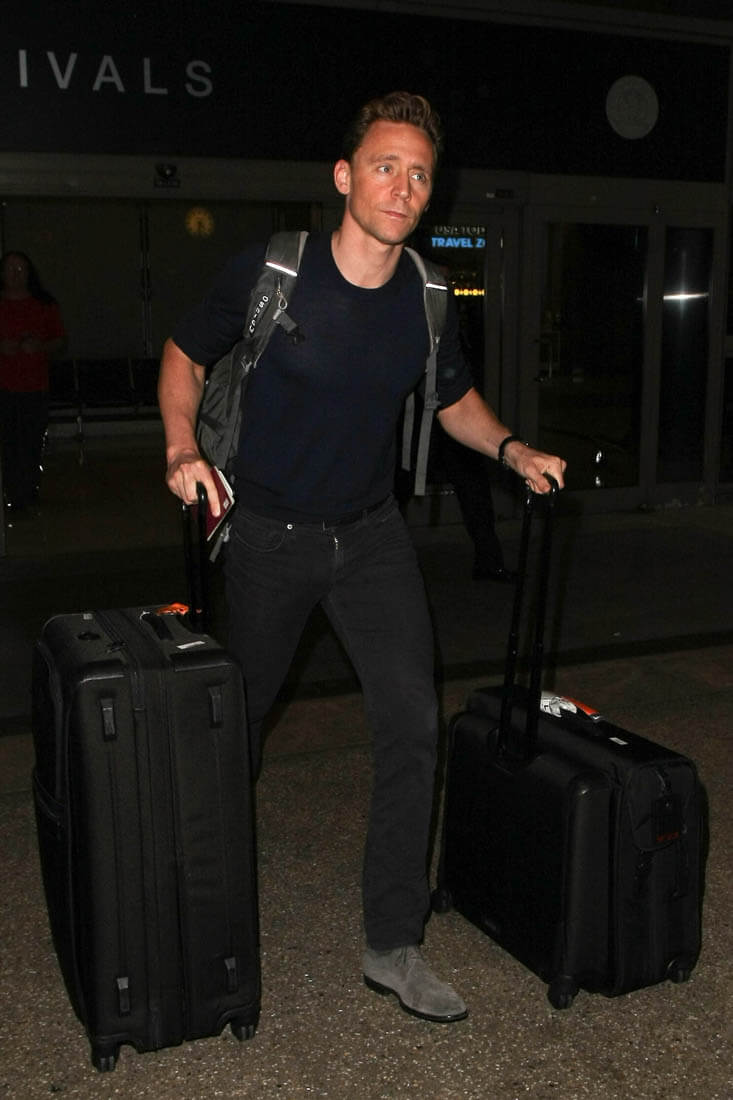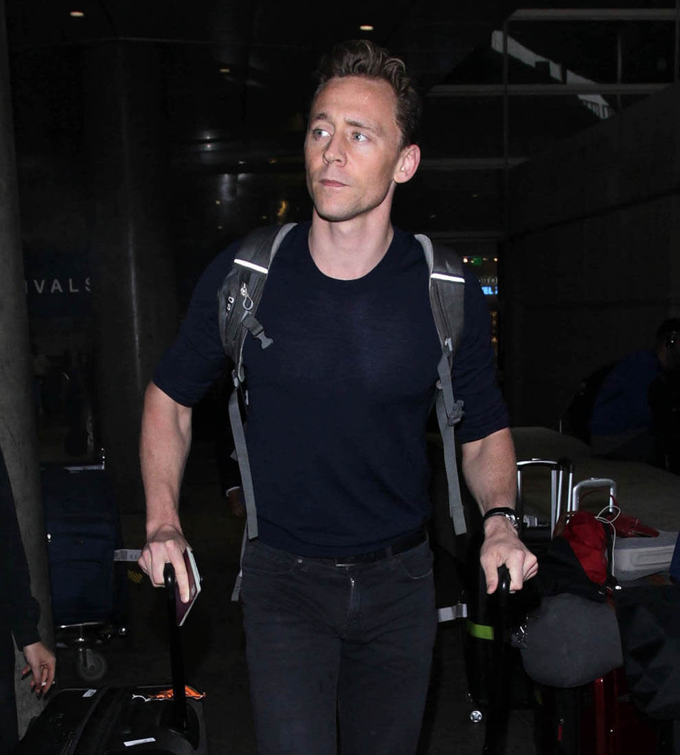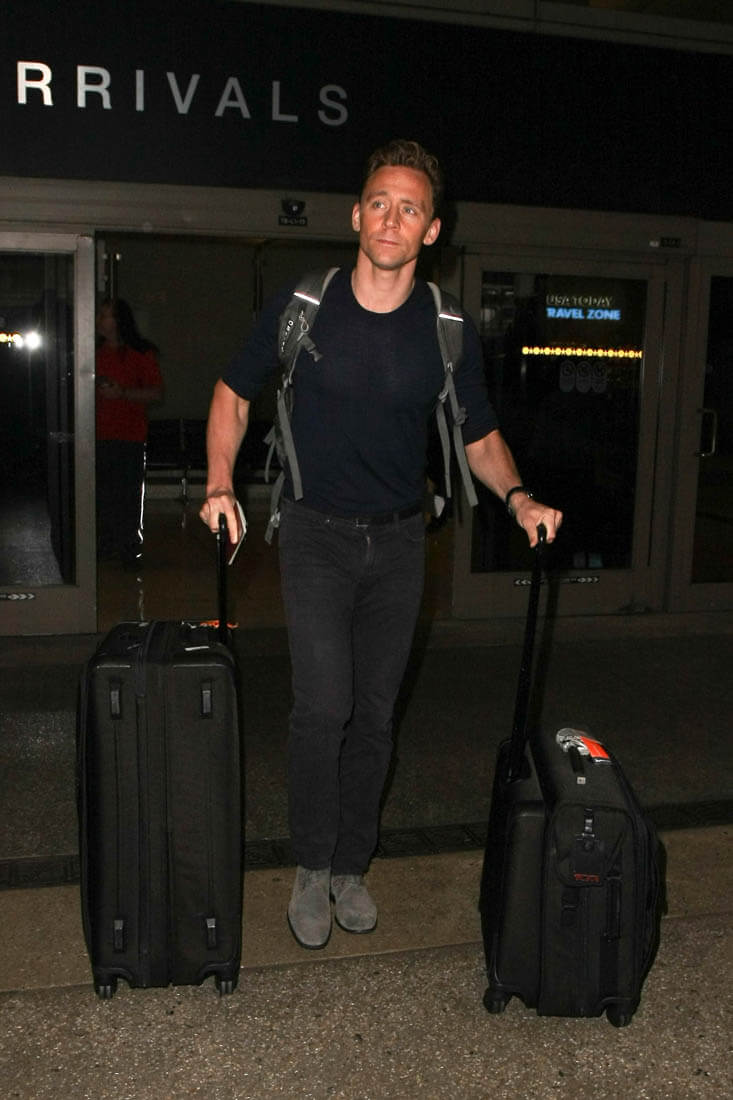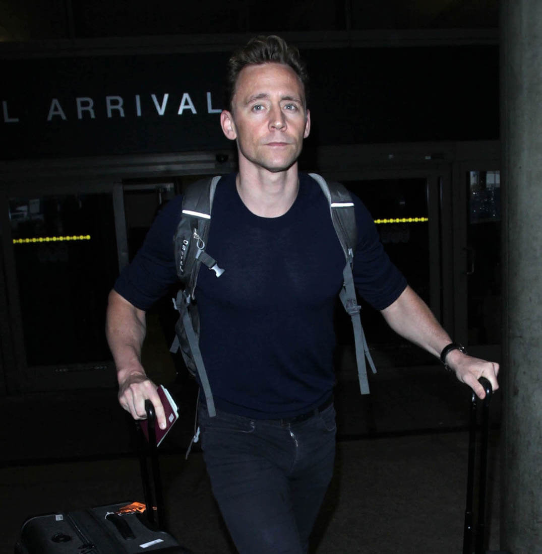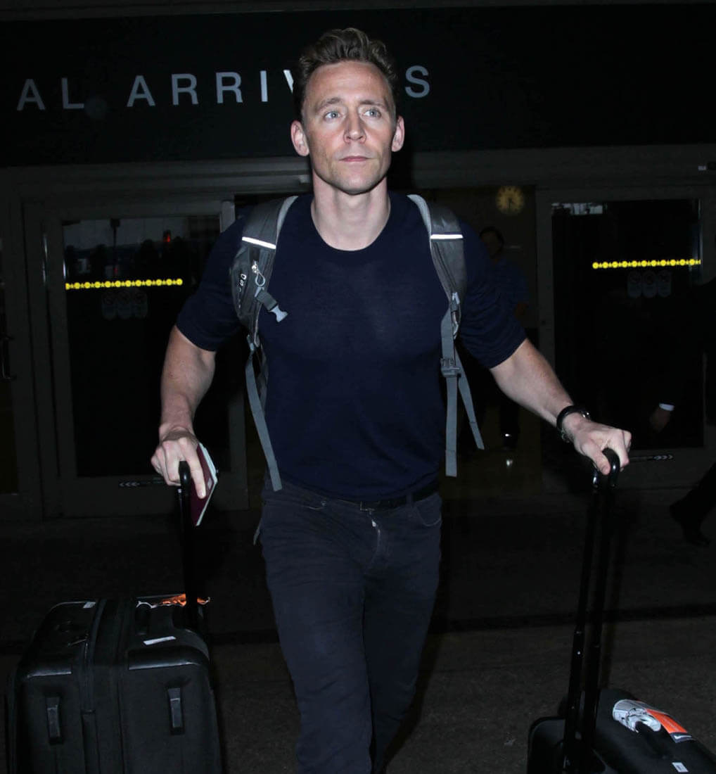 This is for those of you who have been emailing every day with Swoki worry, angsting about whether or not they’re still happily ever after. As mentioned yesterday and today, Tom Hiddleston is due in LA this week for Emmy campaigning. And here he is, arriving at LAX this morning.