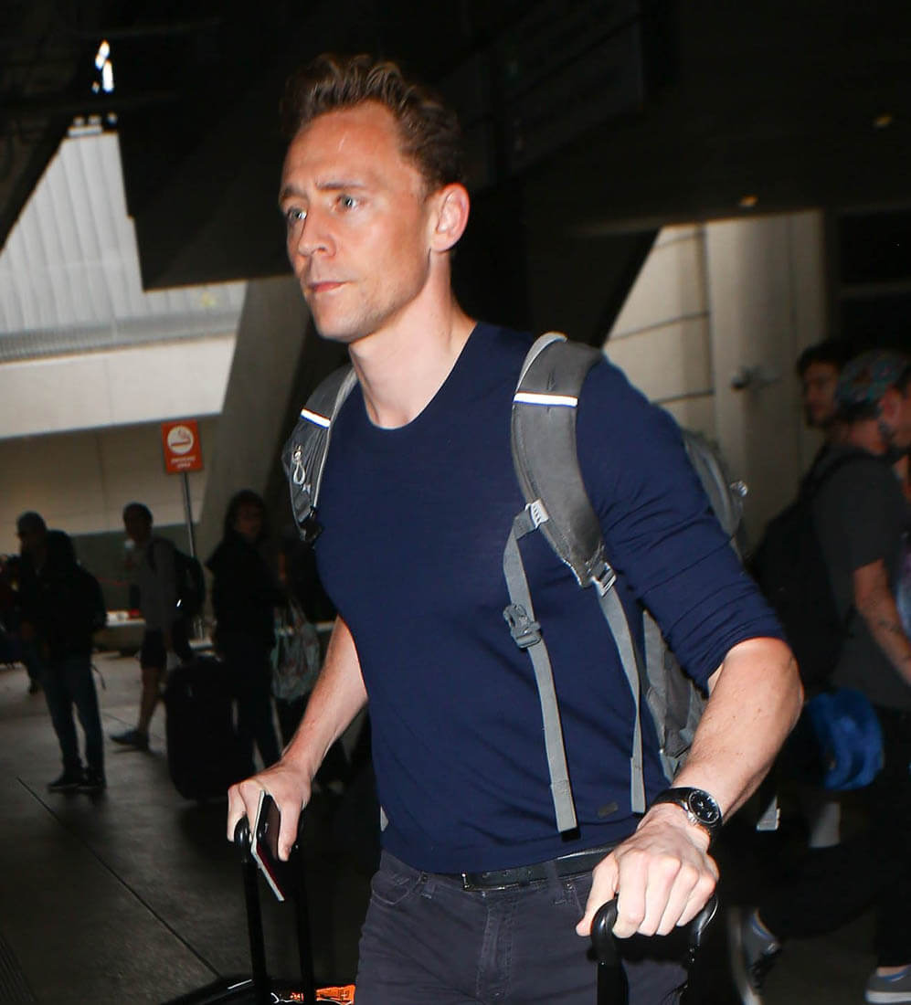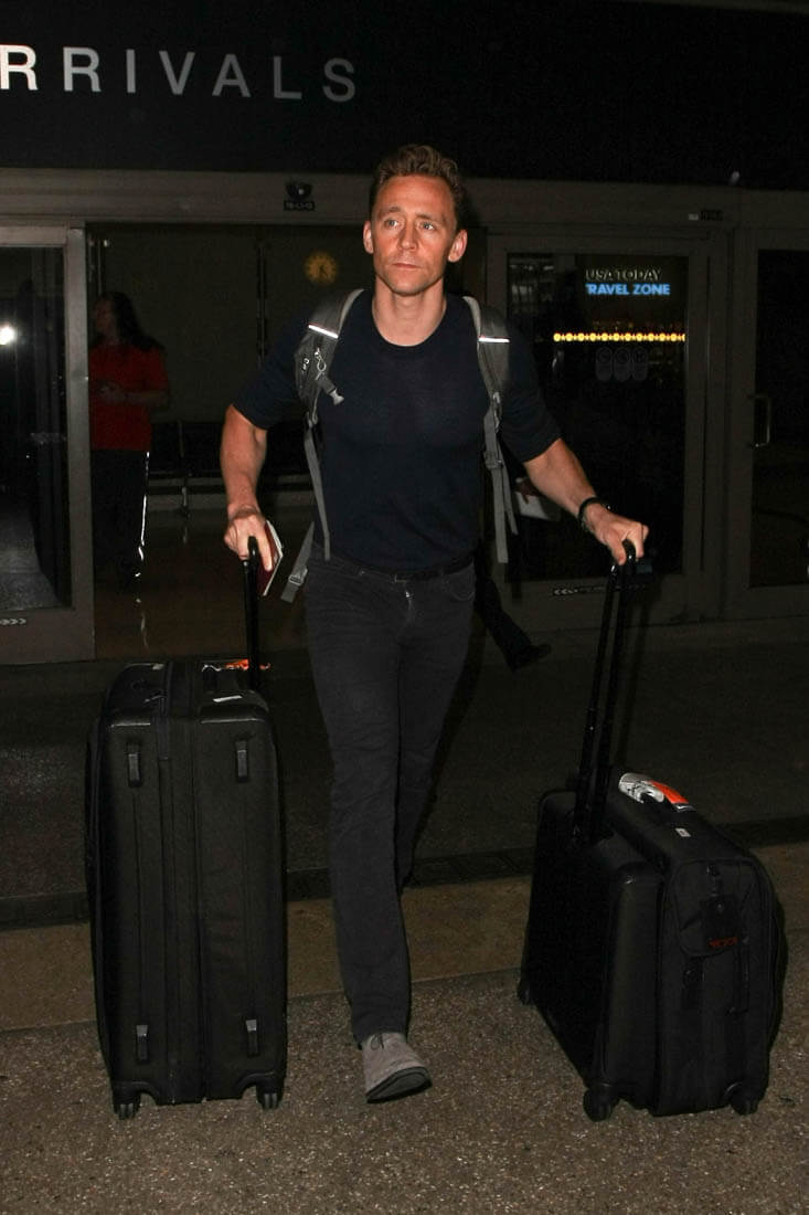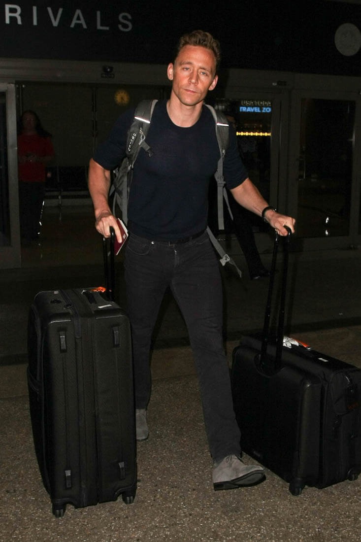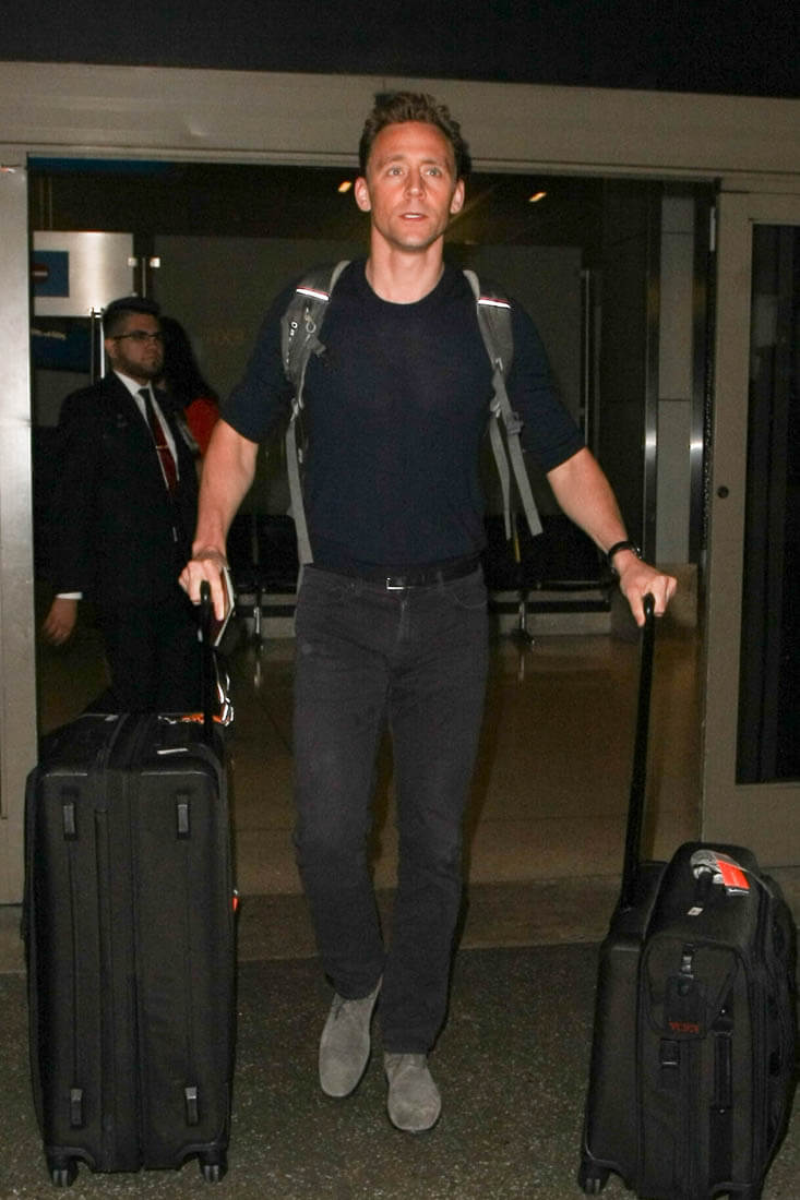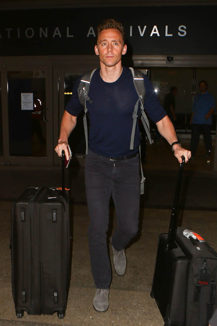This is for those of you who have been emailing every day with Swoki worry, angsting about whether or not they’re still happily ever after. As mentioned yesterday and today, Tom Hiddleston is due in LA this week for Emmy campaigning. And here he is, arriving at LAX this morning.