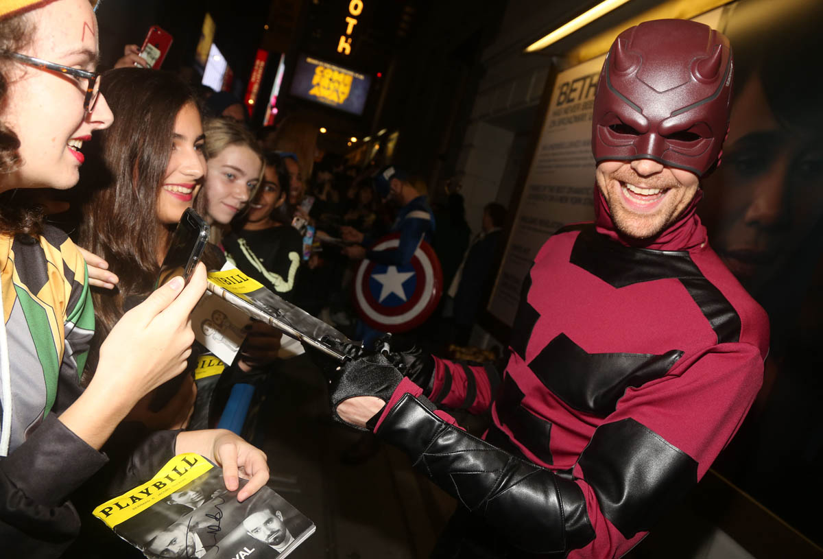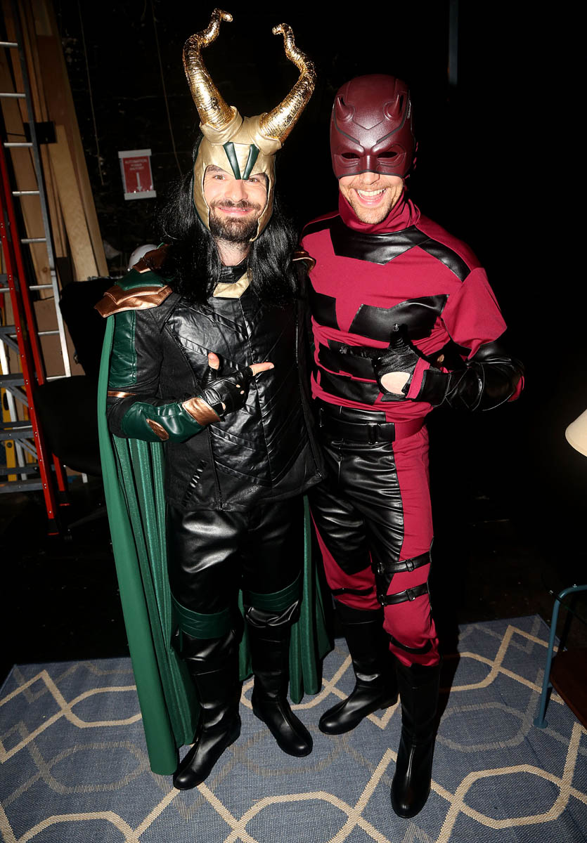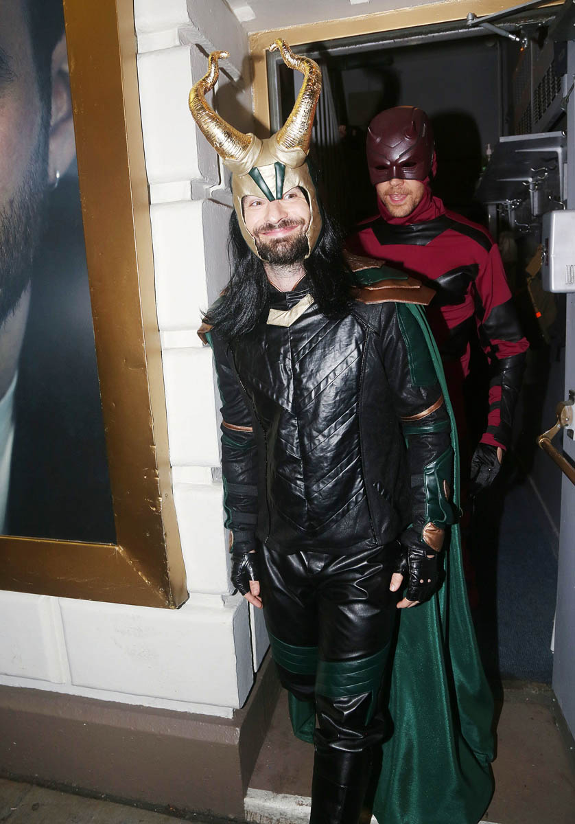 If you play a superhero, is it gauche to dress as that superhero for Halloween? I think so. I would think less of Chris Hemsworth if he showed up at a party as Thor. Tom Hiddleston and the cast of Betrayal on Broadway have been teasing a Halloween surprise, telling fans to come by last night by the stage door. The big reveal is that he and Charlie Cox traded costumes – Charlie played Daredevil, Tom was, of course Loki, and they swapped. Their co-stars Zawe Ashton and Eddie Arnold were Captain Marvel and Captain America.
