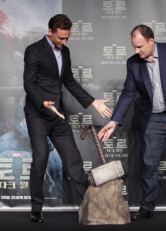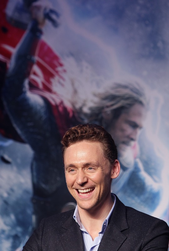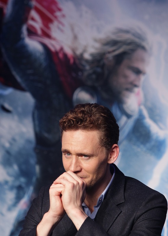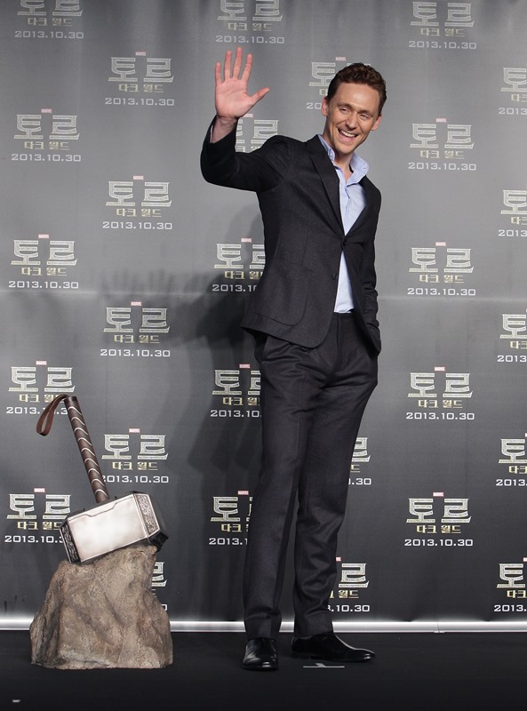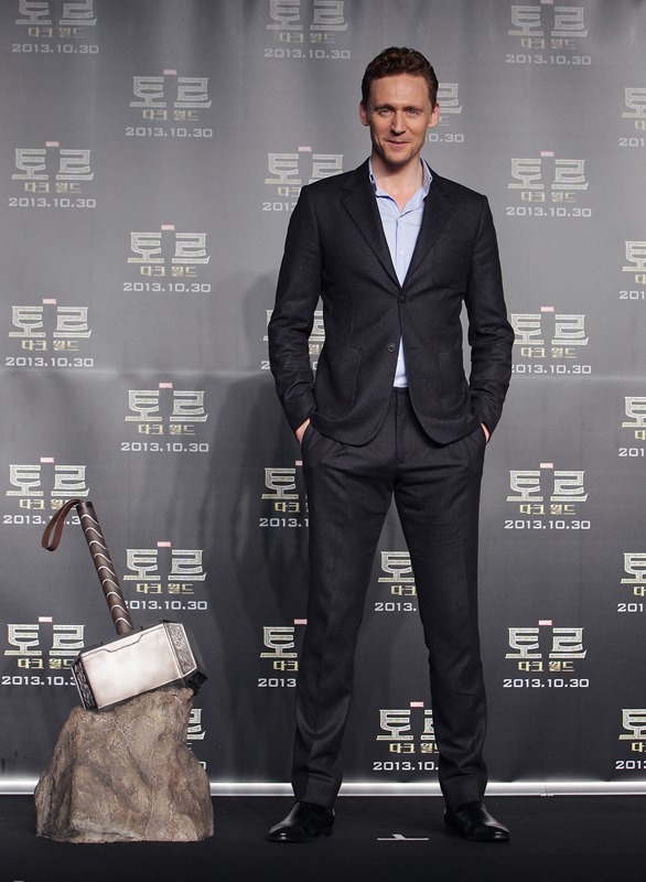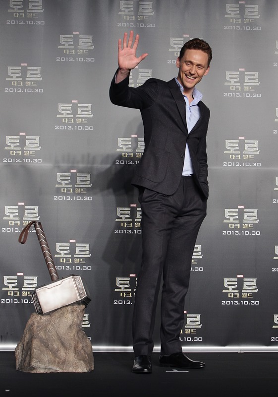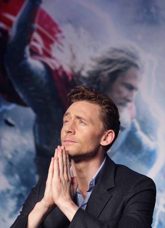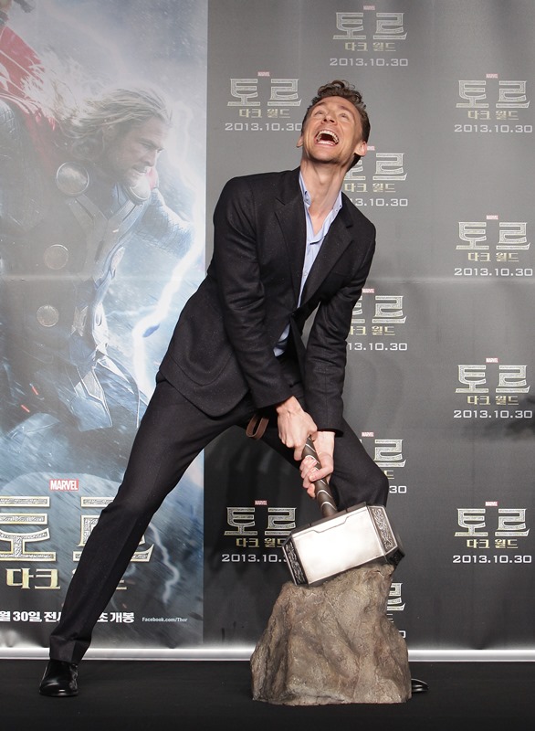 I mean, just look at these photos from the press conference. Sure, it’s Hiddles in a nice (non-banker) suit, looking like a long tall drink of water, but then you blink and there he is, mugging for the cameras and trying to “lift” Thor’s hammer like the giant dork he is. Either you’re enjoying the new photos of a cute guy, or you’re laughing your ass off. No one loses when Tom Hiddleston is on the promotional trail.