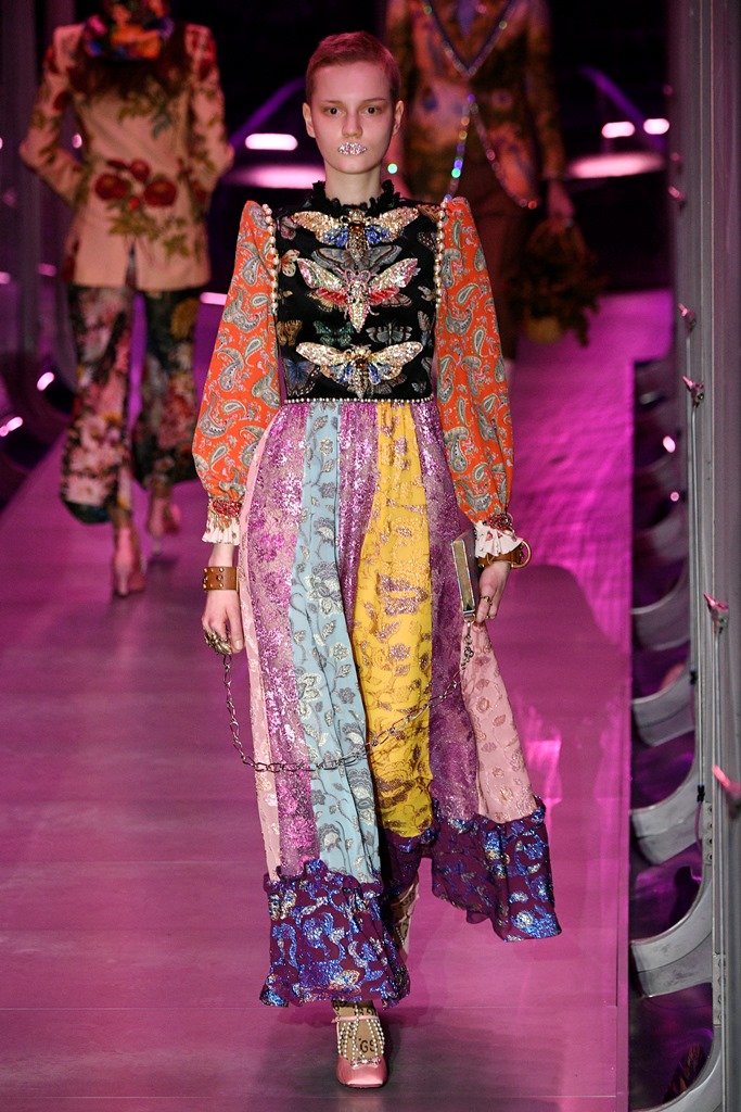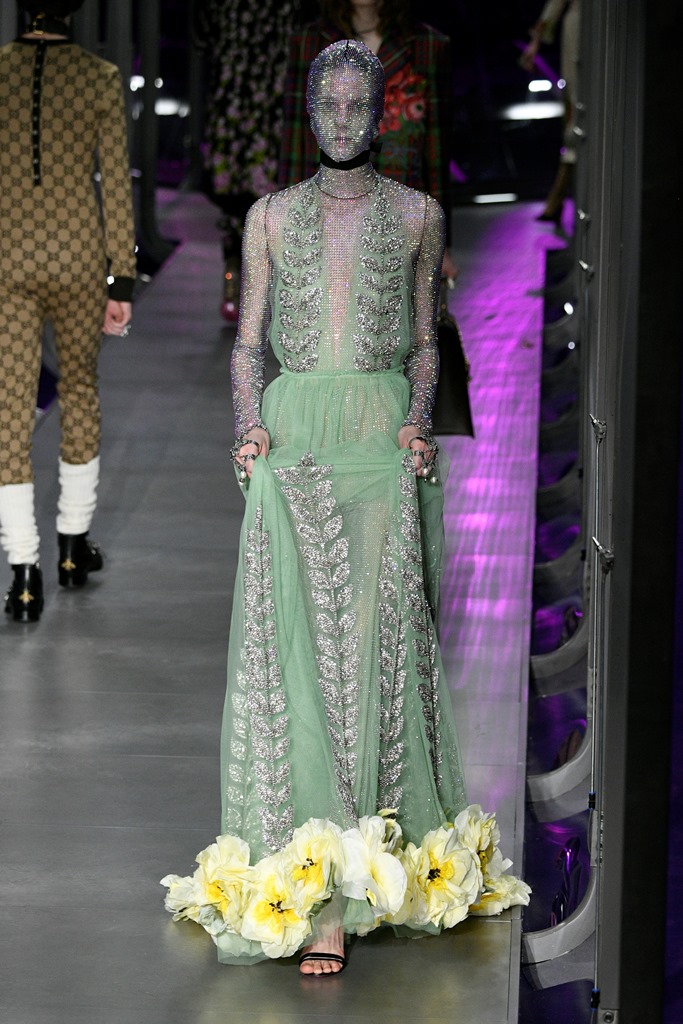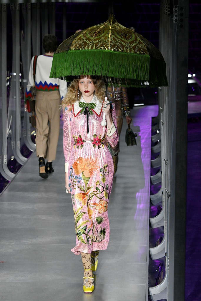 Alessandro Michele presented his latest Gucci collection yesterday to kick off Milan Fashion Week combining both the women and men’s Fall/Winter 2018 pieces. Many of the looks were outrageous. All of them, however, are exquisite. And if you strip away some of the more theatrical runway elements, most of them are totally wearable, especially for celebrities, and especially for major events. Like this gown – look at it, it’s gorgeous:
