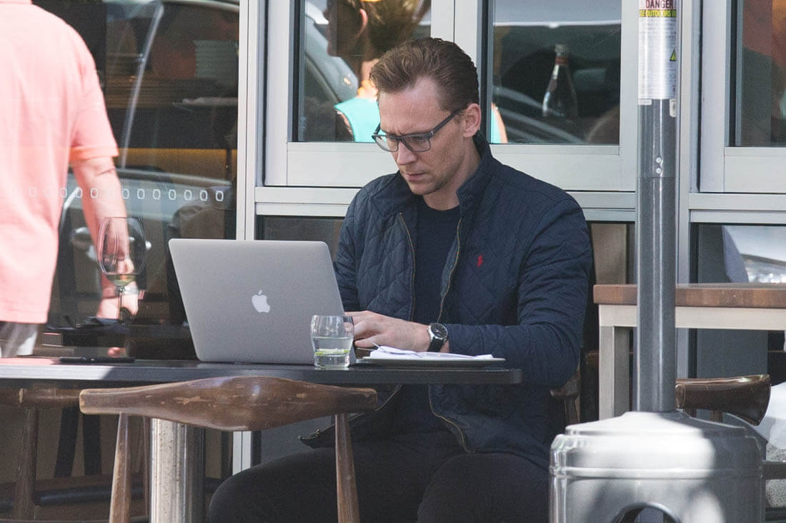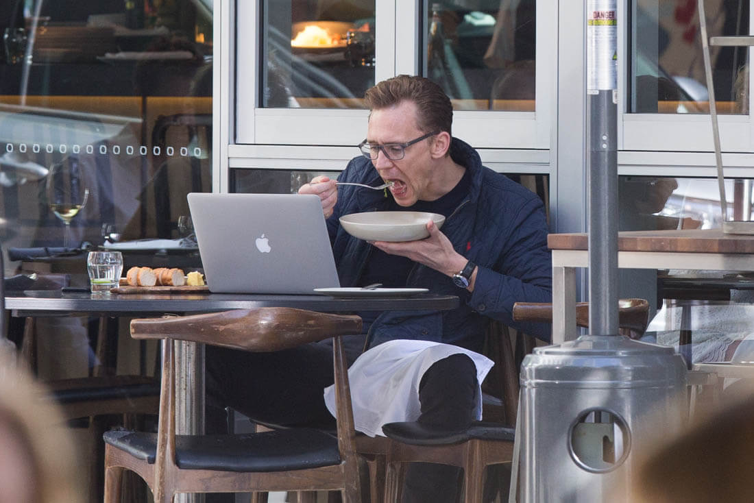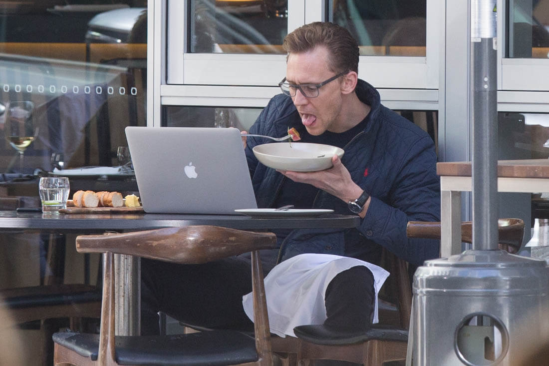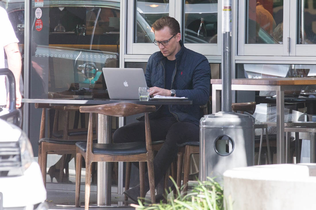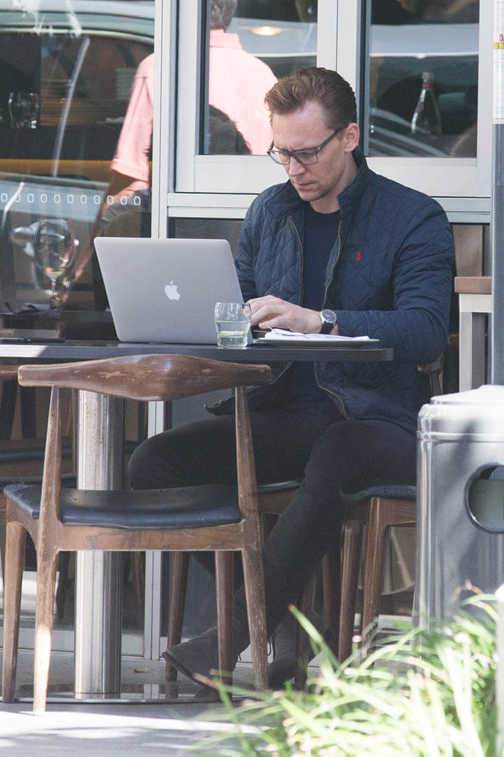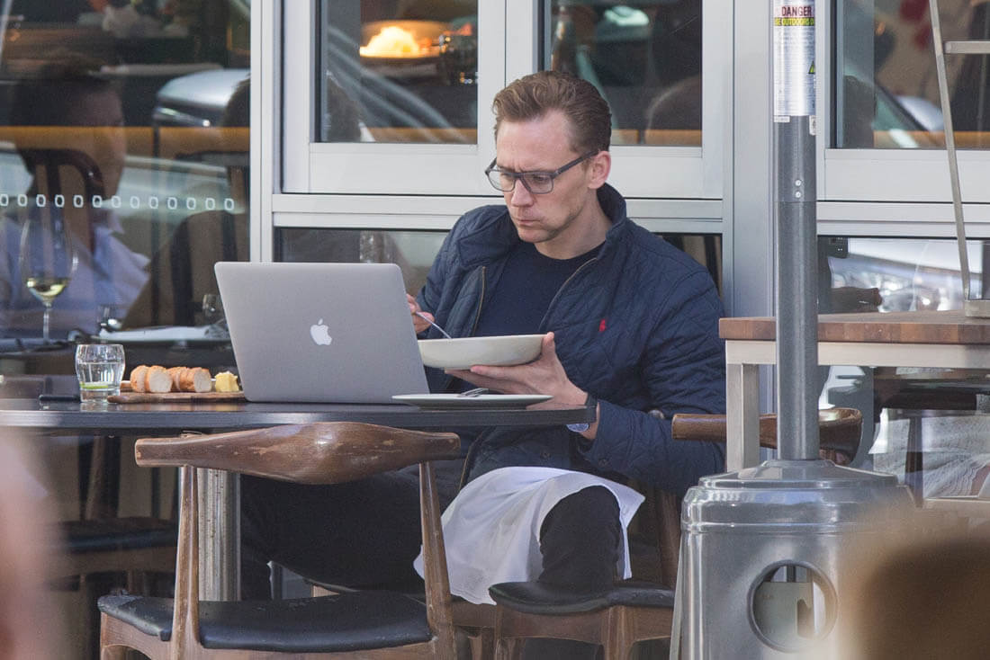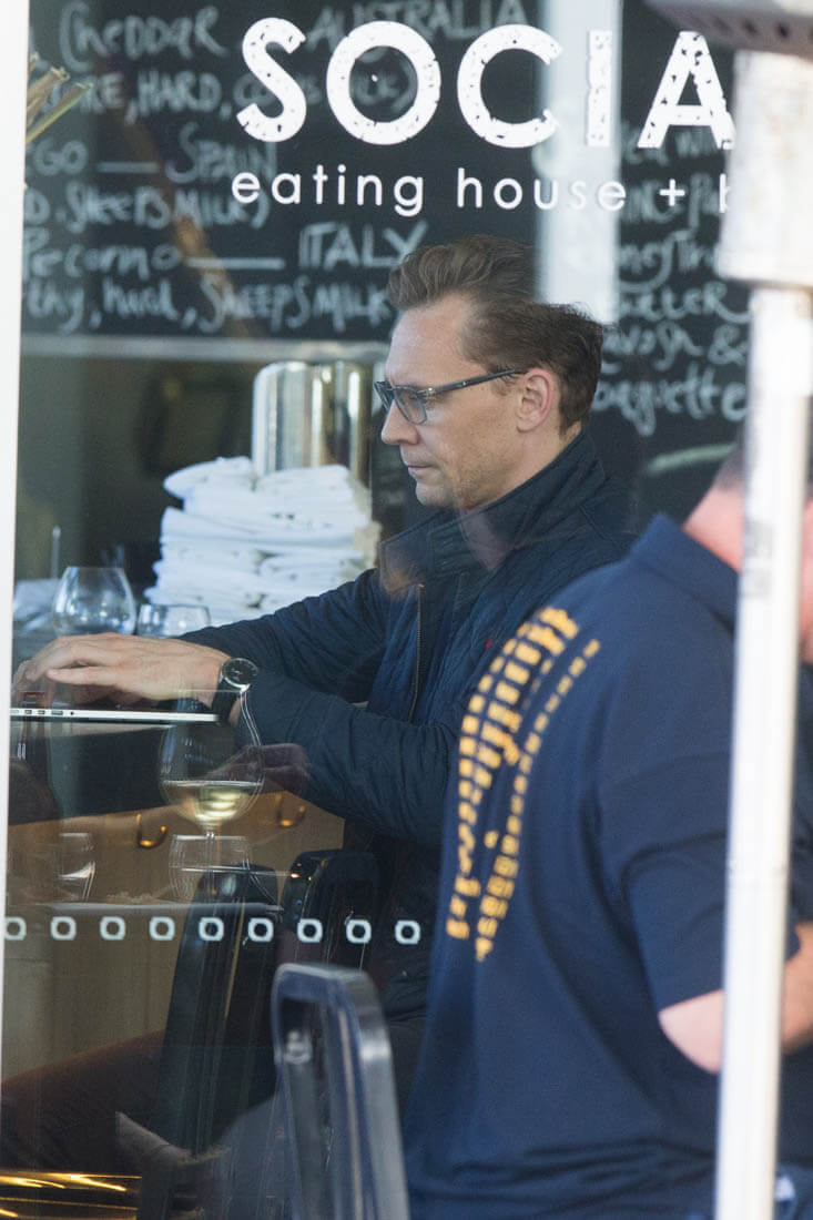 Tom Hiddleston in Australia this weekend having lunch at his favourite café, The Social. That’s a good name, but I’m biased. Wish we could get a better shot of what he’s eating. Is it a salad? I love eating alone. With my laptop or a good book, it’s the best. I’m heading out of town on Friday and I can’t wait to eat alone that night after the flight. I’ve already planned the book I’m bringing to dinner (The Mothers by Brit Bennett). It’s going to be at least a two hour meal, all by myself, so exciting. As you can see, Tom seems to be enjoying a similar experience. Ask him what he’s reading on his laptop and it would probably be something super wordy and intellectual. Or memorising sonnets. Wouldn’t it be great though if he admitted to googling himself on Saturday mornings?