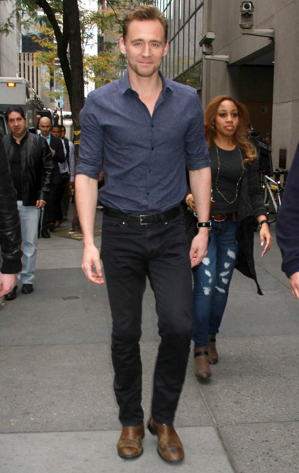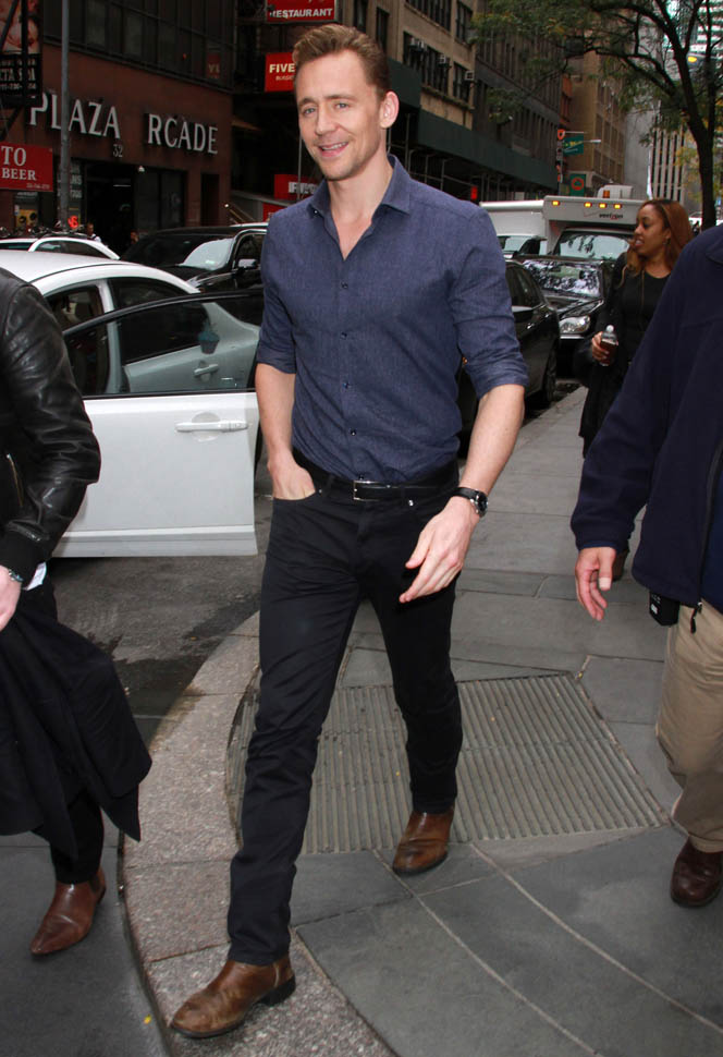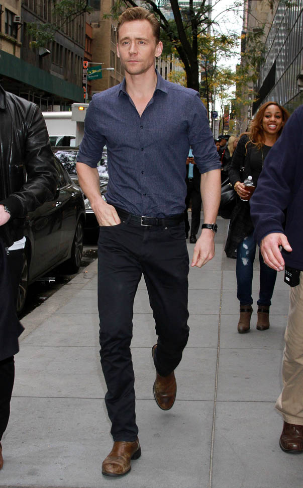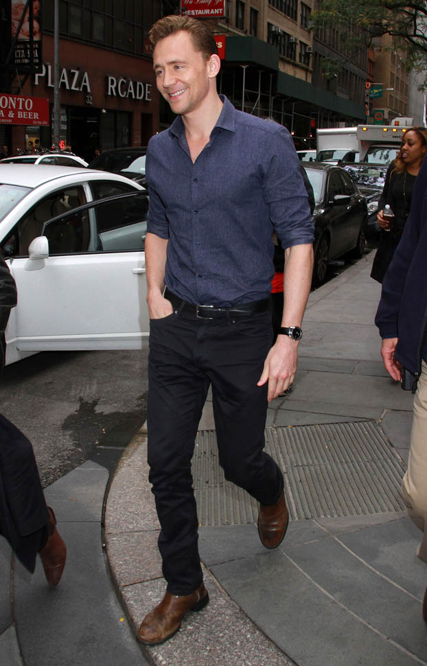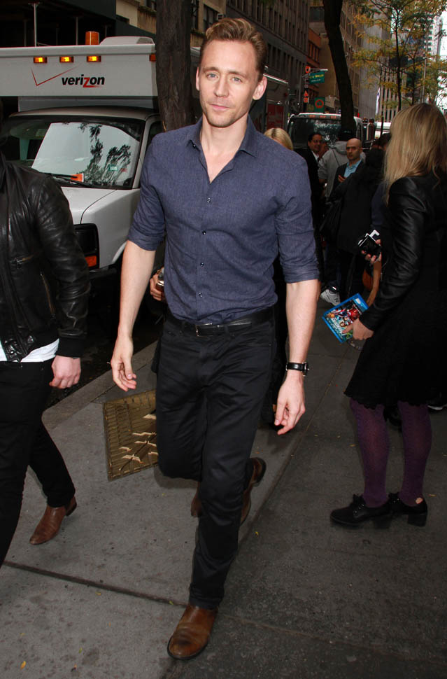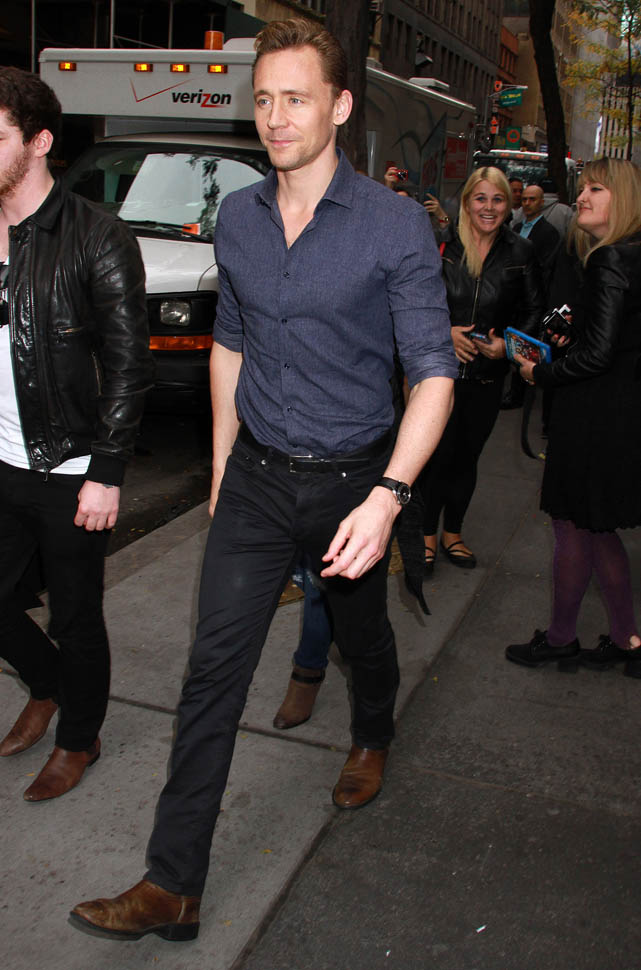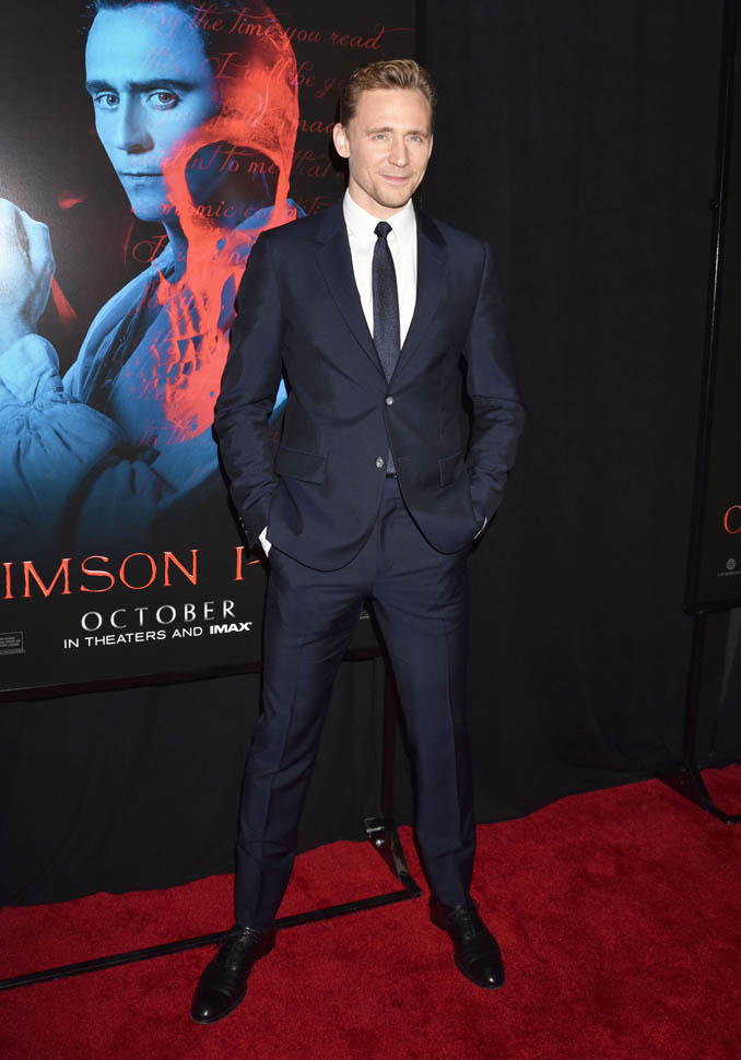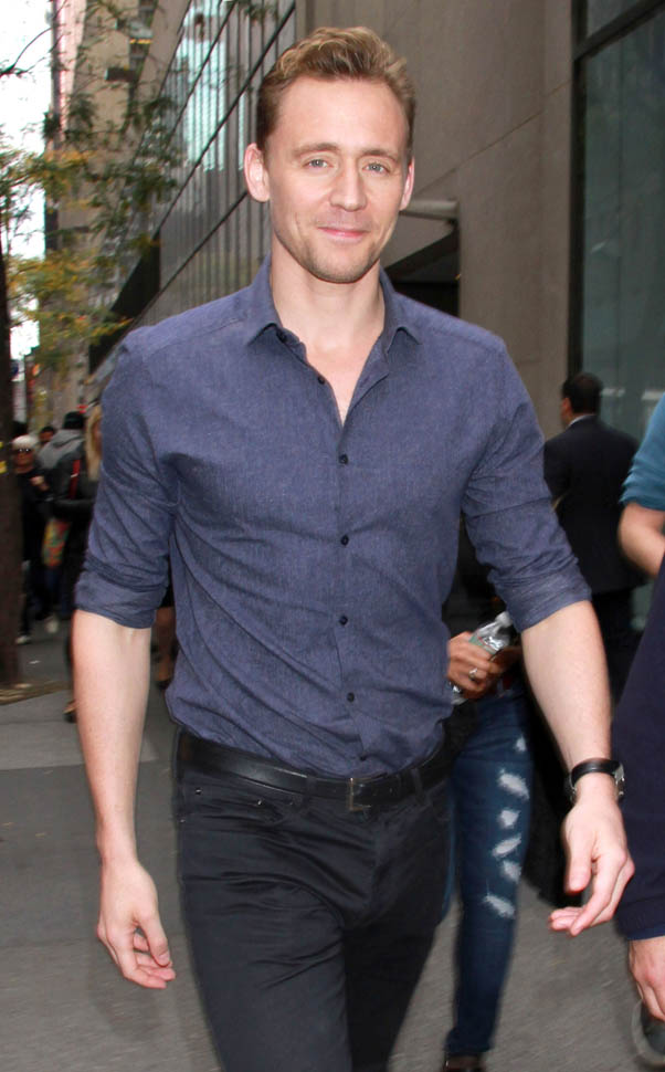 This is what I wanted to say about Tom: the first time I interviewed him (for The Avengers) he was in street clothes: dark jeans, black leather jacket. Hot. The second time I interviewed him, recently for TIFF, he was also in street clothes. I think I like him better in street clothes over a suit or tux, even though he has that lovely British accent and wears dress clothes well. Look at him here, just walking around in New York. He has a great body and a good gait. You can see it better when he’s casual. Compare that to him on the carpet last night at the Crimson Peak premiere. Right? You prefer the jeans, don’t you?
