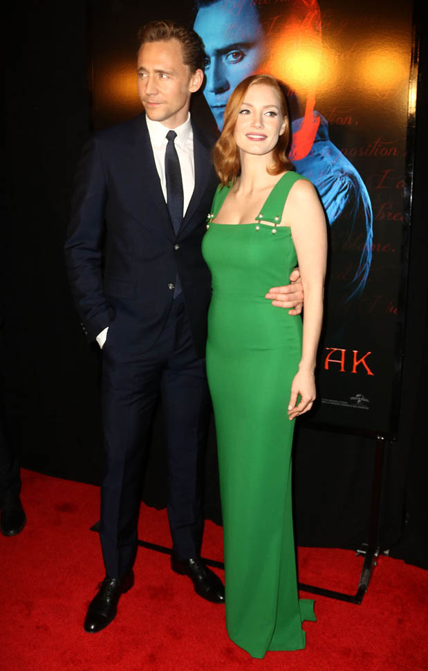 Tom Hiddleston, along with Jessica Chastain and Mia Wasikowska, have been promoting Crimson Peak, opening wide this weekend. You know what’s/who’s missing from that equation?