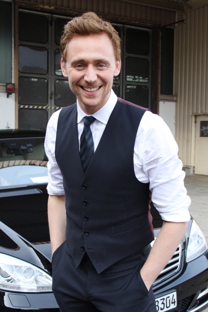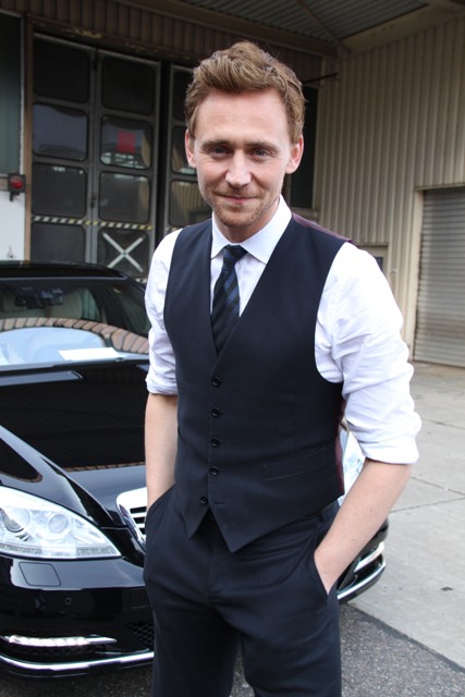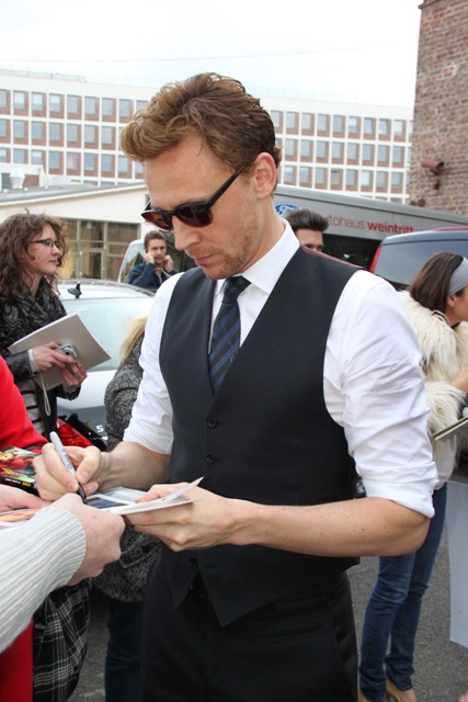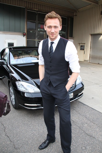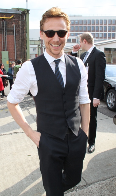 As I noted yesterday - click here for a refresher - Tom Hiddleston is better without a suit jacket, in just a waistcoat with his sleeves rolled up. He was pictured in Rome that way. And here he is again, in Cologne, Germany yesterday, the same, and good. Very, very good.