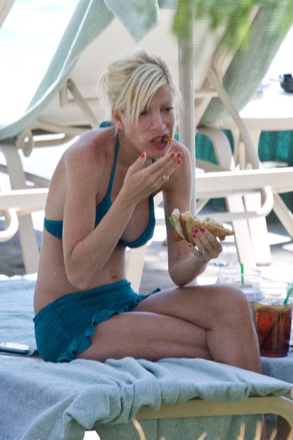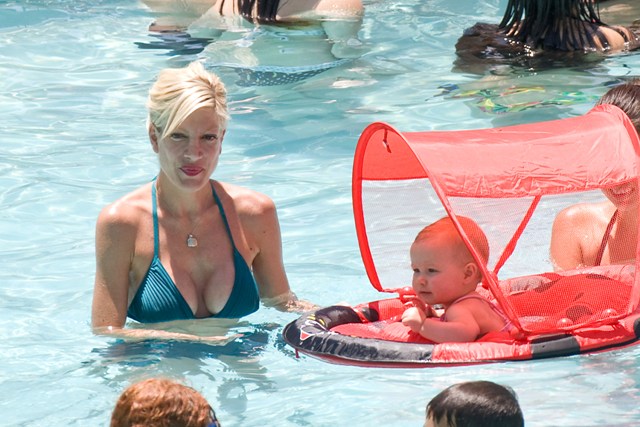 And here’s Tori Spelling, enjoying Memorial Day in Palm Springs with her kids and that goldigger who married her, showing off her deformed f-cking tits.