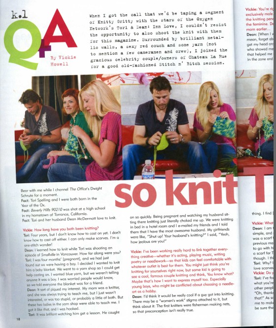 “I learned how to knit when Tori was shooting an episode of Smallville in Vancouver…these two ladies in the yarn shop were able to teach me. I got it like that and I was hooked.”