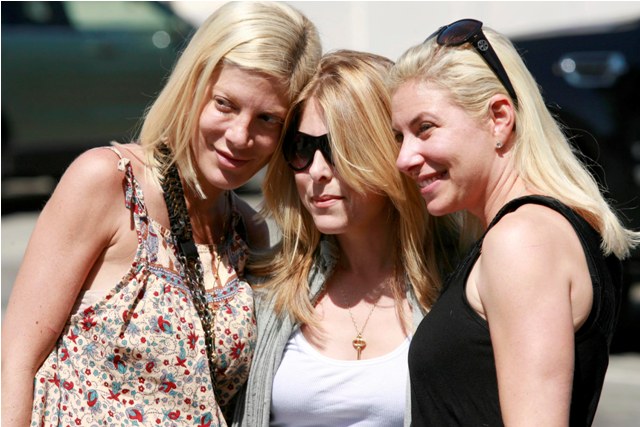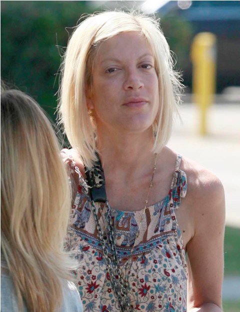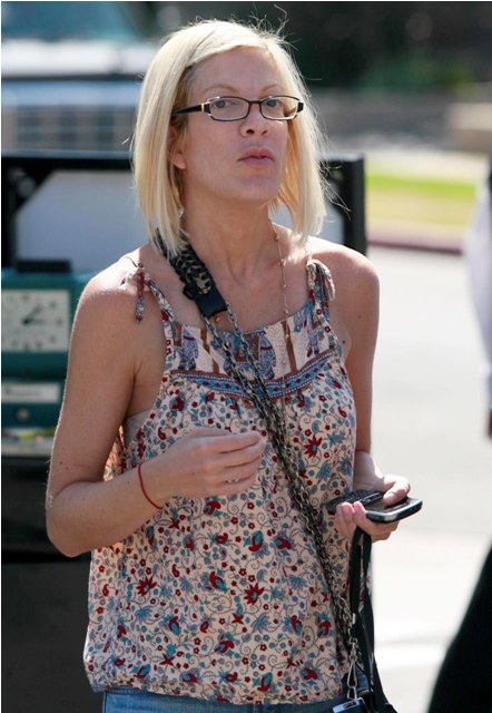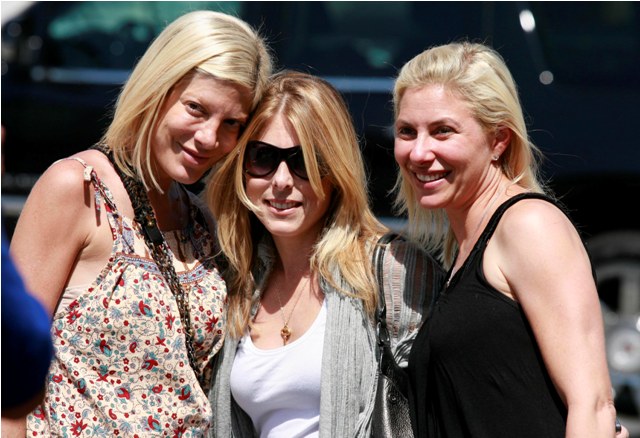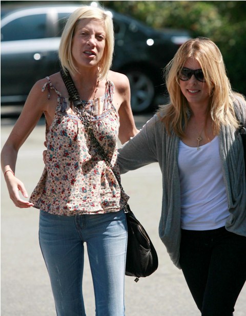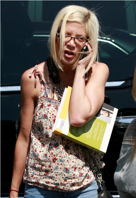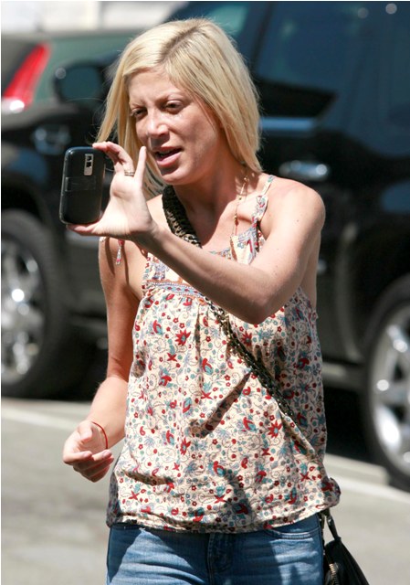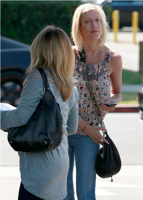 And they all went shopping together yesterday. And while the paps were around they decided to take iPhone shots of each other. Those are her friends. Here’s Tori Spelling out in Brentwood yesterday, skinny as sh-t and makeup free, spending time with her girls. Or whoever they hired to be her girls.