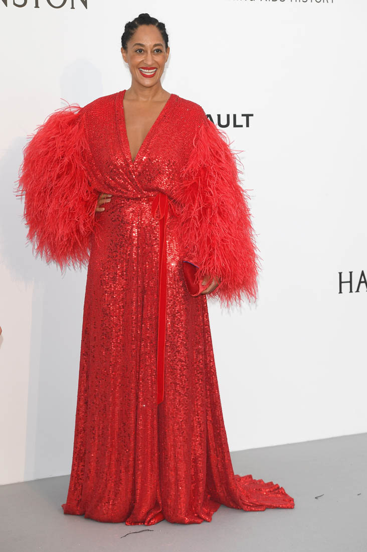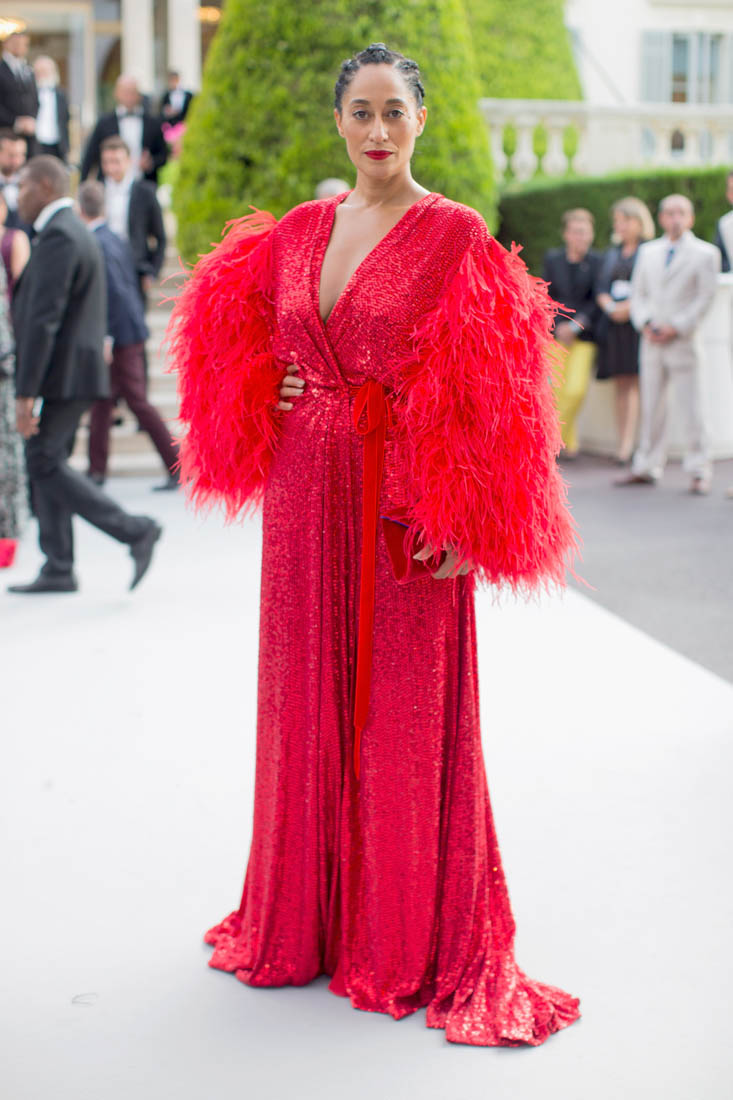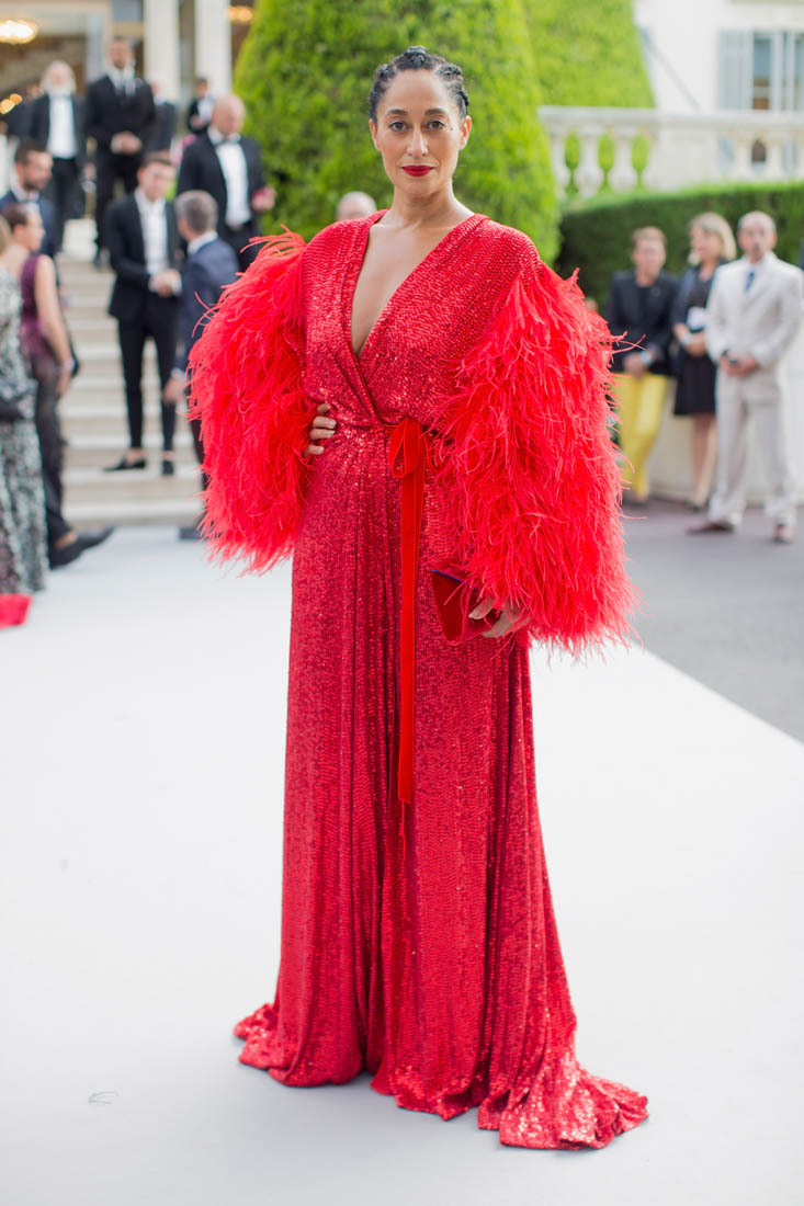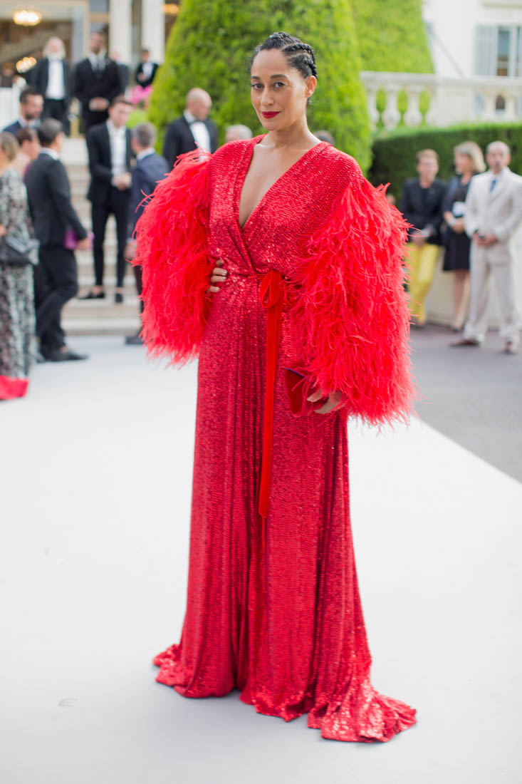 Tracee Ellis Ross. It was her first time at the Cannes amfAR gala last night. And Diana Ross was performing. So this red dress, with the feathered arms, it’s an homage to her ma.