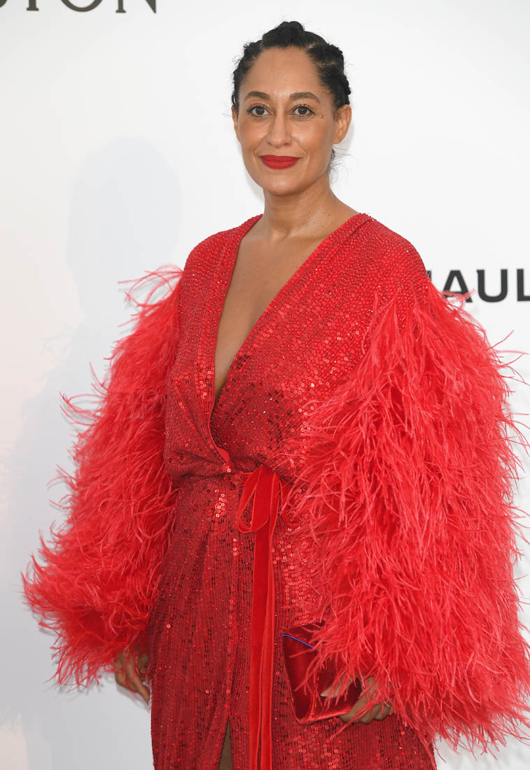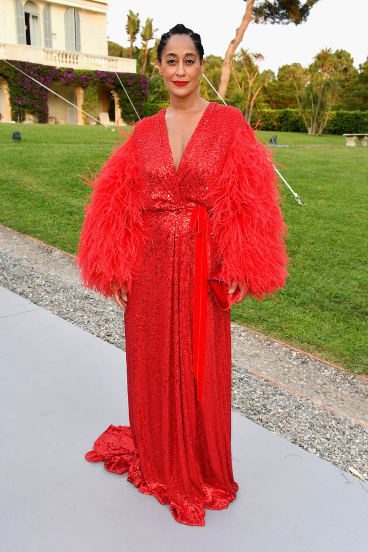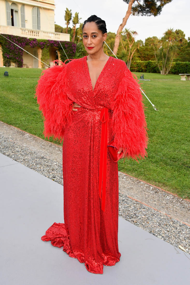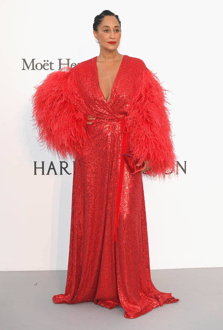 Tracee Ellis Ross. It was her first time at the Cannes amfAR gala last night. And Diana Ross was performing. So this red dress, with the feathered arms, it’s an homage to her ma.