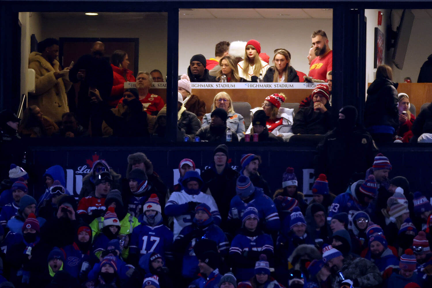 Jason Kelce carried this young Bills fan to say hi to Taylor Swift. Man of the people.