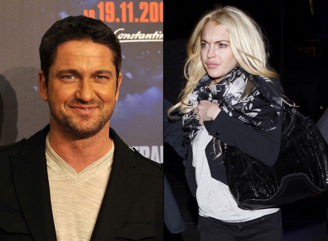 According to the UK tabloids which are mostly full of sh-t, Gerry Butler sprayed his spittle this weekend all over Lindsay Lohan.