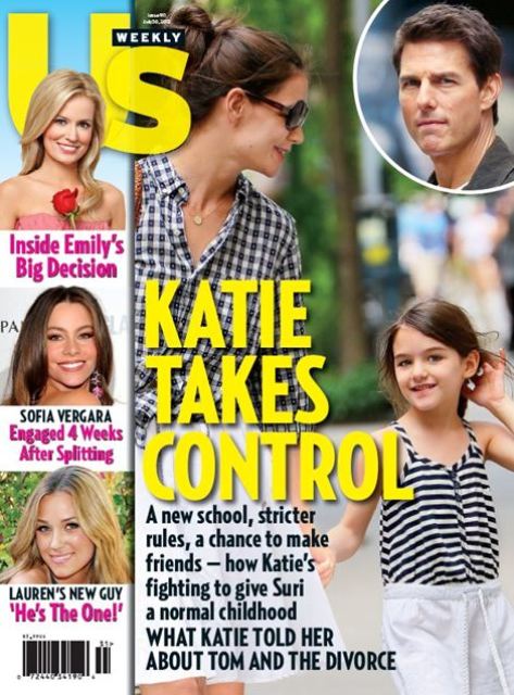 While PEOPLE’s cover this week features Tom Cruise and his sad eyes - click here or see below for that article from earlier today - US Weekly’s focus is on our new superhero, Courage Mom, Katie Holmes. Very smart. The cover hints at Katie’s parenting decisions, appealing directly to the MiniVan Majority, and the pages inside provide details about how Katie is determined to raise Suri properly in an attempt to mitigate the influence that life with Tom Cruise has had on her daughter’s life and life approach.