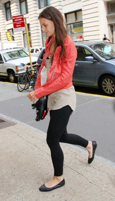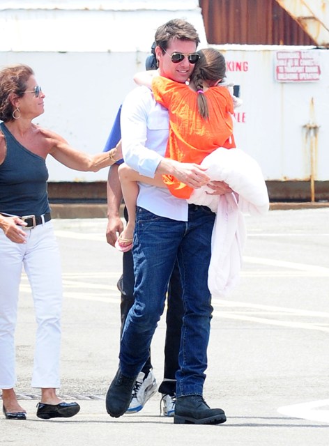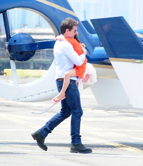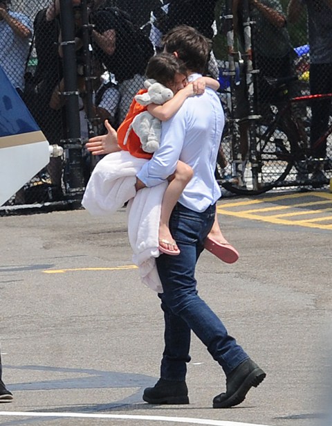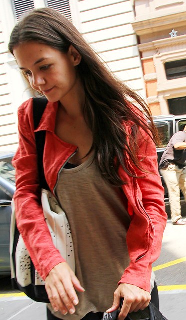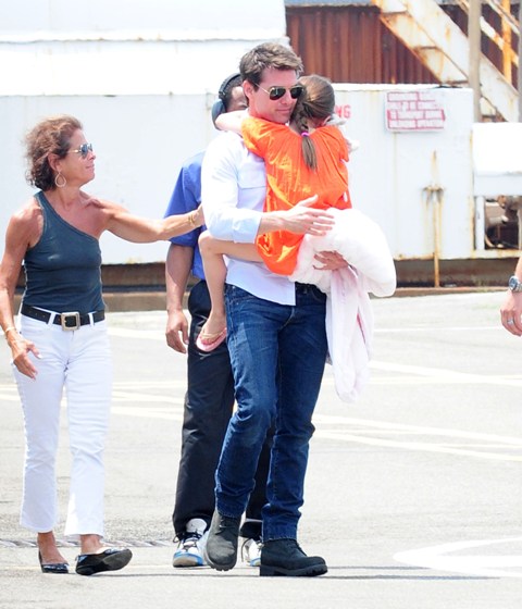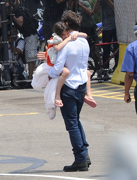 Here’s Katie in New York today while Tom took Suri up in a helicopter. Many of you have been asking why Suri is always carried and never seems to walk. Katie’s now starting to let her walk a little, for the photo opportunity, to make sure you see the difference between her before and after the divorce. Still, when you’re surrounded by all those photographers, maybe it’s just quicker to pick the kid up and get her inside. Think about how much longer it would take to get down a block if you let a 6 year old do it herself while the paps are flashing away. It would seem like a red carpet.
