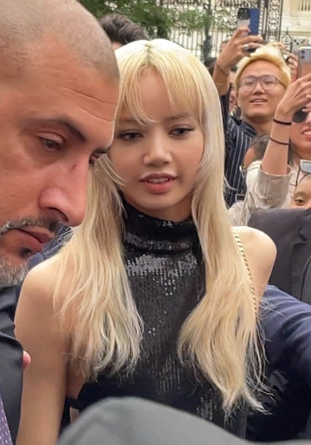 As for the fashion, Tae and Lisa both wore sequins up top with a high collar. Lisa wore her sequins over a pair of shorts and boots with an exposed bra and blonde extensions: