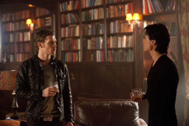 Klaus shows up to have a drink with Damon. They discuss how younger siblings are annoying, and YES THIS I BUY. Anyway, neither of them believes the other re: the mystery whereabouts of Stefan or Rebecca.