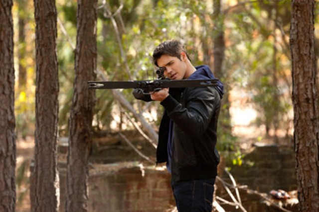 Tyler and Jeremy are in the woods, shooting with a crossbow, and we realize that in 2012, Dick Lockwood has returned. That’s not a character you’ve missed, that’s Tyler being a pain in the ass. Anyway, he brag-asses that he’s a hybrid, and so Jeremy should try to shoot him. When Jeremy does this incredibly ill-advised thing, Tyler catches the arrow.