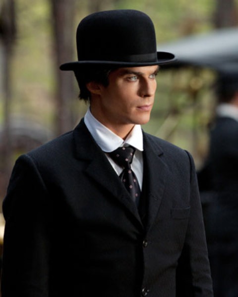Damon arrives IN A BOWLER, and the two haven’t seen each other in 50 years. They’re fighting, again, some more. Damon’s pouty that he’s a vampire, and Stefan looks like he miiiight be sorry about that. So they go to get a drink. All of this is happening in front of “Myrtle Hornblatt”’s gravestone, in case you wondered.