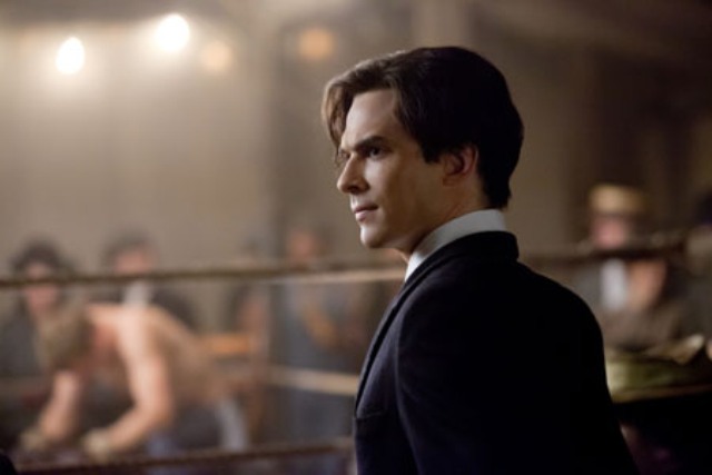 So old-timey Damon and Stefan go into a speakeasy-style tent where a lady is knocking dudes out in a ring, and Stefan offers to teach Damon to survive without human blood, but Damon is all righteous (except for the lusting over Sage). For those who find his hair concerning, it’s all flopping over his forehead.